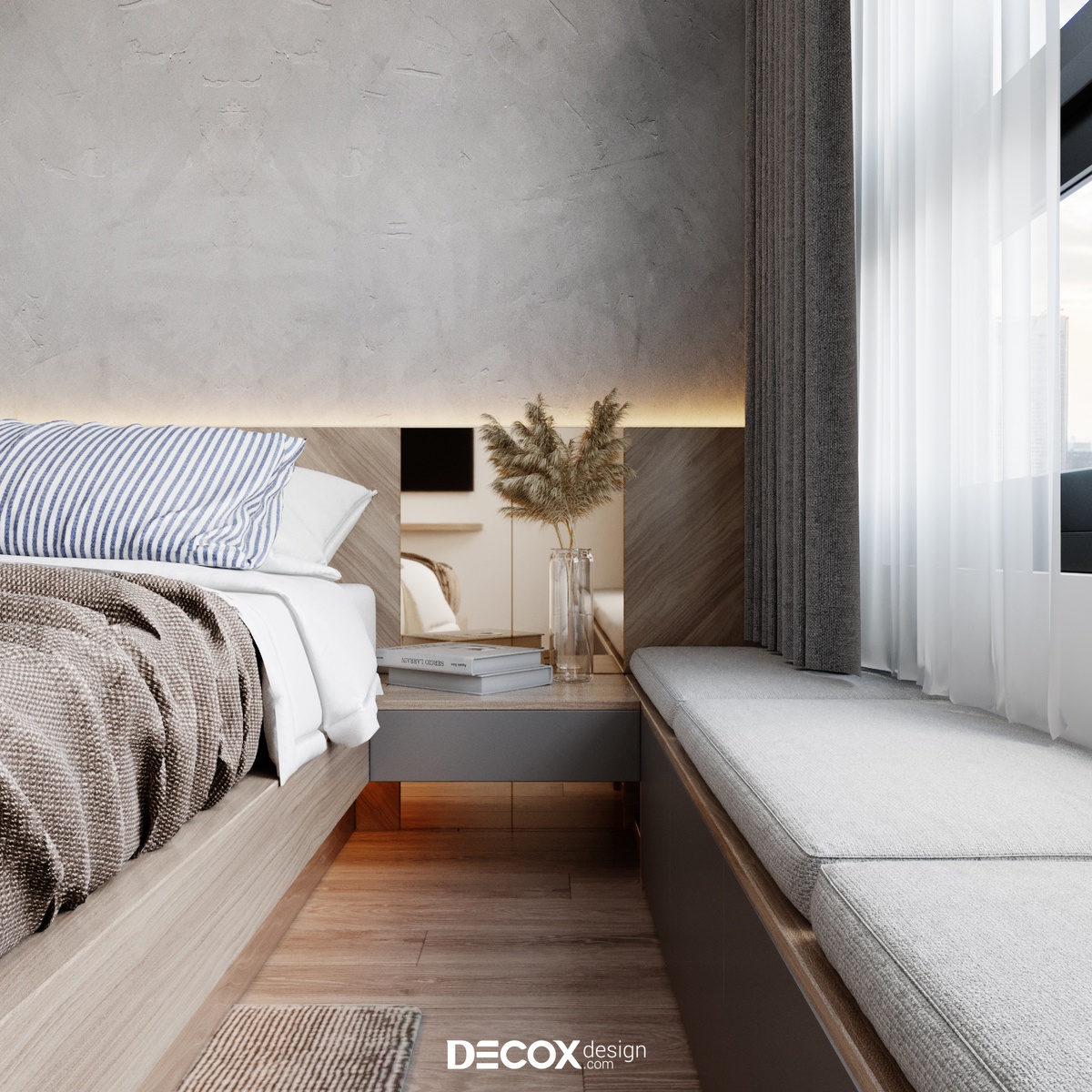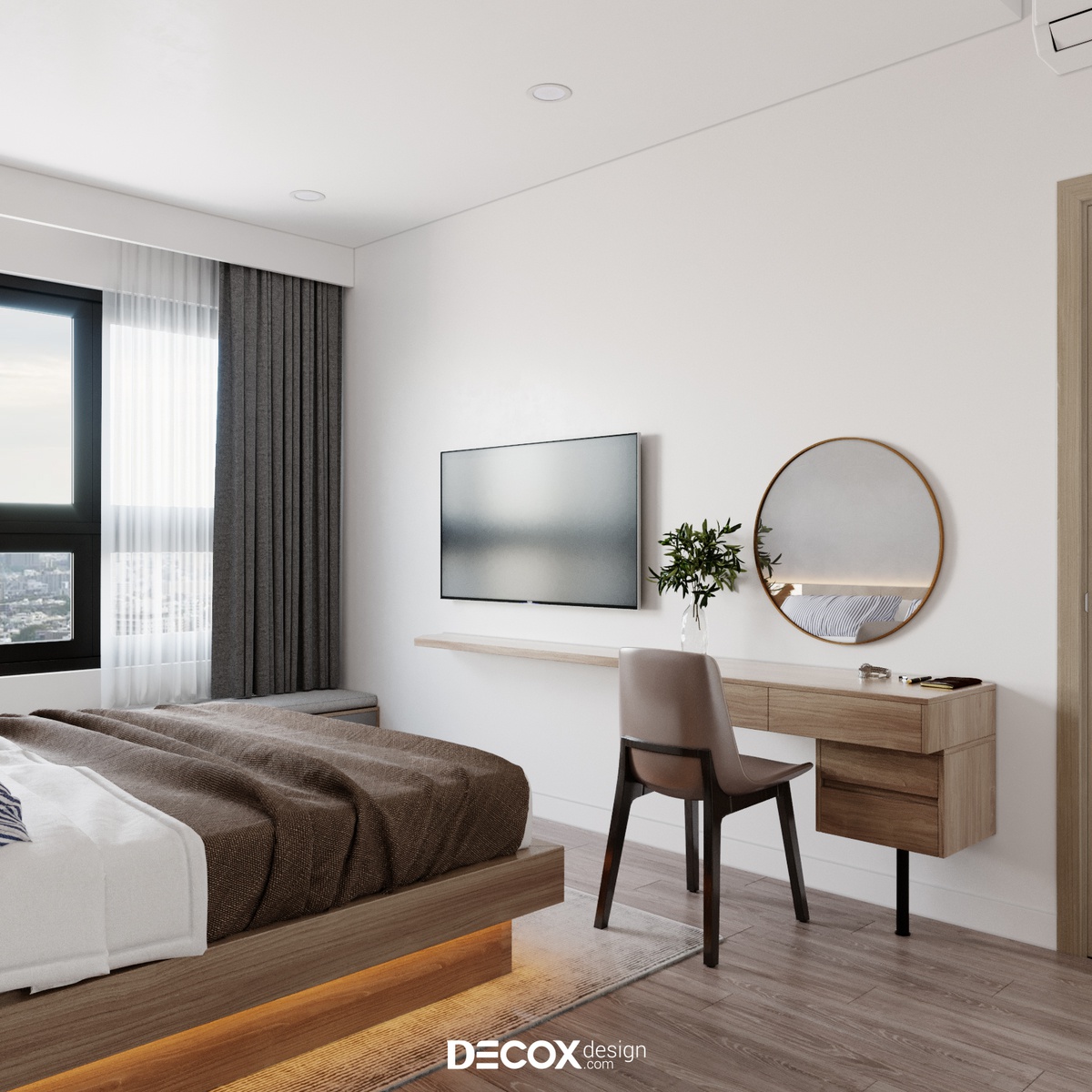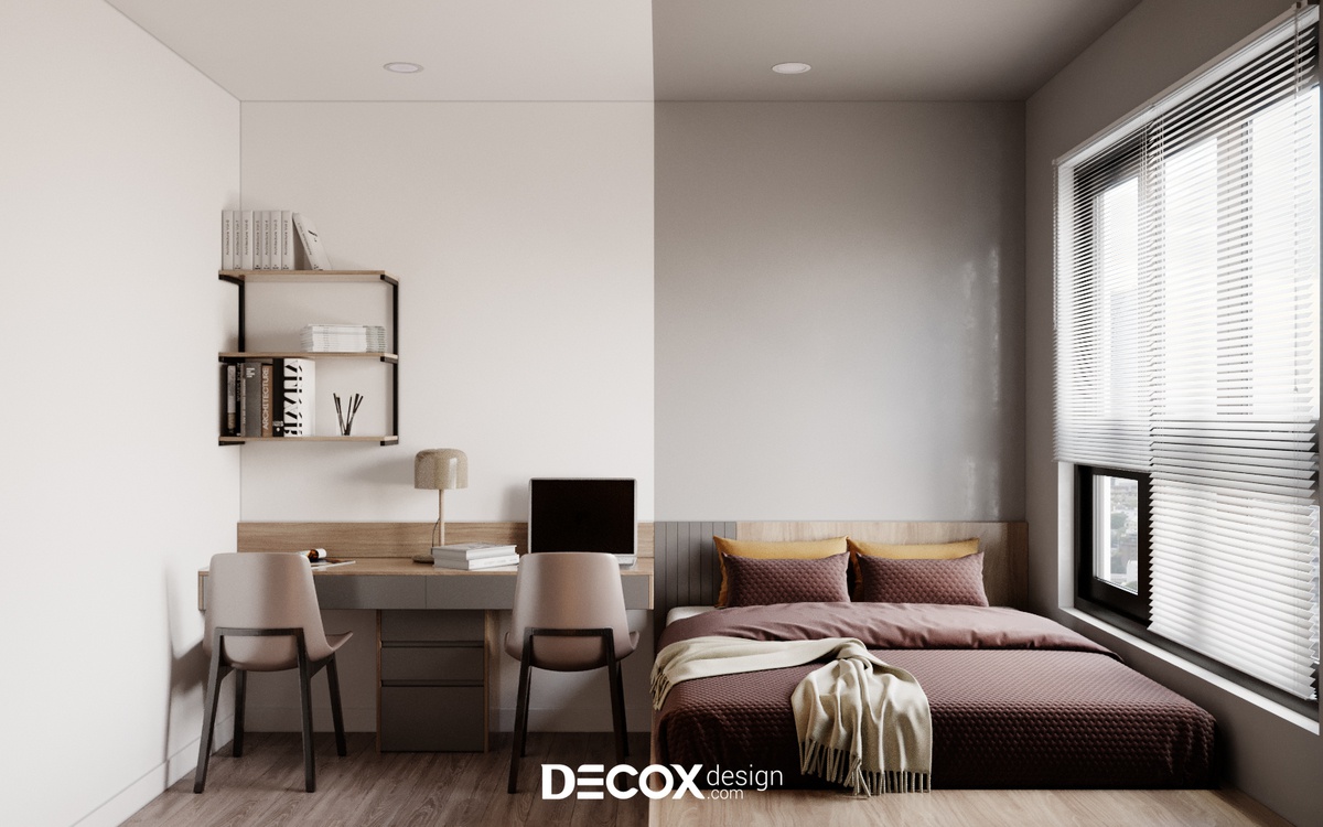 Để không gian dành cho việc nghỉ ngơi không bị chi phối bởi những việc khác cũng như đảm bảo chất lượng giấc ngủ của gia chủ được trọn vẹn, KTS Decox Design đã ưu tiên thiết kế không gian phòng ngủ master theo hướng hiện đại, tối giản. Ngoài các nội thất cần thiết thì một khung cửa sổ rộng có thể ngắm nhìn thành phố và đón sáng là đủ cho khu vực này.