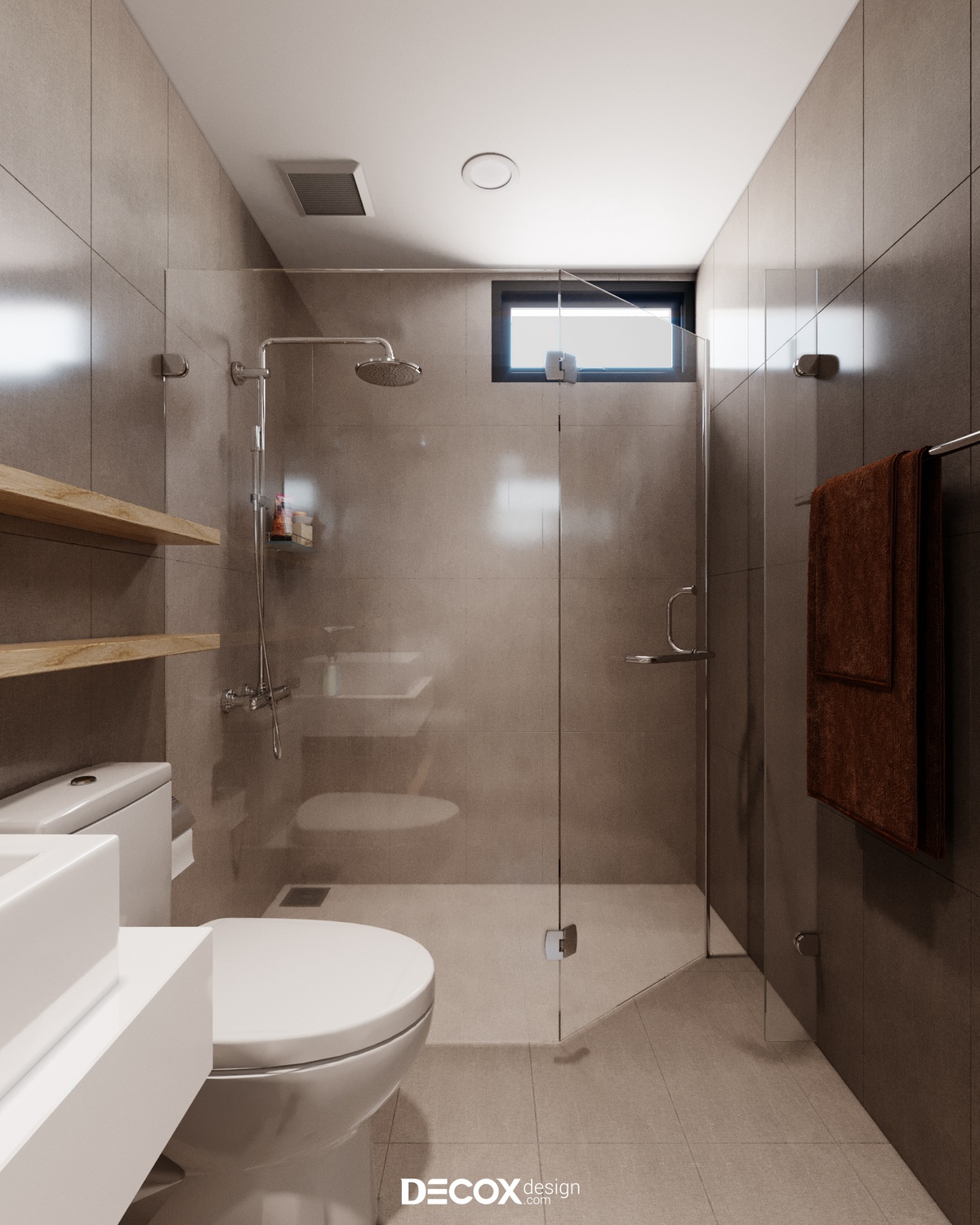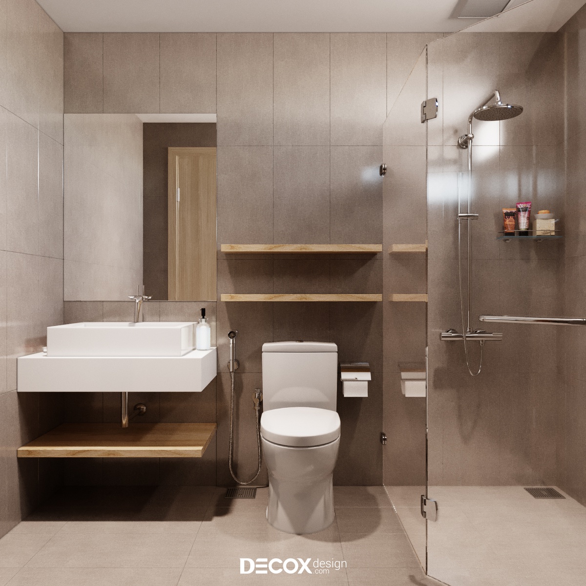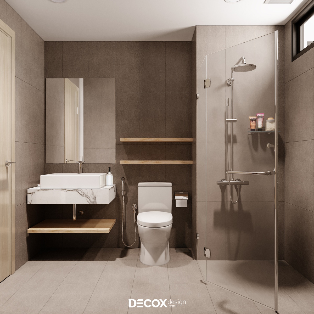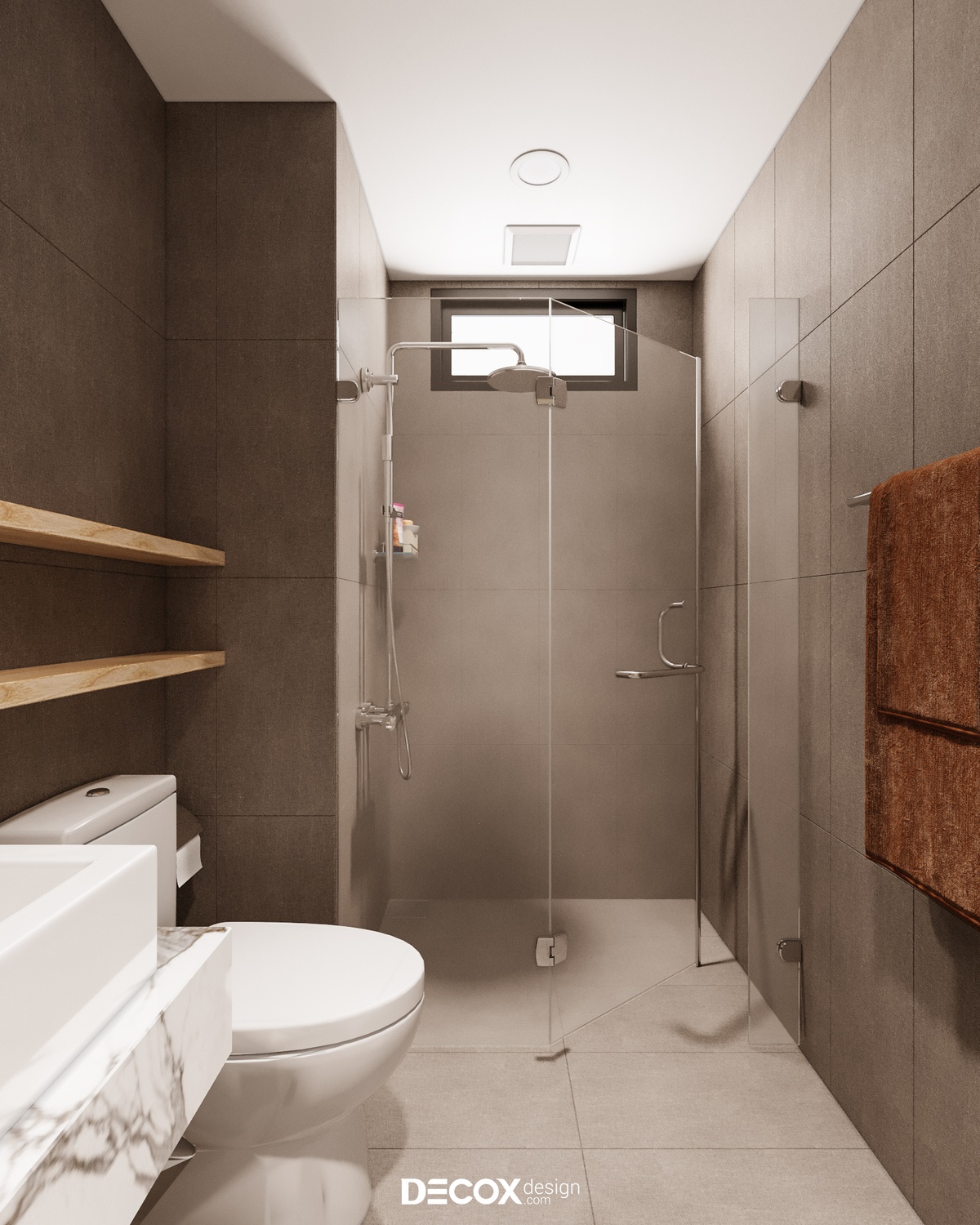 Thiết kế wc lấy gam màu nâu chủ đạo theo bố cục gọn gàng cùng phân khu khô - ướt rõ ràng giúp gia chủ có thể linh hoạt sử dụng.