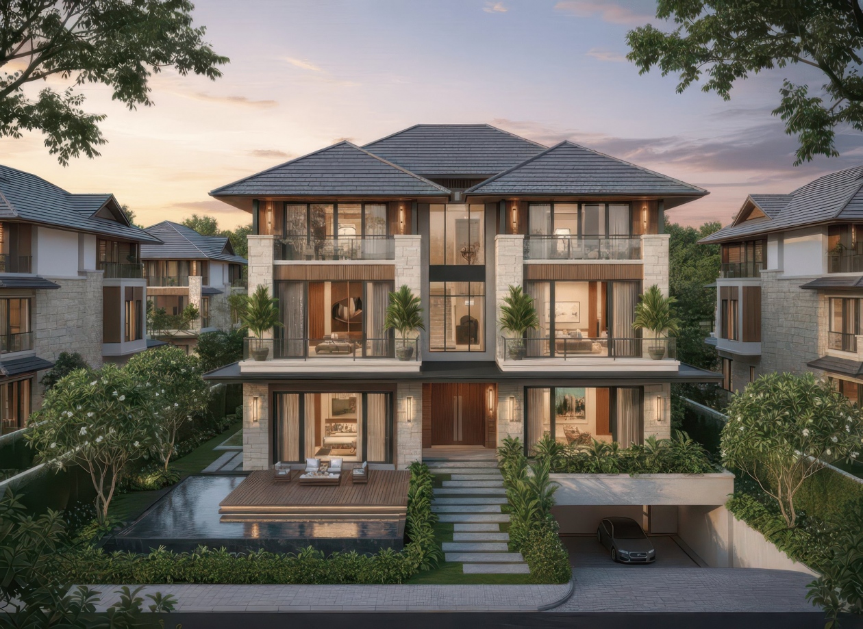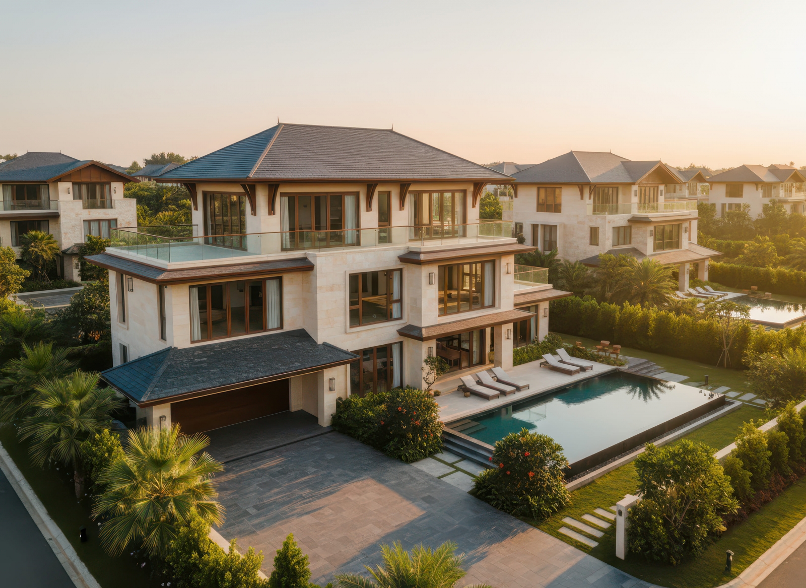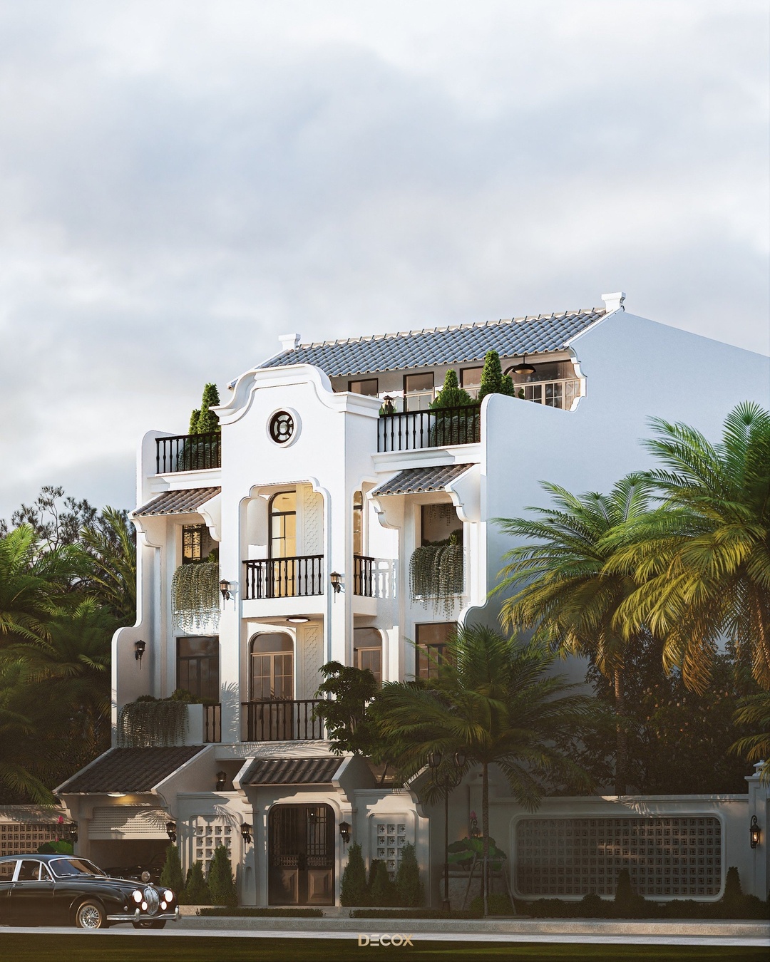 Nhà phố tân cổ điển mái Nhật 3 tầng nổi bật với mái dốc thấp kết hợp phào chỉ, cột trụ và chi tiết hoa văn tinh xảo, tạo nên vẻ sang trọng và thanh lịch đặc trưng của tân cổ điển. Kiến trúc chú trọng tỷ lệ cân đối giữa các tầng, hệ thống cửa sổ, ban công và mặt tiền, mang đến sự hài hòa và cân bằng thẩm mỹ. Màu sắc thường là tông trung tính kết hợp điểm nhấn vàng, trắng hoặc kem, cùng vật liệu cao cấp như đá, gạch và kính, giúp biệt thự vừa giữ được nét cổ điển tinh tế, vừa hiện đại và tiện nghi.