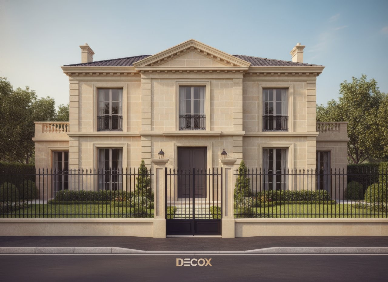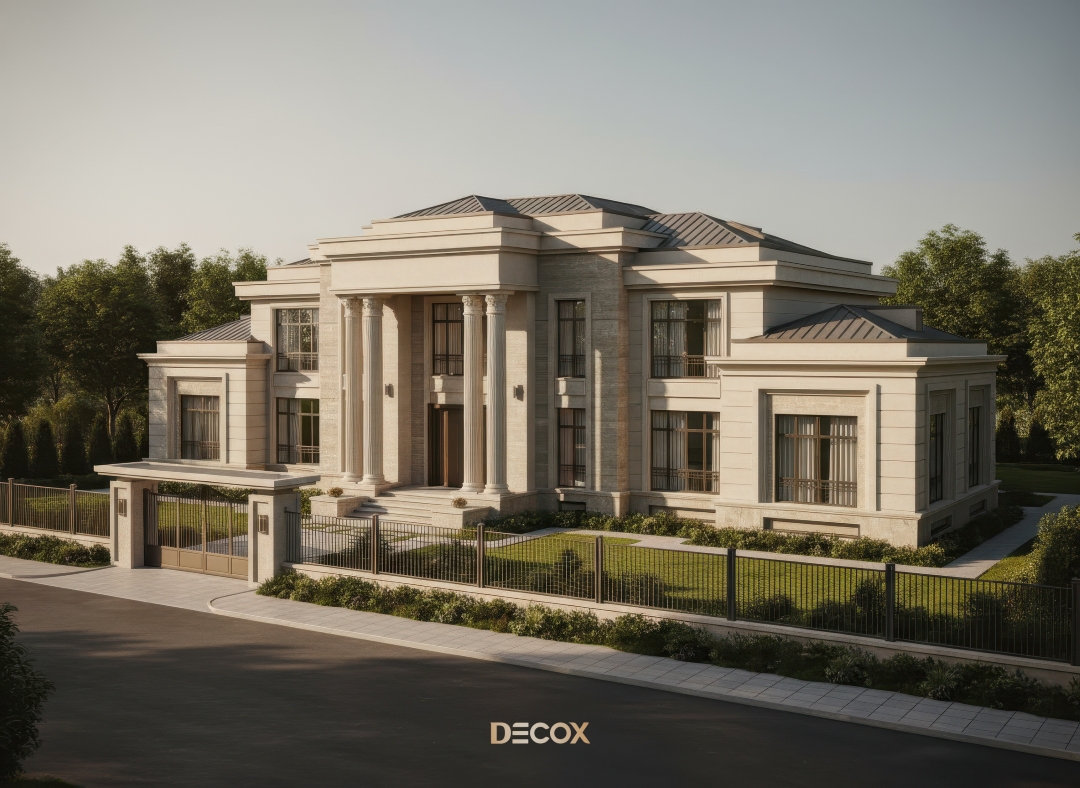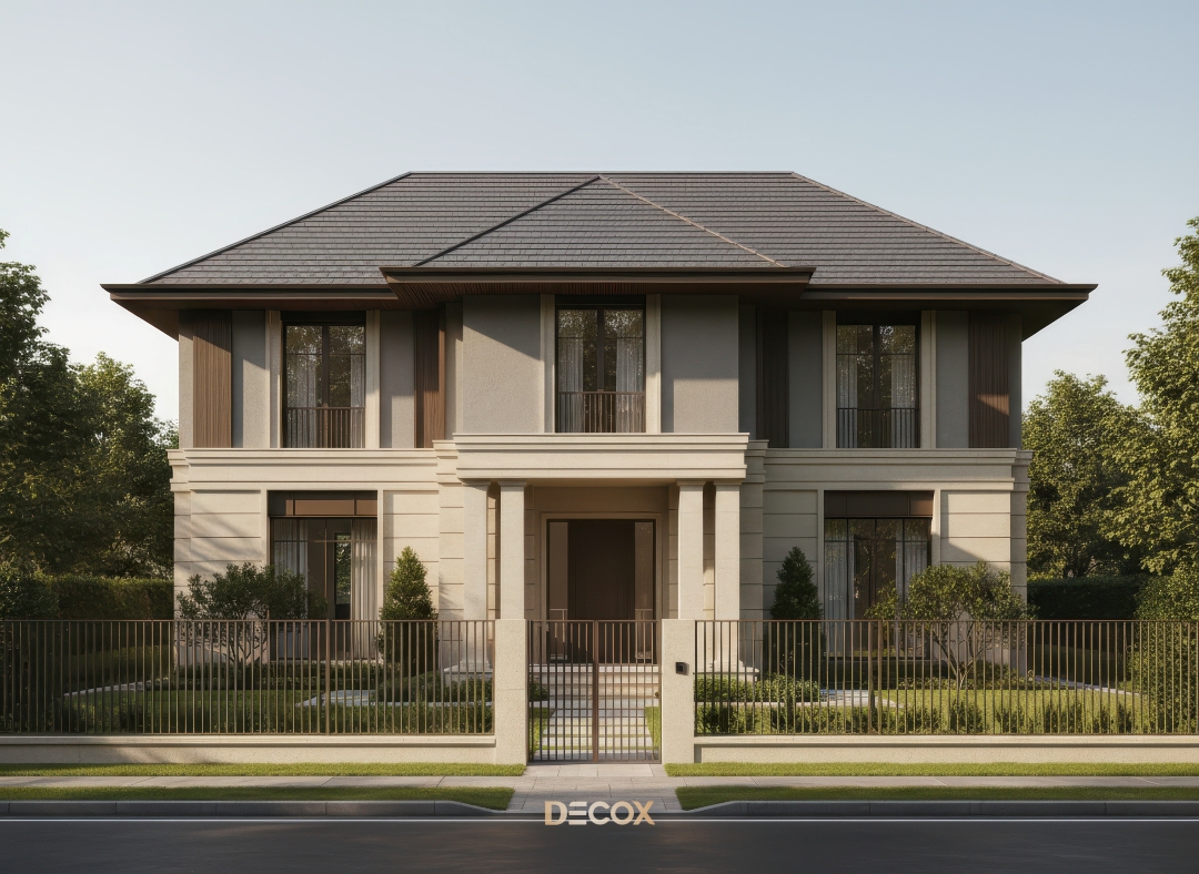 Đặc trưng cốt lõi của mẫu nhà biệt thự 2 tầng phong cách Tân cổ điển này nằm ở tính đối xứng tuyệt đối và "tỷ lệ vàng" trong hình khối. Mặt tiền thường gây ấn tượng mạnh mẽ bởi hệ thức cột Ionic hay Corinthian vững chãi tại sảnh chính kết hợp cùng lan can sắt mỹ thuật tạo nên vẻ đẹp sang trọng, bền bỉ với thời gian. Song hành cùng đó là những đường phào chỉ đắp nổi tinh tế chạy dọc tường và bao quanh khung cửa. Các chi tiết rườm rà được tiết chế, nhường chỗ cho vẻ đẹp thanh thoát của hệ mái Thái thanh thoát hoặc vẻ uy quyền của mái Mansard ốp đá phiến.