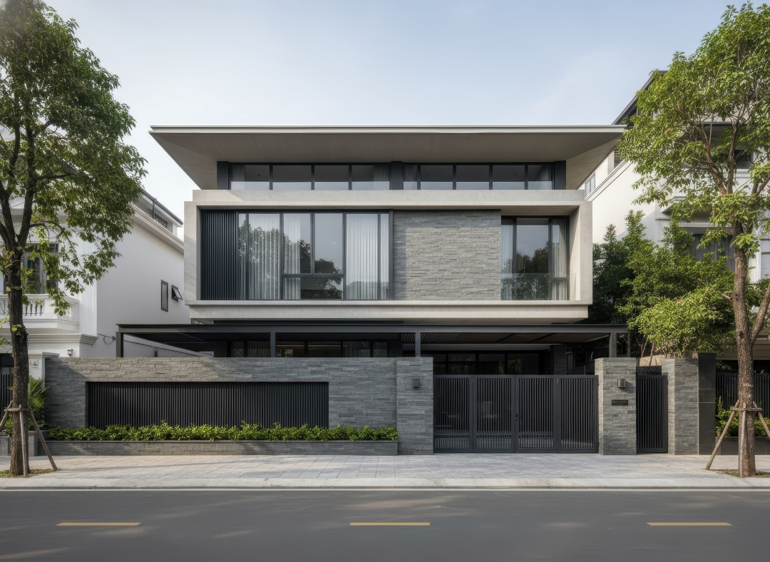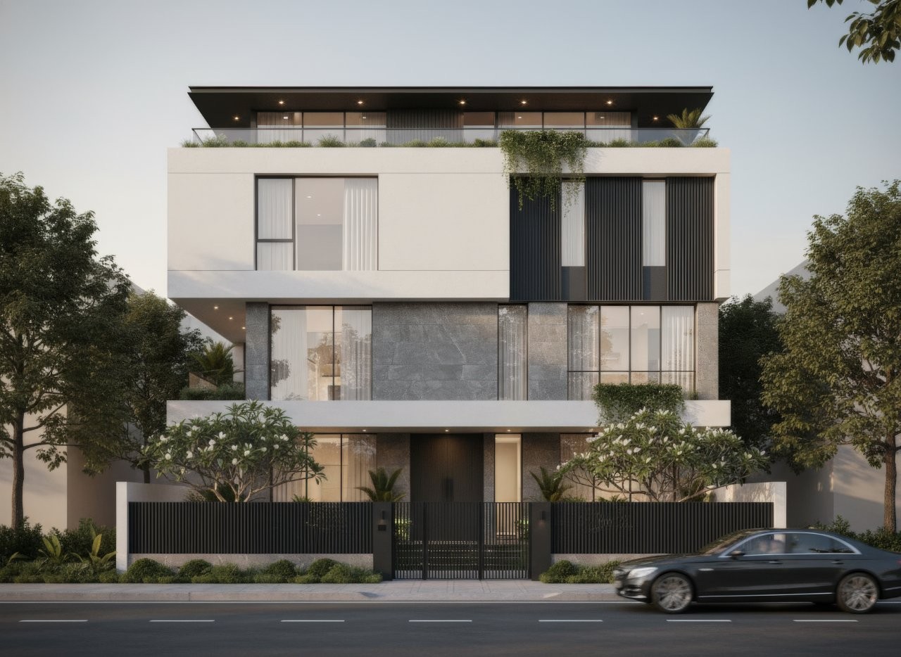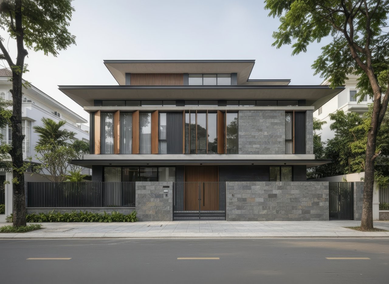 Hình khối kiến trúc cân đối, mặt tiền có chiều sâu: Những khoảng lùi của logia, mái hiên đua rộng hay các mảng tường ốp vật liệu tương phản tạo điều kiện cho ánh sáng và bóng đổ tương tác, biến mặt tiền ngôi nhà thành một bức tranh 3D sống động. Tỷ lệ chiều ngang, chiều cao và chiều sâu được cân chỉnh để công trình vừa bề thế, vững chãi, vừa giữ được sự thanh thoát cần thiết, khác biệt hẳn với cảm giác “cao tầng chật hẹp” của nhiều mẫu nhà ống truyền thống.