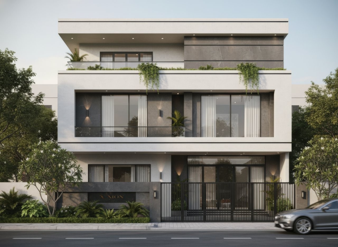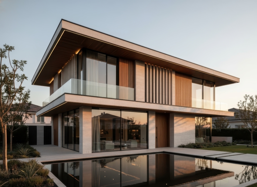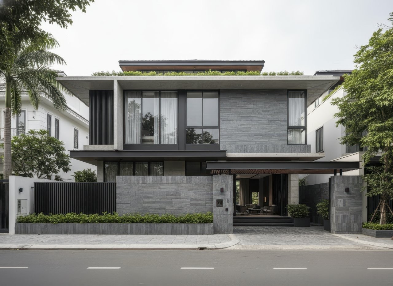 Hình khối kiến trúc cân đối, mặt tiền có chiều sâu: Những khoảng lùi của logia, mái hiên đua rộng hay các mảng tường ốp vật liệu tương phản tạo điều kiện cho ánh sáng và bóng đổ tương tác, biến mặt tiền ngôi nhà thành một bức tranh 3D sống động. Tỷ lệ chiều ngang, chiều cao và chiều sâu được cân chỉnh để công trình vừa bề thế, vững chãi, vừa giữ được sự thanh thoát cần thiết, khác biệt hẳn với cảm giác “cao tầng chật hẹp” của nhiều mẫu nhà ống truyền thống.