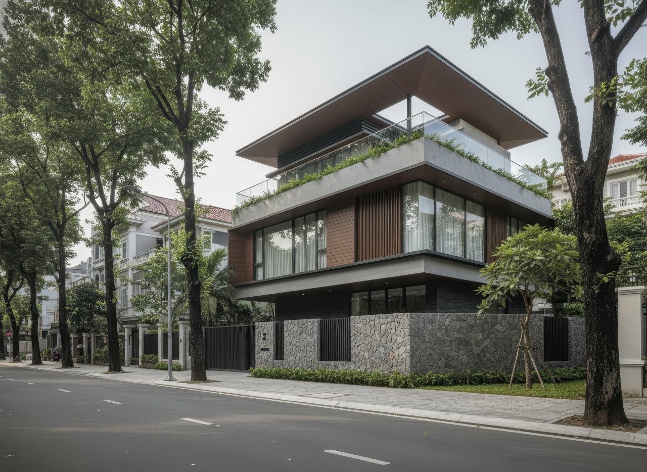 Phá vỡ quy tắc đối xứng truyền thống, mái lệch là bản tuyên ngôn đầy cá tính của kiến trúc hiện đại. Những khối mái vát chéo, cắt xẻ mạnh mẽ tạo nên hiệu ứng thị giác ấn tượng, giúp công trình hiện diện như một tác phẩm điêu khắc giữa không gian.