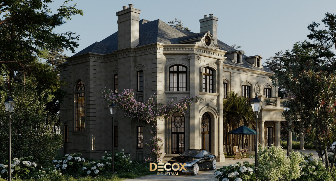 Hệ mái Mansard hình thang úp ngược phủ đá phiến màu sẫm mang đến vẻ đẹp vương giả, uy quyền tựa như những tòa lâu đài Pháp tráng lệ. Không chỉ dừng lại ở giá trị thẩm mỹ, mái Mansard còn là giải pháp kiến trúc thông minh giúp gia chủ khéo léo mở rộng thêm một tầng công năng (tầng tum/áp mái) để bố trí thêm phòng ngủ, phòng thờ hay không gian giải trí riêng tư. Đây là cách tuyệt vời để gia tăng tiện ích sử dụng cho gia đình đông thành viên mà vẫn giữ được tỷ lệ hình khối cân đối, hài hòa của một căn biệt thự 2 tầng.