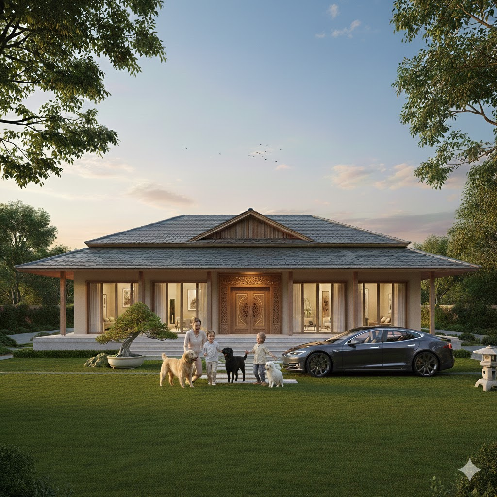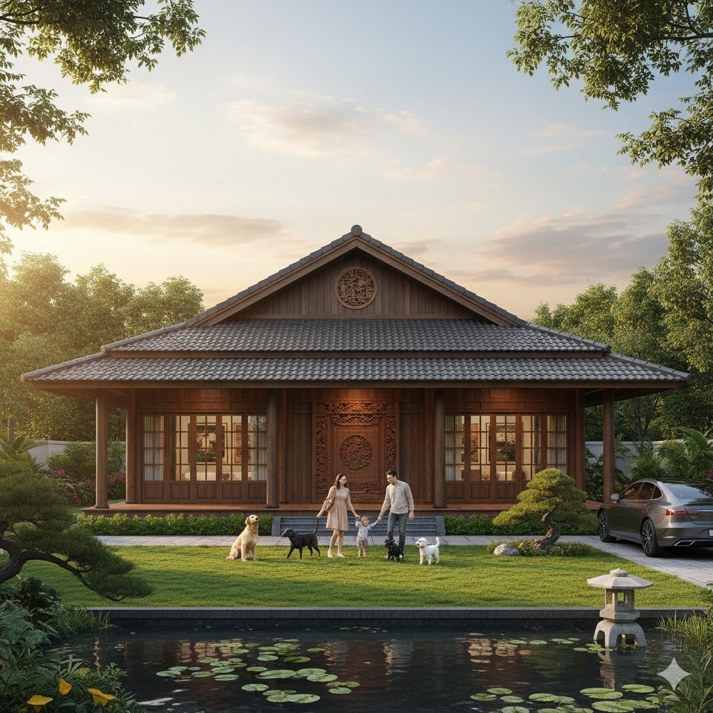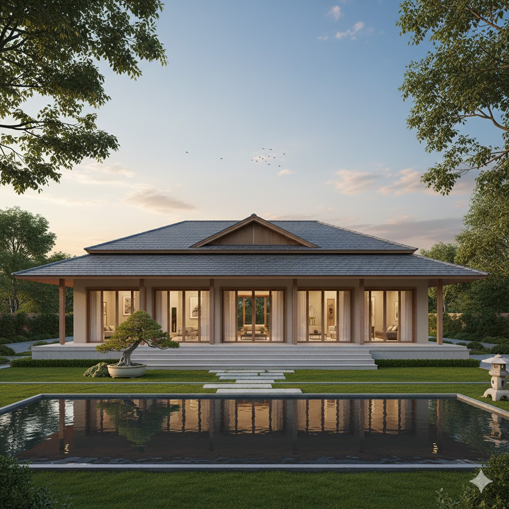 Nhà mái Nhật là kiểu kiến trúc lấy cảm hứng từ tinh thần tối giản và chuẩn mực của Nhật Bản, nổi bật với dáng mái dốc nhẹ, mở rộng cân đối về các phía, tạo cảm giác thanh thoát nhưng vững chãi. Không cao vút như nhà mái Thái hay phẳng tuyệt đối như nhà mái bằng hiện đại, mẫu nhà mái Nhật chinh phục bởi tỷ lệ hài hòa, khả năng chống nóng, thoát nước hiệu quả và vẻ đẹp bền vững theo thời gian. Khi kết hợp cùng bố cục không gian mở, hiên rộng và sân vườn bao quanh, nhà mái Nhật mang đến một phong cách sống tinh tế, sang trọng kín đáo và đậm chất an yên.