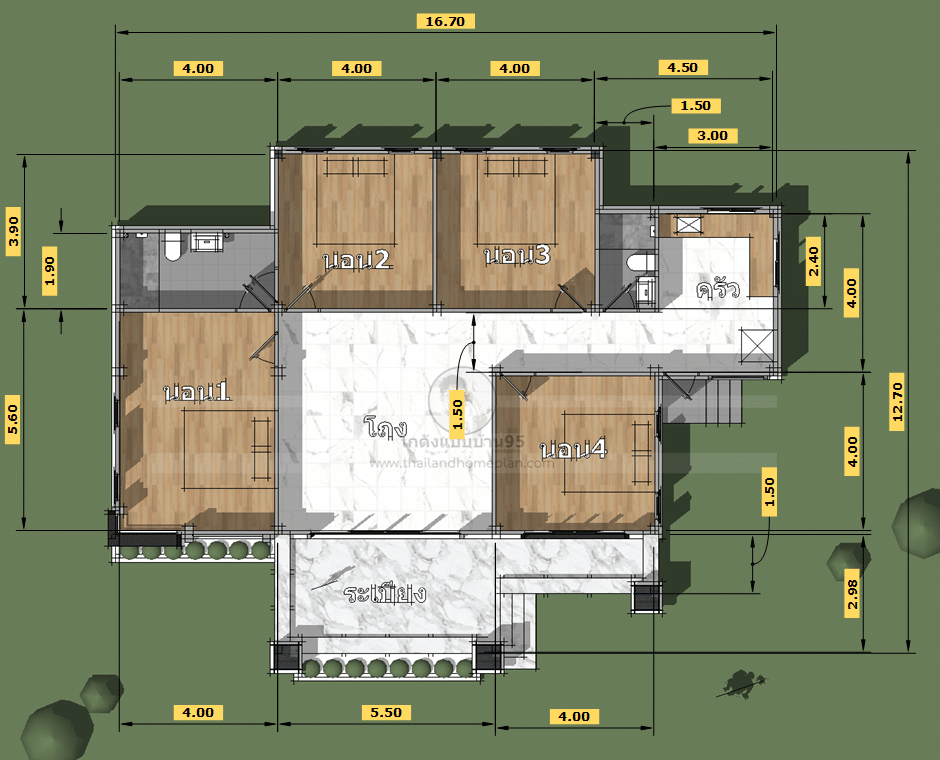Mặt bằng trải ngang: Nhà mái Thái 1 tầng 4 phòng ngủ thường có chiều ngang mặt tiền từ khoảng 8m - 10m trở lên, tạo điều kiện để kết cấu mái Thái giật cấp được tổ chức theo từng nhịp, giúp phân tách khối nhà rộng thành các khối nhỏ liên kết, đảm bảo cân đối về tỷ lệ kiến trúc và mang lại cảm giác vững chãi, sang trọng nhưng không nặng nề.