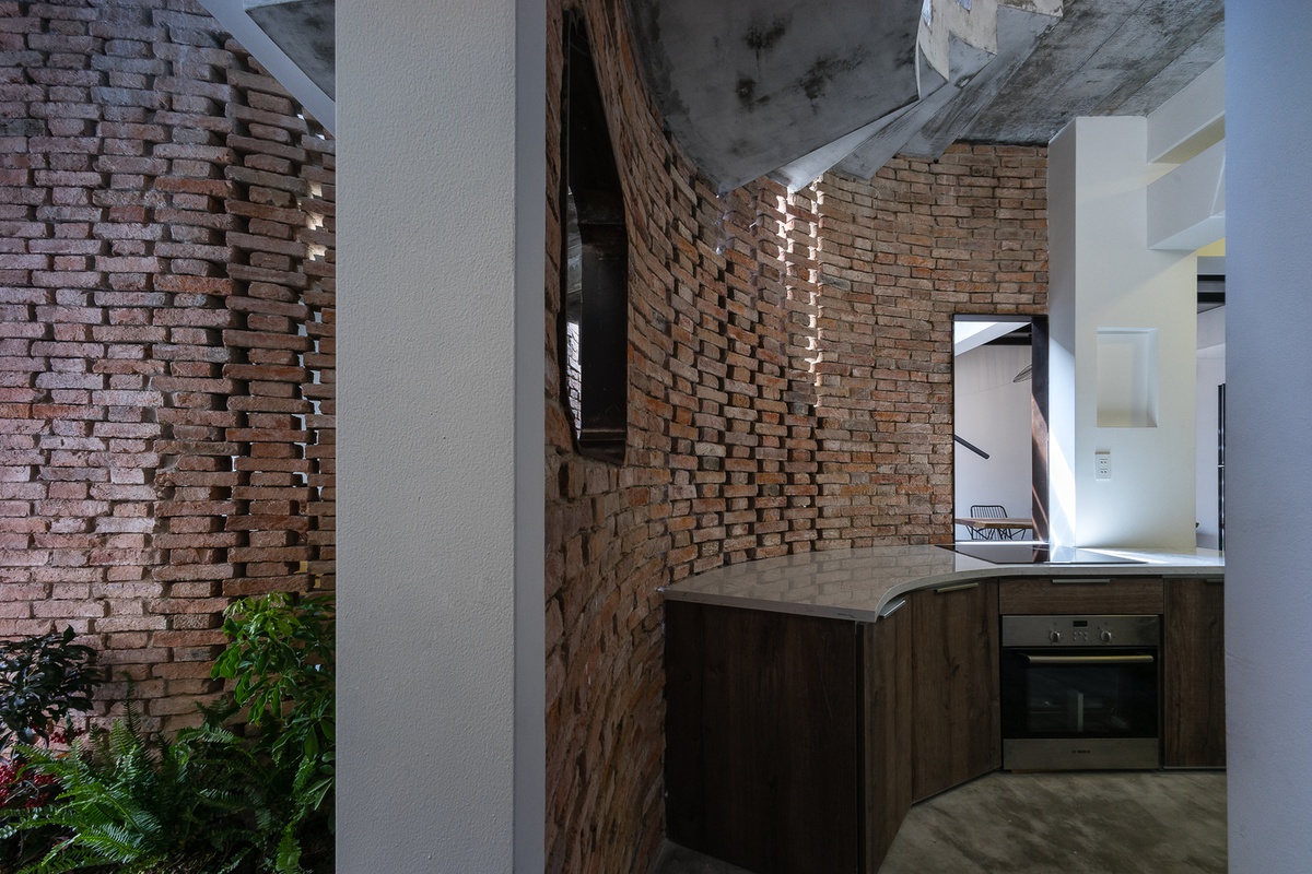 Phần kết cấu cổ điển của nguyên trạng cấp 4 được giữ lại, chỉ gia cố thêm phần khung để xây thêm lầu, việc này giúp các công đoạn xây dựng được giản lược bớt cũng như là tăng thêm diện tích sử dụng. Bởi vì hệ thống mái rộng tạo nên độ che phủ rất tốt đã giúp cho cả công trình trở thành một chiếc ô che bóng râm lớn giữa vùng đất có cái nắng khá gắt gỏng này.