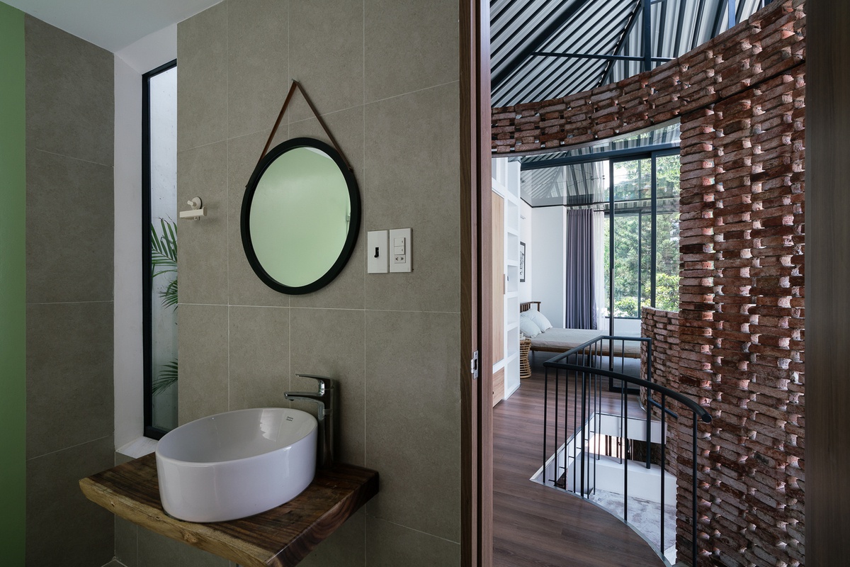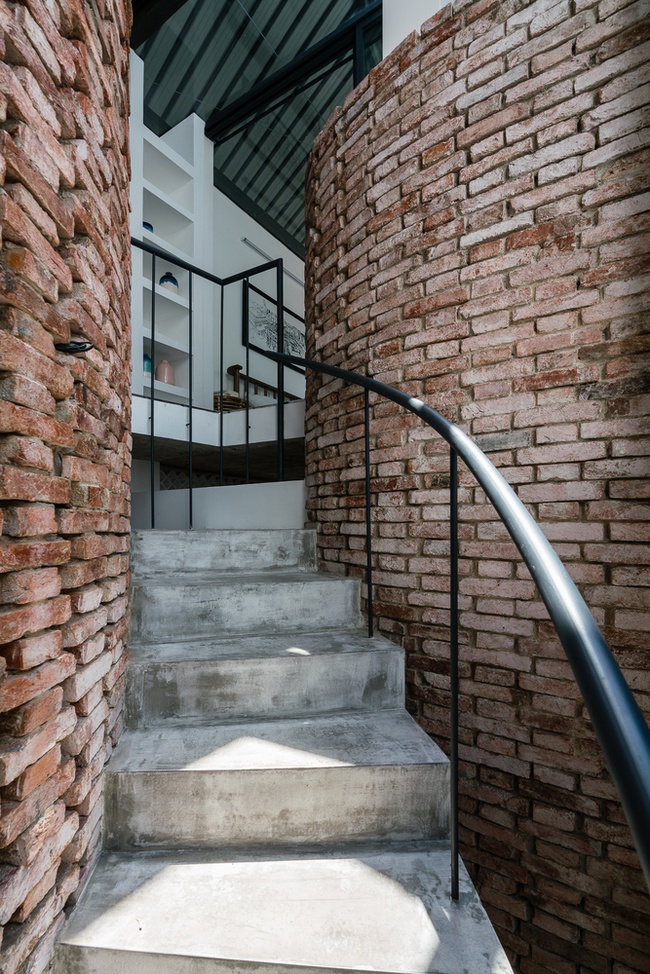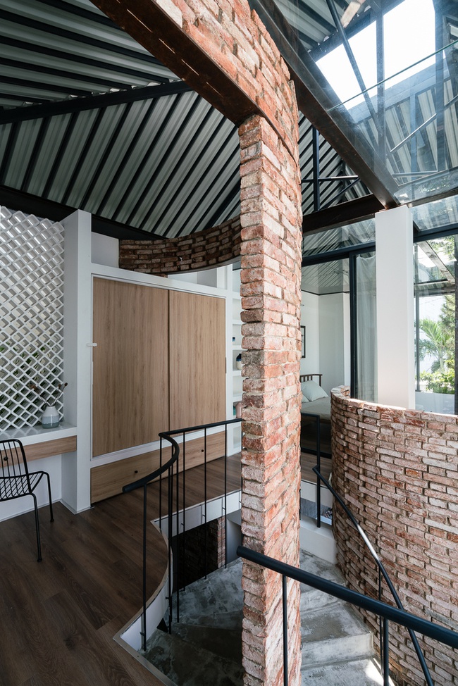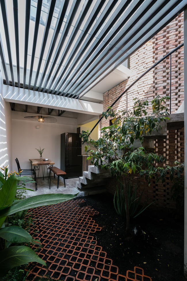 Thiết kế nội thất của các không gian sinh hoạt được chú trọng về các chất liệu như gỗ tự nhiên để màu sắc hài hòa với màu gạch tường. Việc tinh giản các vật dụng nội thất và hạn chế tối đa những thứ không cần thiết giúp cho các không gian sinh hoạt được phô bày nét đẹp rất mộc mạc và những sự tiện nghi cũng dần rõ nét hơn. Đây là phong cách thiết kế nội thất nhà phố rất đậm nét cá nhân của KTS với tinh thần mộc mạc và tự nhiên là nét đẹp tự thân của kiến trúc.