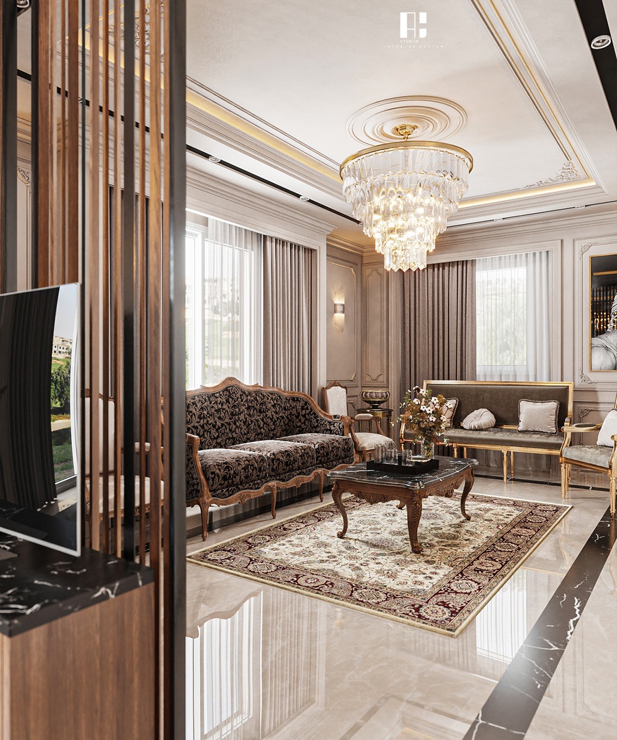 Một bộ ghế sofa với kích thước, tone màu phù hợp tổng thể và một chiếc đèn chùm hoa lệ là 2 món đồ không thể thiếu đối với không gian phòng khách biệt thự tân cổ điển.