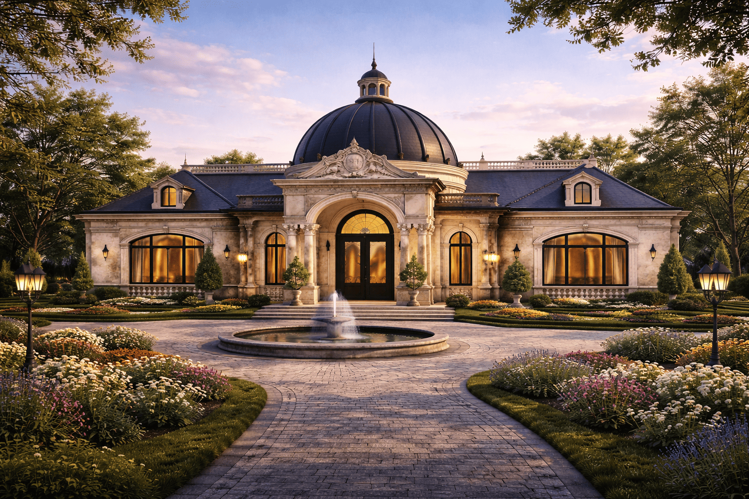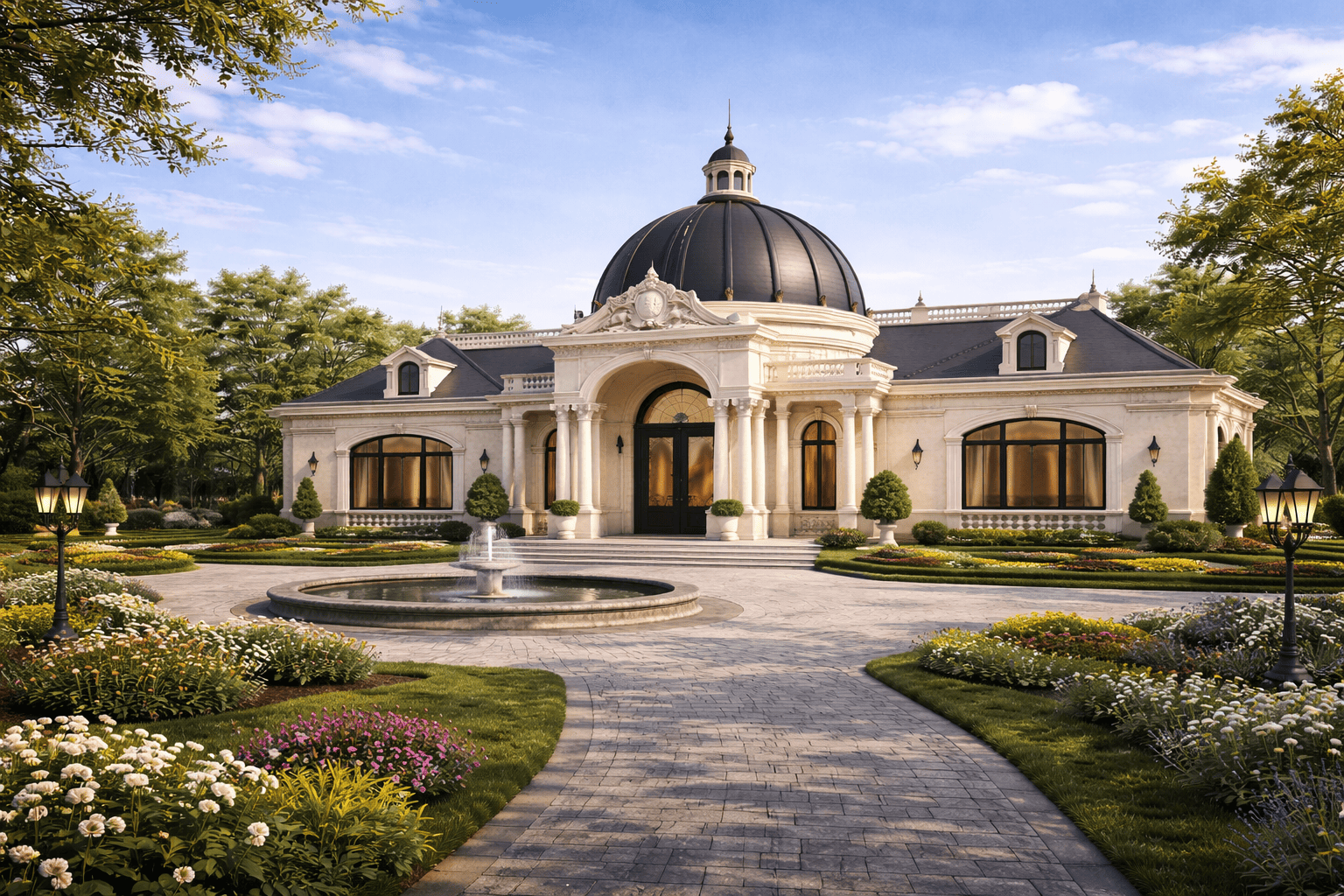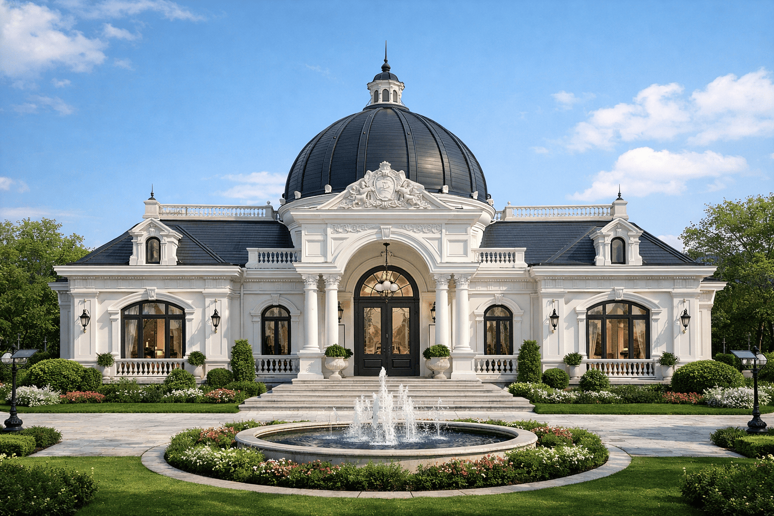 Biệt thự 1 tầng kiểu Pháp mái vòm (French Dome Roof) nằm trên quỹ đất đủ rộng (khoảng 300–600m²) xuất hiện như biểu tượng – một dấu ấn nghi lễ tĩnh lặng giữa đất trời, nơi những đường cong không nhằm mục đích gây ấn tượng tức thì, mà để ở lại lâu hơn trong cảm xúc của người chiêm ngưỡng.