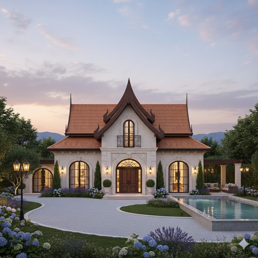 Biệt thự 1 tầng kiểu Châu Âu mái Thái trên quy mô 200-500m2 mang tinh thần lãng mạn của những dinh thự ven đô nước Pháp được tổ chức theo hệ mái chính - phụ xếp lớp, dàn trải theo phương ngang, kết hợp với độ dốc mái từ 30–45°, giúp mở rộng hình khối công trình và tạo chiều cao thị giác, khắc phục cảm giác thấp, bẹt của kiến trúc 1 tầng. Đi sâu vào bản chất, mái Thái là công cụ điều hoà vi khí hậu với khoảng đệm mái từ 60 - 80cm kết hợp với hệ hiên sâu giúp tăng khả năng chống nóng và thoát nước dưới tác động của khí hậu nhiệt đới gió mùa tại Việt Nam. Đồng thời, mặt bằng công năng bố trí linh hoạt với phòng khách đặt trung tâm, bếp - ăn liên thông phía sau, các phòng ngủ phân bổ về hai bên và phía sau nhà, vừa đảm bảo riêng tư, vừa tận dụng tối đa thông gió và ánh sáng tự nhiên.