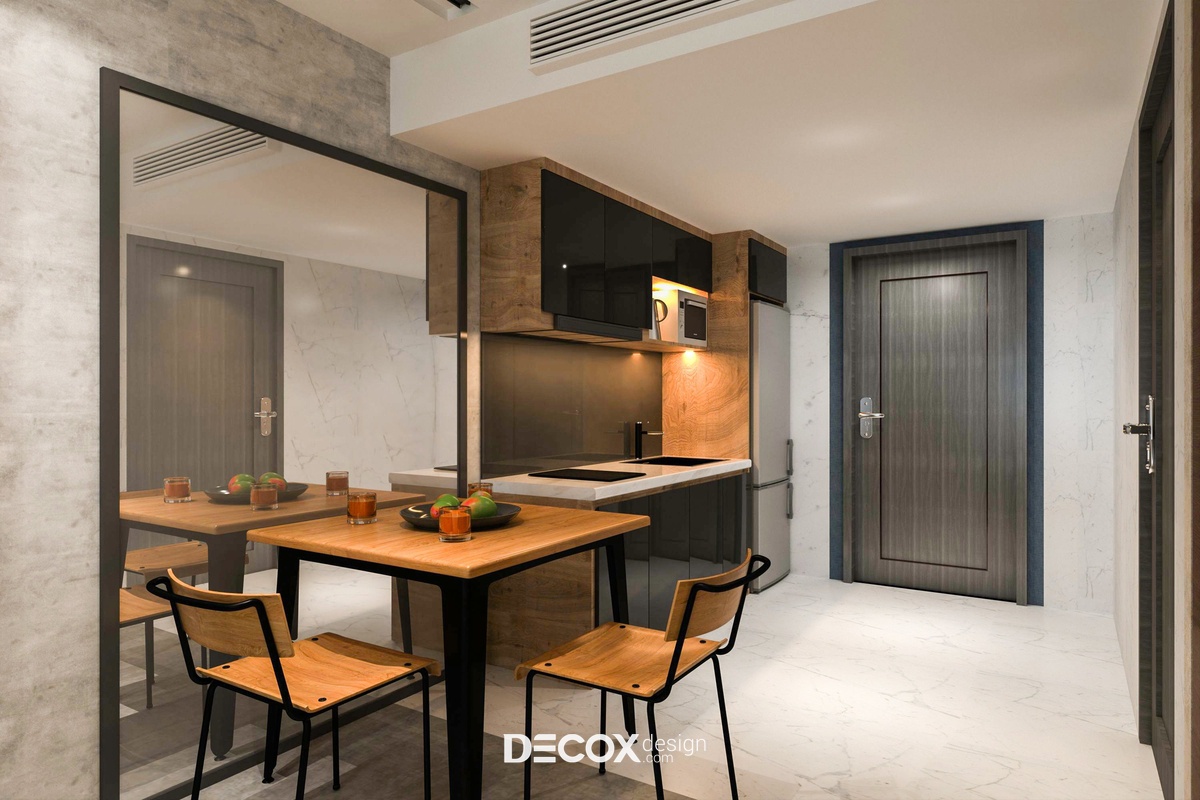 Thiết kế bếp dạng chữ I đơn giản, không chiếm quá nhiều diện tích kết hợp thêm đồng thời cả hệ tủ bếp trên lẫn tủ bếp dưới giúp khách hàng có thêm nhiều không gian lưu trữ đồ đạc. Bên cạnh bếp KTS đặt thêm một bộ bàn ăn nhỏ được làm từ chất liệu gỗ, kiểu dáng đơn giản đầy tiện dụng. Ở đây để làm nhấn điểm khu vực bàn ăn cũng như gia tăng hiệu ứng ánh sáng KTS đã trang trí thêm một tấm gương đứng cỡ lớn tại khu vực này. Đối diện căn bếp là khu vực WC sang trọng với phân khu khô - ướt riêng biệt được phân định chức năng bởi đá marble ốp tường trắng cho buồng tắm đứng và marble vàng cho khu vực rửa tay.