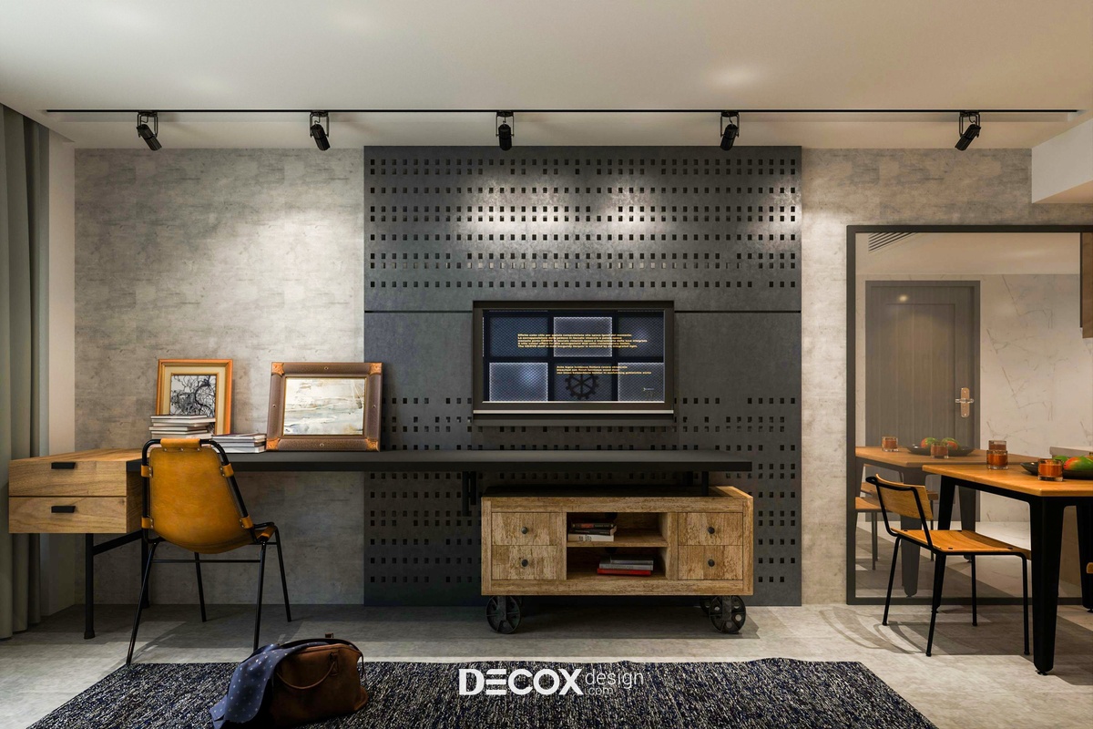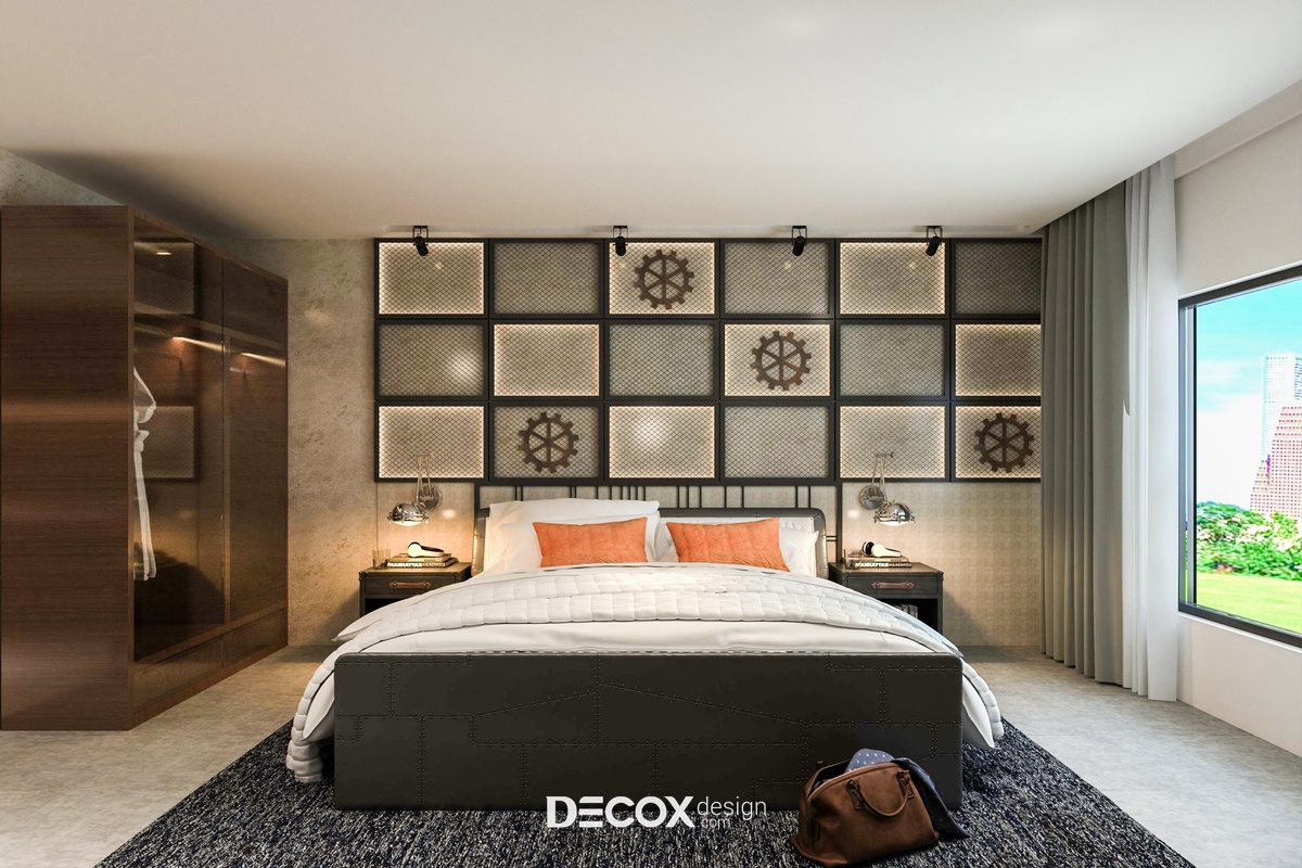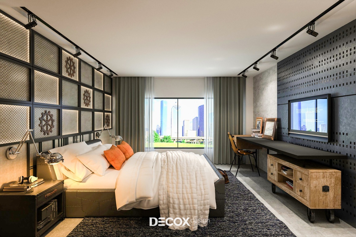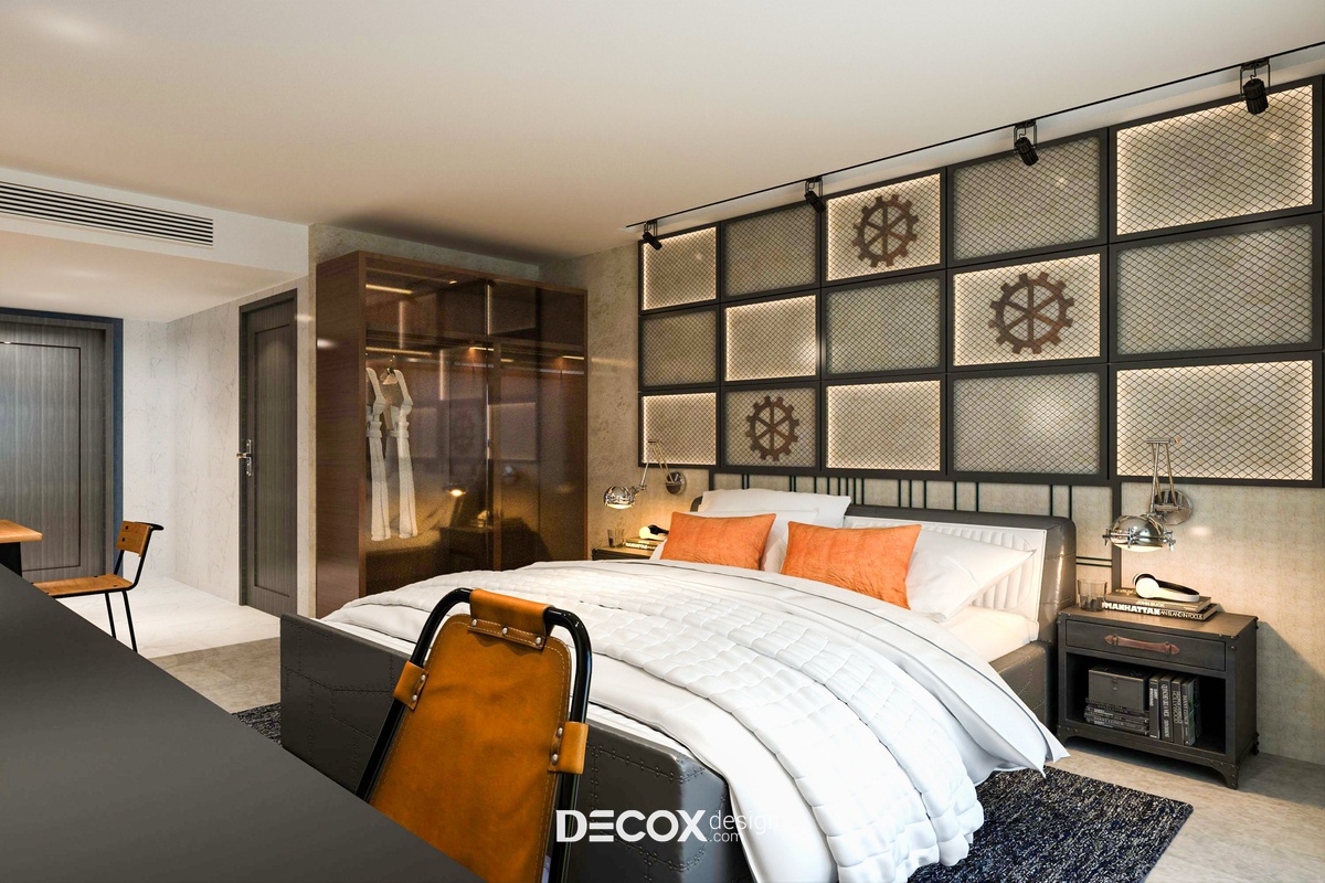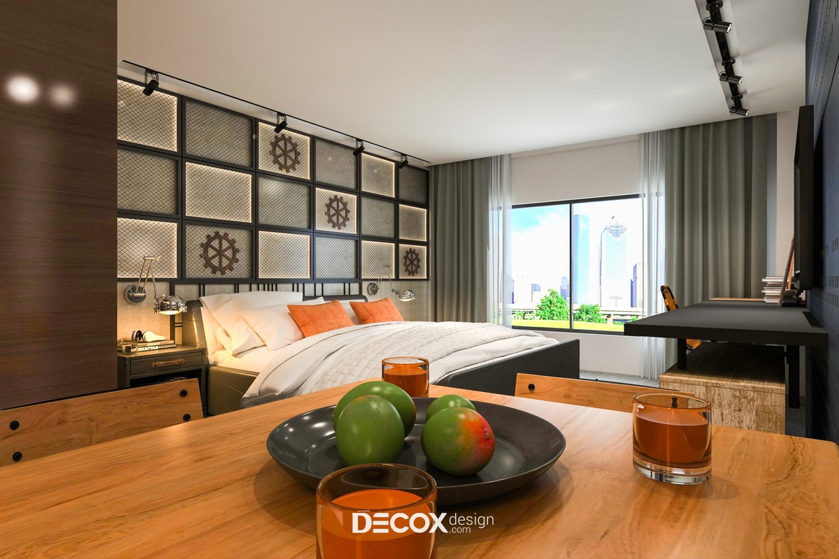 Đến với thiết kế nội thất phòng ngủ - khu vực chức năng chính của loại hình căn hộ dịch vụ, KTS đã tập trung thiết kế cũng như bố trí nội thất sao cho đạt được độ thẩm mỹ cùng công năng cao nhất. Ngoài sử dụng tường bê tông, nội thất gỗ kết hợp cùng những chi tiết trang trí đậm chất industrial, căn phòng còn ghi điểm ấn tượng bởi hệ vách đầu giường và vách khu vực tivi. Thiết kế vách đầu giường bắt mắt với cách ghép nối những khung thép lưới và nhấn điểm bởi đèn led hắt điểm độc đáo. Bên cạnh đó, tấm cnc màu đen ốp ngay khu vực tivi cũng là một điểm nhấn độc đáo khi đến với không gian này.