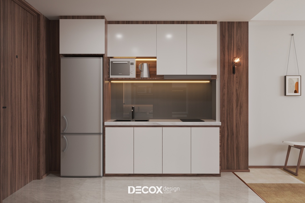 Từ khu vực cửa chính đi vào bạn sẽ bắt gặp phòng bếp được thiết kế theo dạng chữ I được đo đạc theo kích thước nhà và kê sát vào tường. Ngoài những khu vực cơ bản phục vụ cho việc nấu nướng như bồn rửa, bếp điện KTS Decox Design còn thiết kế thêm hệ tủ bếp trên và dưới để khách hàng có thêm không gian lưu trữ đồ dùng.