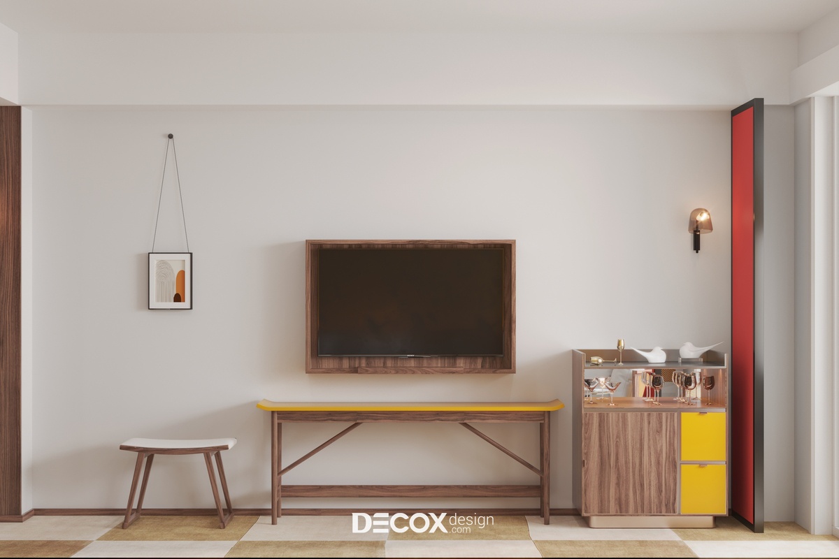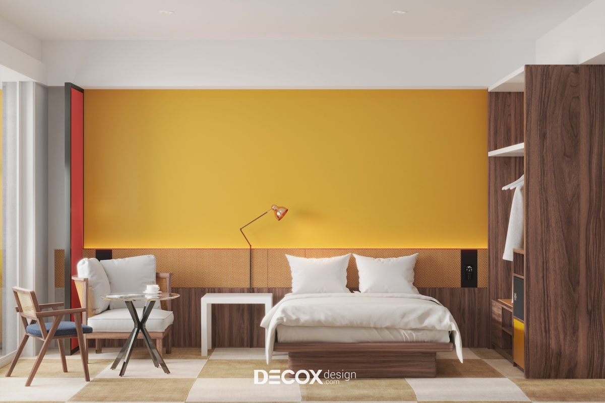 Khu vực nghỉ ngơi ấn tượng, bắt mắt với sự kết hợp cùng những tone màu ấm nóng như bức tường đầu giường sơn vàng, vách ngăn màu đỏ cùng nội thất gỗ. Cách phối trộn màu sắc như thế này vừa có tác dụng về mặt kích thích hiệu ứng thị giác, tạo điểm nhấn vừa giúp không gian thêm phần ấm cúng, tăng cường chất lượng giấc ngủ. Ở đây, KTS chỉ bố trí một giường phản gỗ nhỏ kết hợp cùng tủ quần áo và tủ đầu giường kiểu dáng đơn giản để tối ưu hóa diện tích căn hộ. Cạnh giường ngủ là một bộ bàn ghế nhỏ đóng vai trò như một "bộ sofa" dùng để tiếp khách đến thăm hay là nơi dùng bữa, thưởng thức đồ uống hoặc làm việc tùy theo mục đích sử dụng của khách.