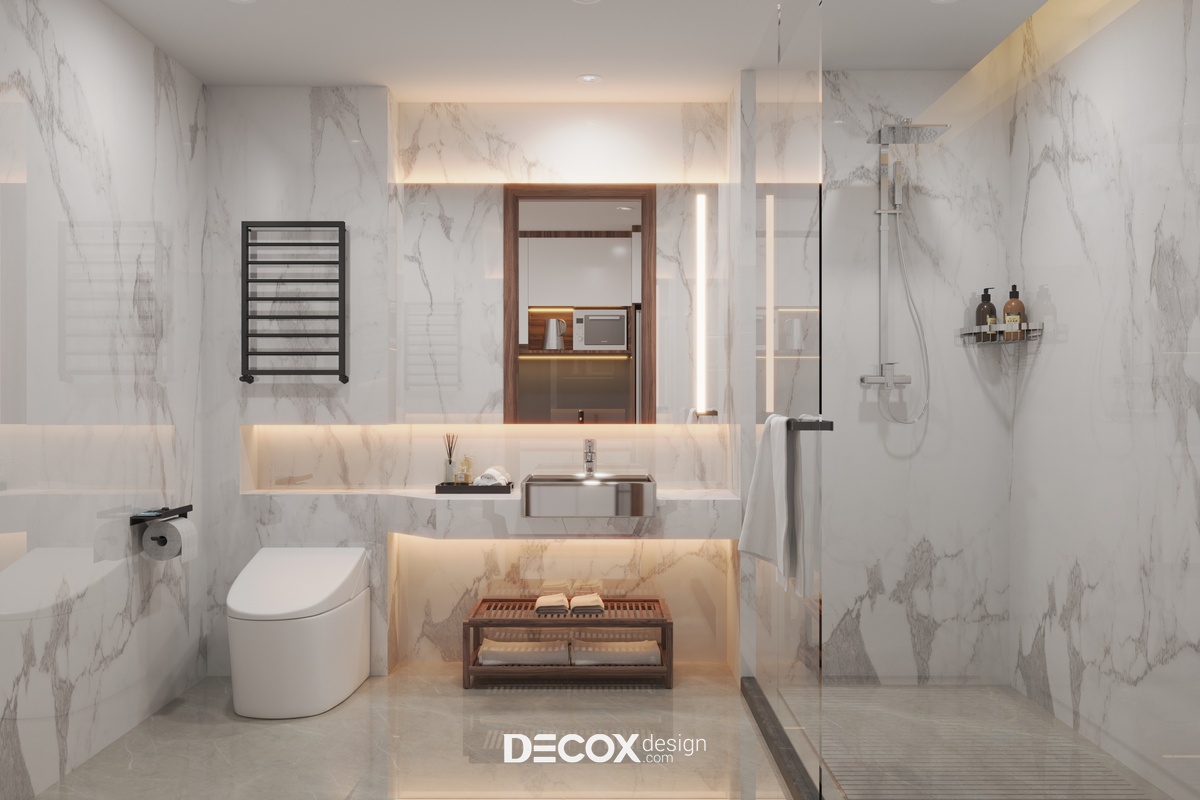 Phòng WC được thiết kế đối diện khu bếp, nếu tổng thể căn hộ dịch vụ mang đến cảm giác hiện đại, tươi mới cùng sự kết hợp của nhiều gam màu và chất liệu thì thiết kế nội thất khu vực WC lại gợi lên cảm giác sang trọng nhờ chất liệu đá marble vân mây trắng ốp lát toàn bộ các bề mặt tường. Ngoài phân khu khô - nước riêng biệt KTS còn bổ sung thêm ánh sáng vàng dịu nhẹ hắt ra từ những hốc tường để tạo sự ấm áp cũng như tăng tính thư giãn cho người sử dụng.