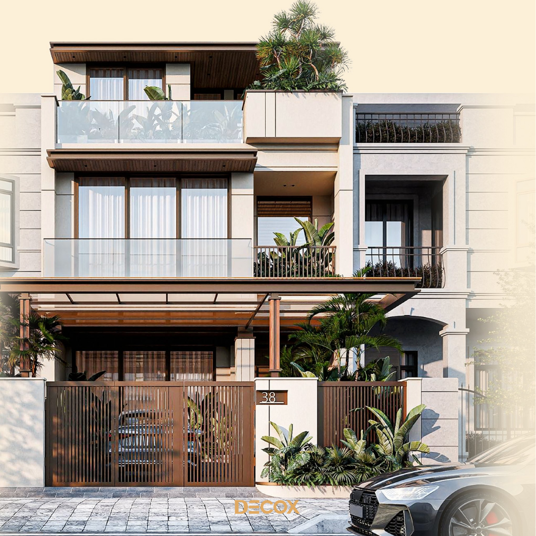 Nhà ống 3 tầng phong cách tân cổ điển được tổ chức mặt tiền theo bố cục đối xứng và trật tự hình học rõ ràng, mang lại cảm giác bề thế và trang nhã. Các tầng được phân lớp mạch lạc thông qua hệ phào chỉ, cột giả và ban công sắt mỹ thuật, tạo chiều sâu thị giác và những điểm nhấn trang trí đặc trưng của ngôn ngữ cổ điển. Bảng màu sáng như trắng, kem hoặc vàng nhạt góp phần tôn lên vẻ sang trọng, đồng thời làm dịu tỷ lệ cao của nhà phố trong bối cảnh mặt tiền hẹp. Tổng thể công trình mang cảm giác vững chãi và giàu chiều sâu hình thức, phù hợp với gia chủ yêu thích giá trị cổ điển và một mặt tiền nổi bật, có dấu ấn giữa dãy phố đô thị.