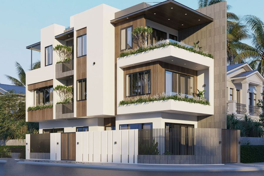 Thay vì chỉ tập trung vào một mặt chính, cả hai mặt tiền cần được thiết kế đồng bộ, tránh cảm giác phân biệt “mặt trước và mặt sau”. Các giải pháp như ban công góc, cửa sổ lớn, mảng kính hoặc hệ lam che nắng được sử dụng để tăng độ thoáng, giảm bức xạ nhiệt và tạo nhịp điệu kiến trúc xuyên suốt. Về công năng, lợi thế hai mặt tiền cho phép tầng trệt dễ dàng kết hợp sinh hoạt và kinh doanh với lối vào tách biệt, trong khi các tầng trên bố trí không gian riêng tư thoáng đãng hơn, cùng phương án cầu thang đặt lệch giúp mặt bằng linh hoạt và hiệu quả.
