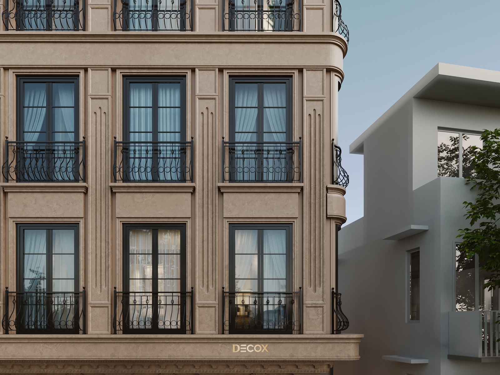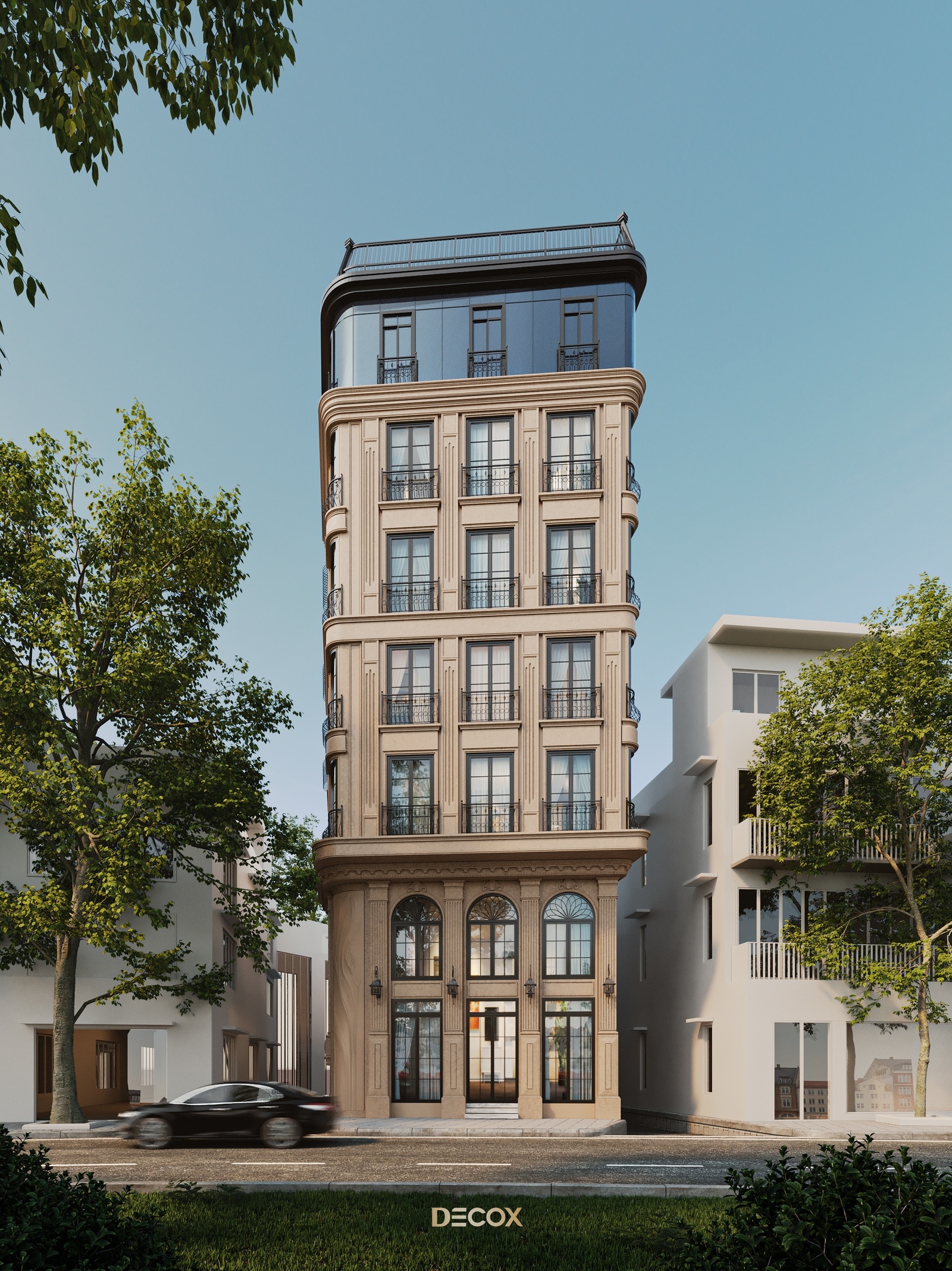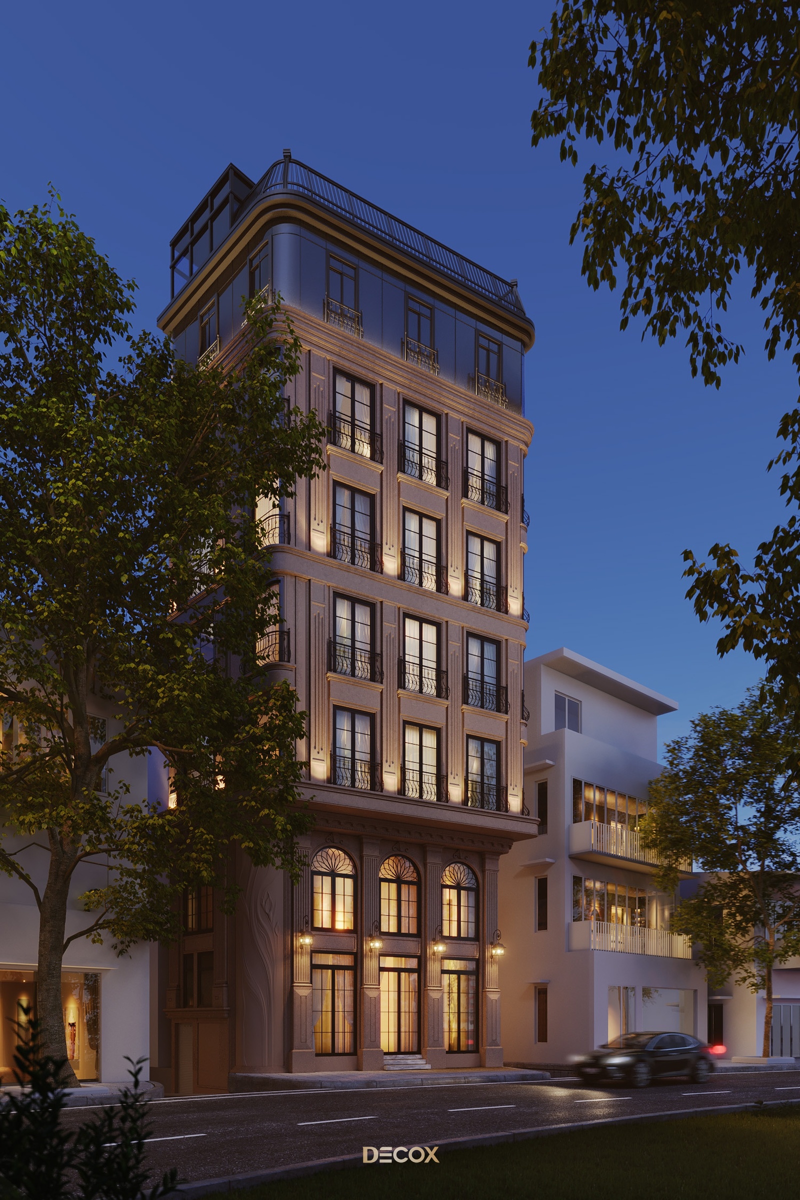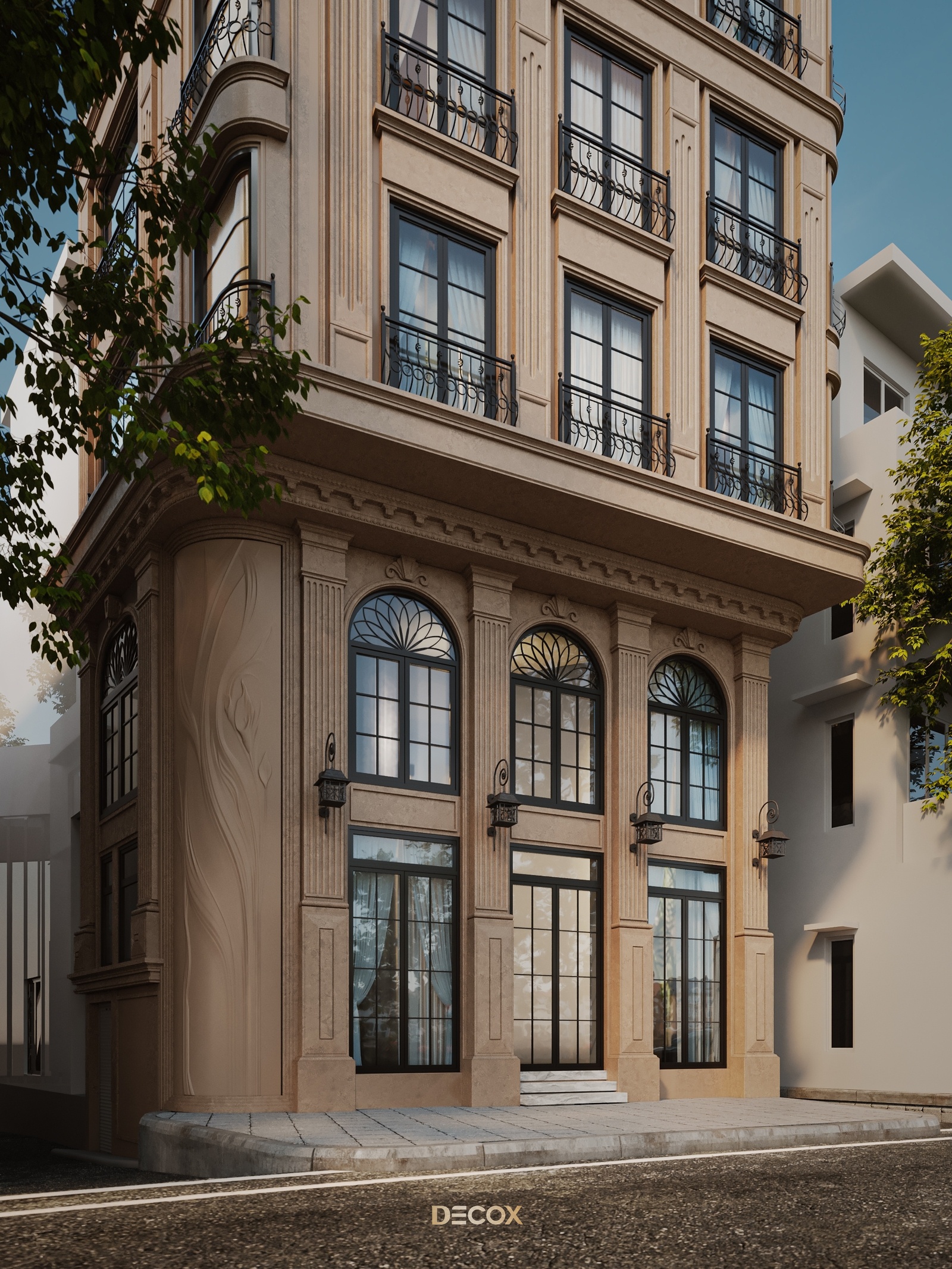 Về tổng thể, The Deluxe Townhouse khoác lên chiếc áo mang đặc trưng của nét cổ điển Châu Âu từ tỷ lệ hình khối đến những chi tiết như thức cột, cổ trần, phù điêu, phào chỉ trang trí nổi bật trên tone màu be thanh lịch chủ đạo. Điểm nhấn của công trình nằm ở hệ facade kính chủ đạo ở tầng trên cùng và giải pháp bo cong để tăng thêm tính mềm mại cho công trình.