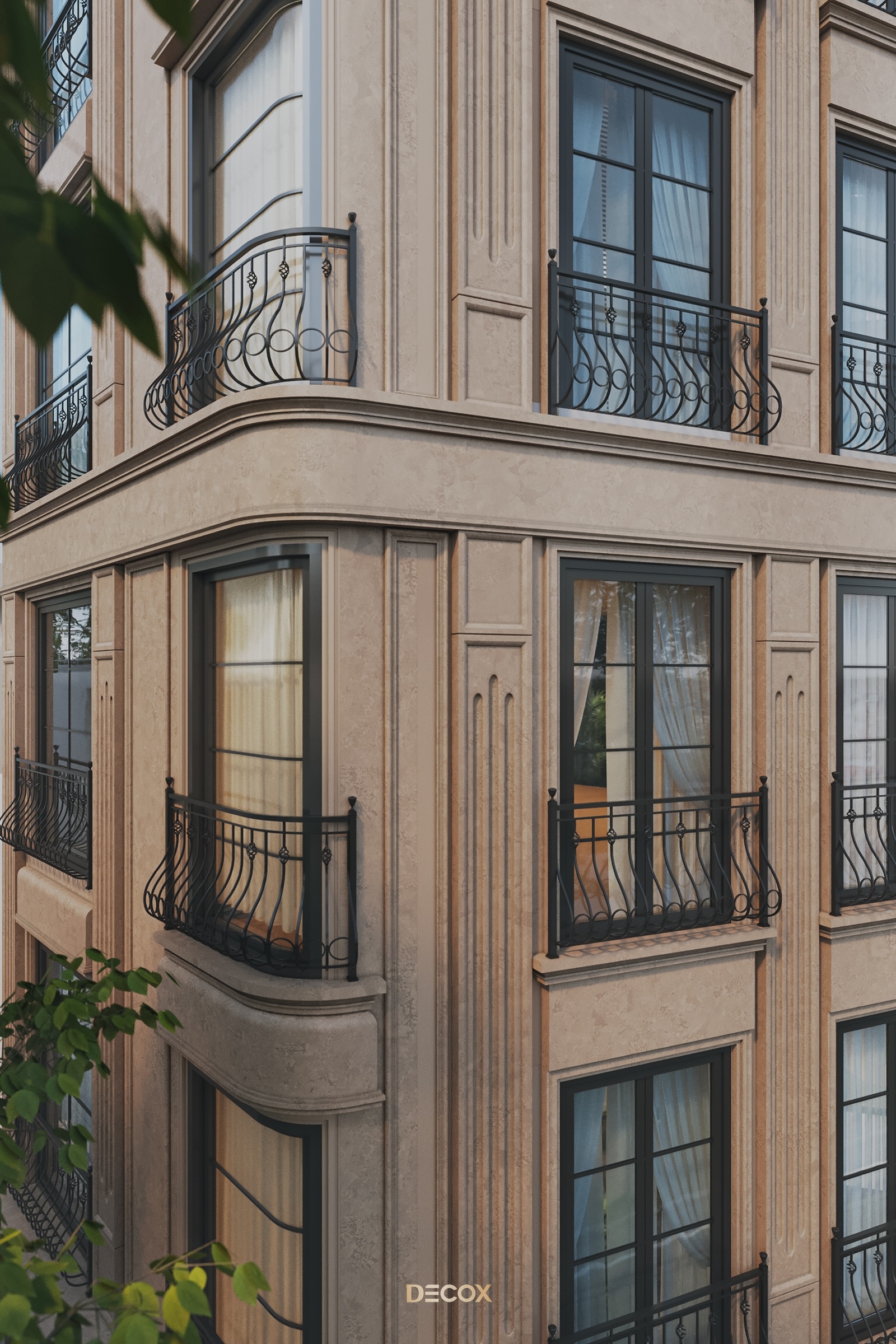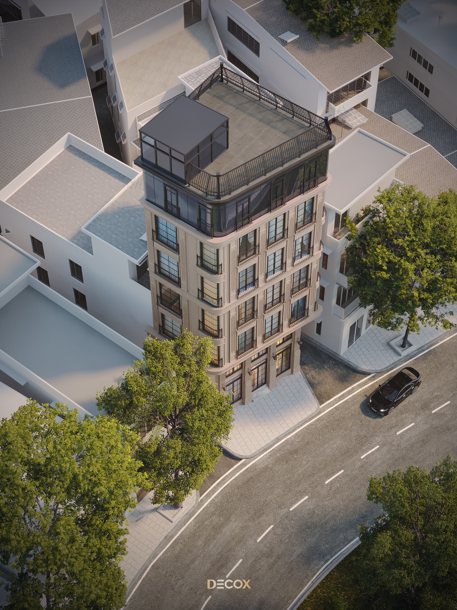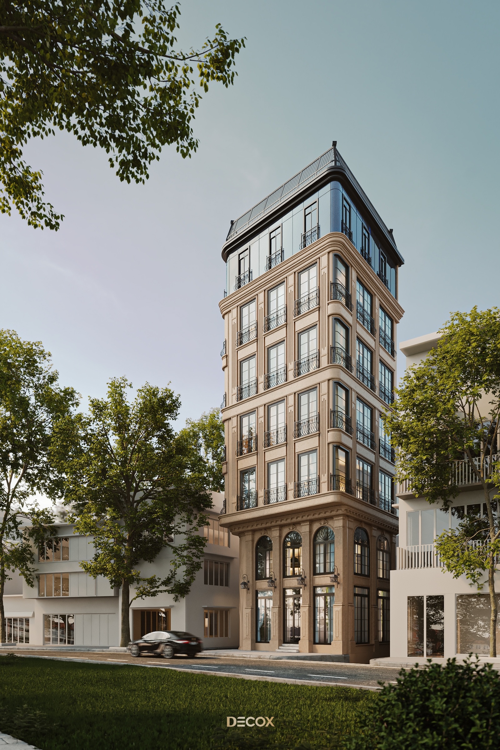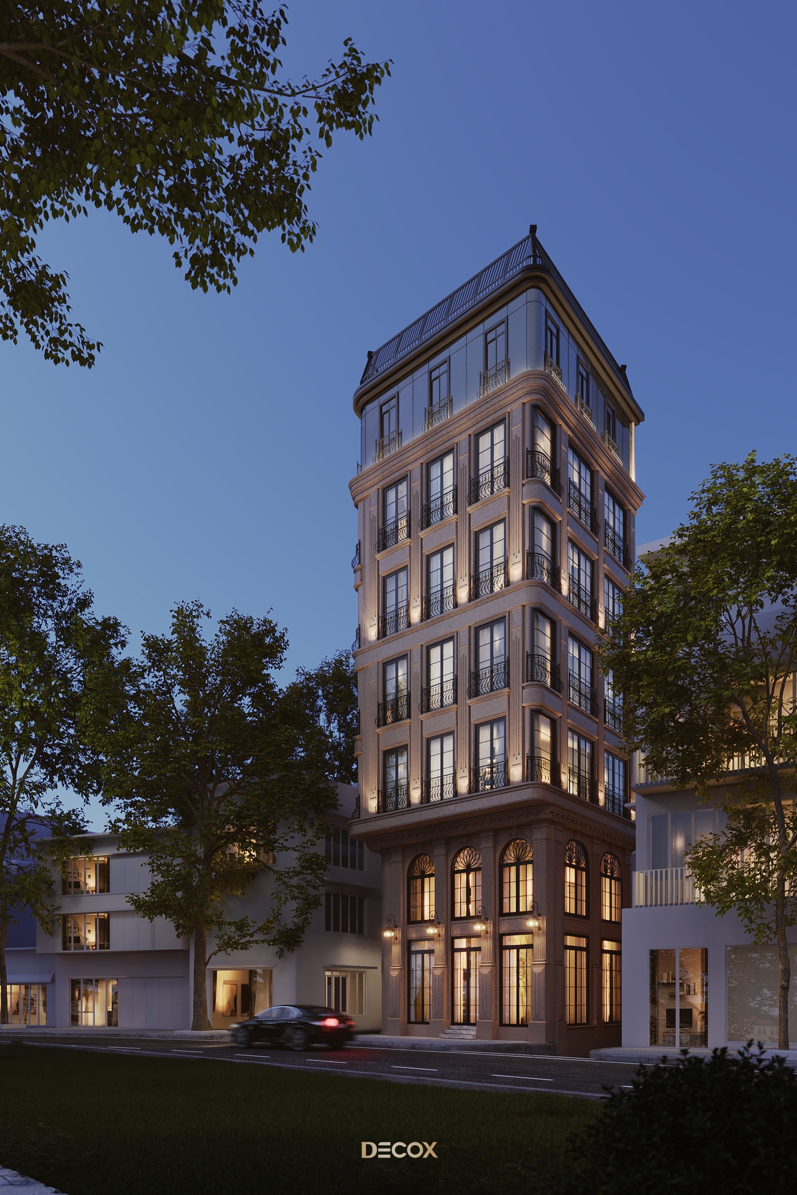 Về tổng thể, The Deluxe Townhouse khoác lên chiếc áo mang đặc trưng của nét cổ điển Châu Âu từ tỷ lệ hình khối đến những chi tiết như thức cột, cổ trần, phù điêu, phào chỉ trang trí nổi bật trên tone màu be thanh lịch chủ đạo. Điểm nhấn của công trình nằm ở hệ facade kính chủ đạo ở tầng trên cùng và giải pháp bo cong để tăng thêm tính mềm mại cho công trình.