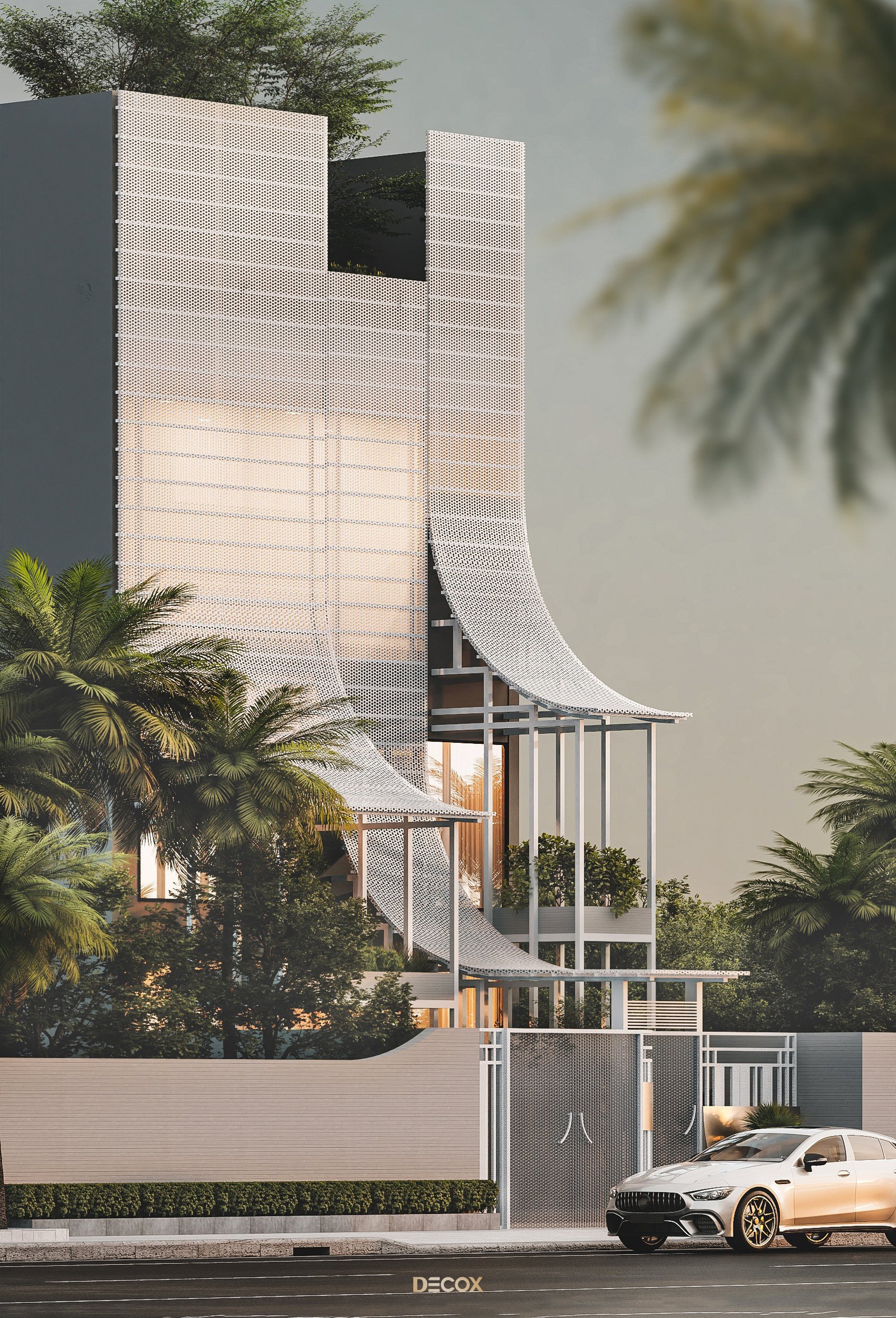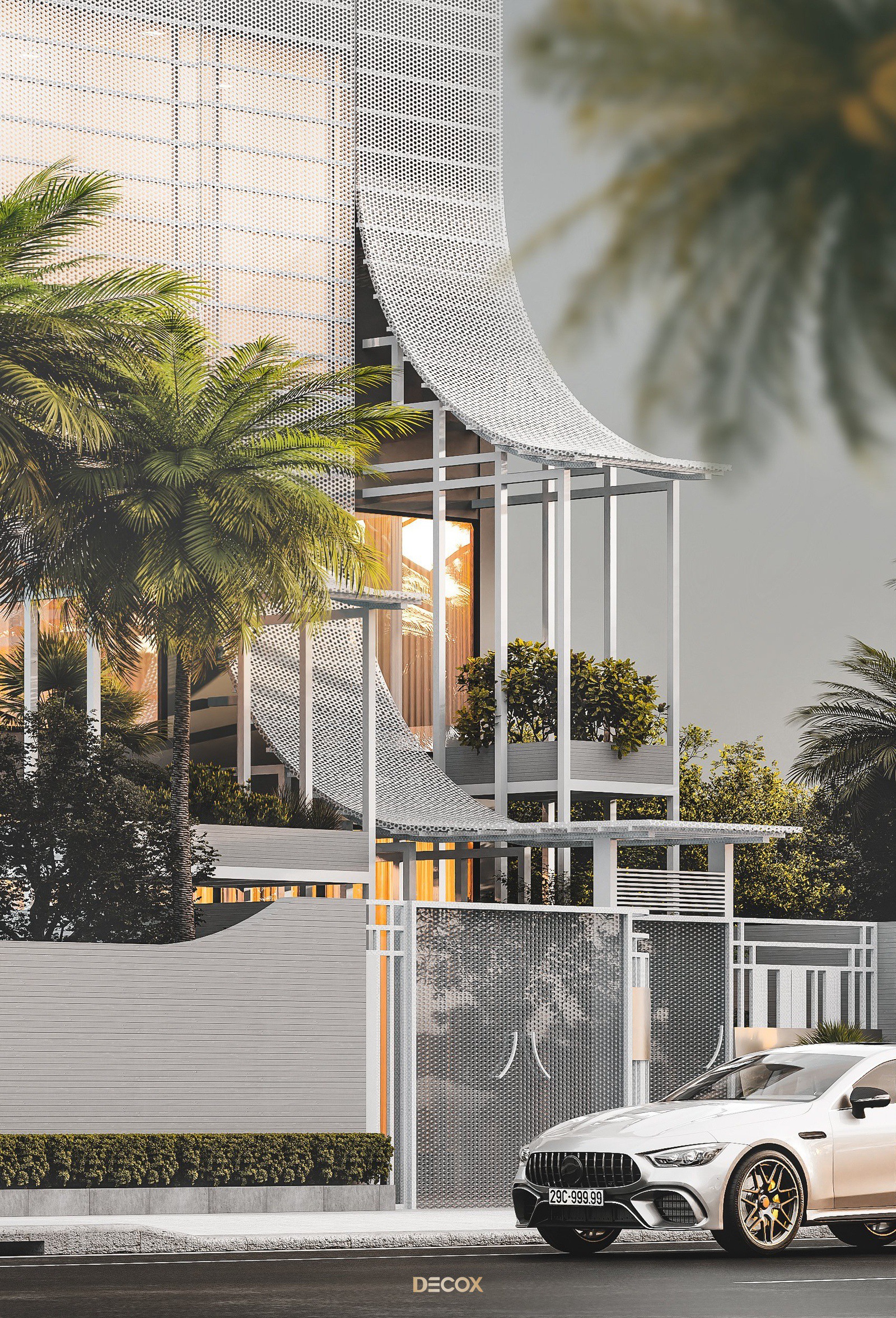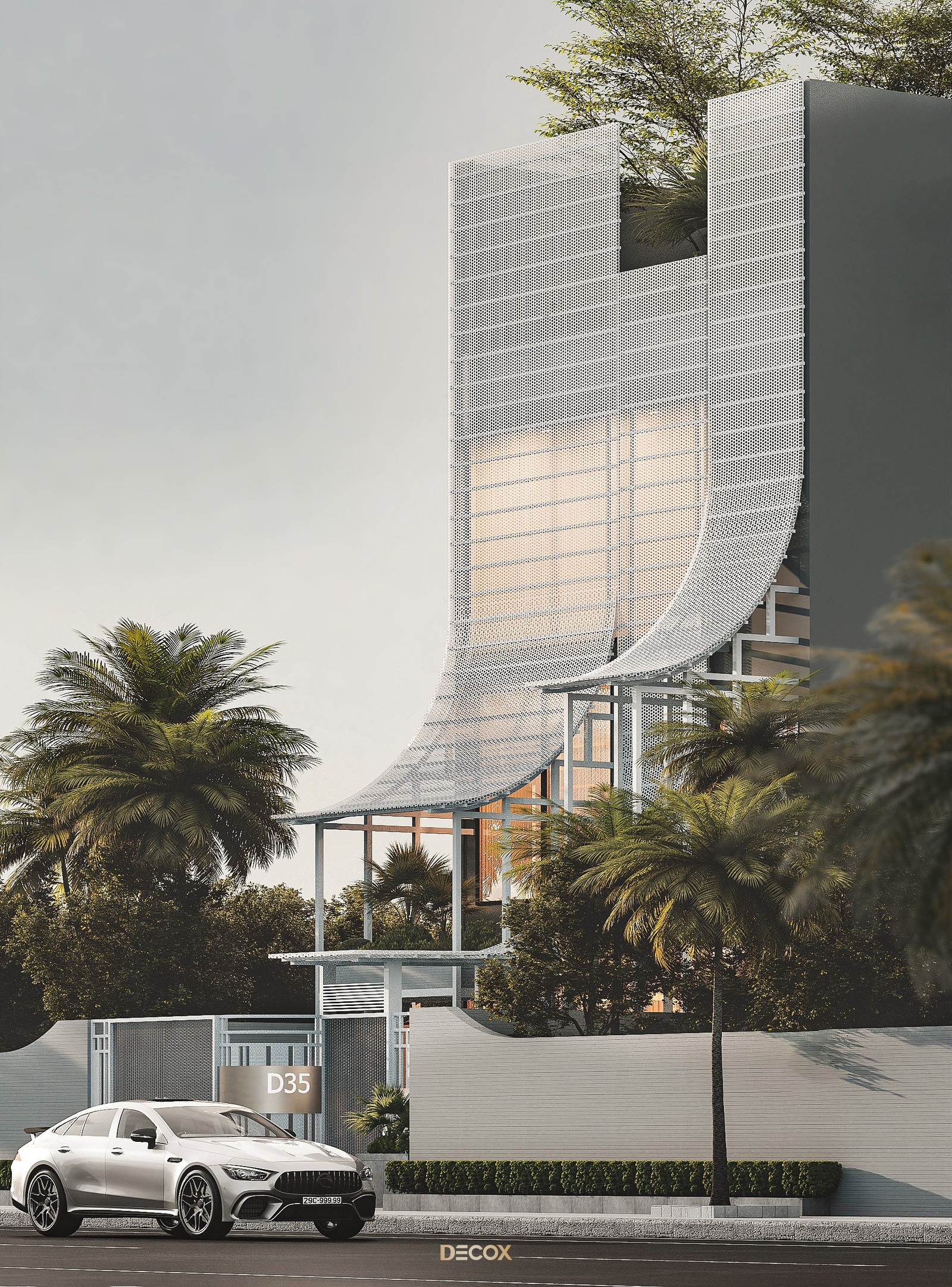 Dấu ấn công trình nằm ở mặt tiền căn nhà, bên cạnh các vách kính chủ đạo, mặt tiền nhà như được phủ thêm 1 lớp áo làm từ các tấm vách dựng chất liệu thép đục lỗ sơn trắng. Hệ facade thép uốn cong mềm mại không chỉ đáp ứng tính mới lạ, tạo sự thu hút cho công trình mà còn đảm bảo tính riêng tư của gia đình, đặc biệt là trong môi trường thành thị với những ngôi nhà san sát nhau.
