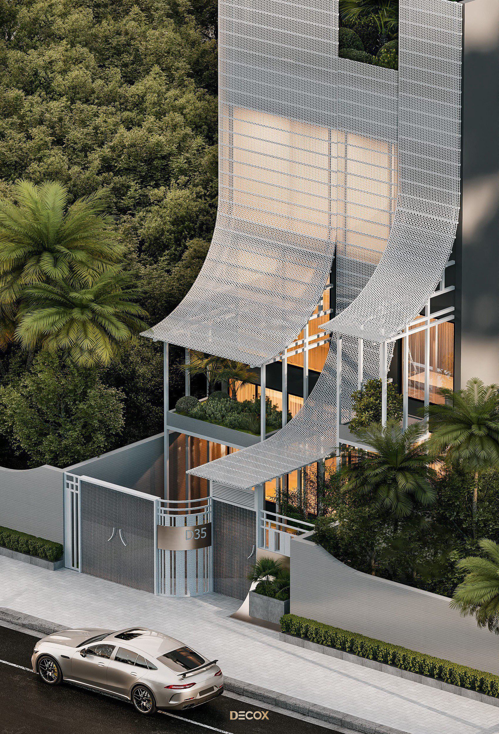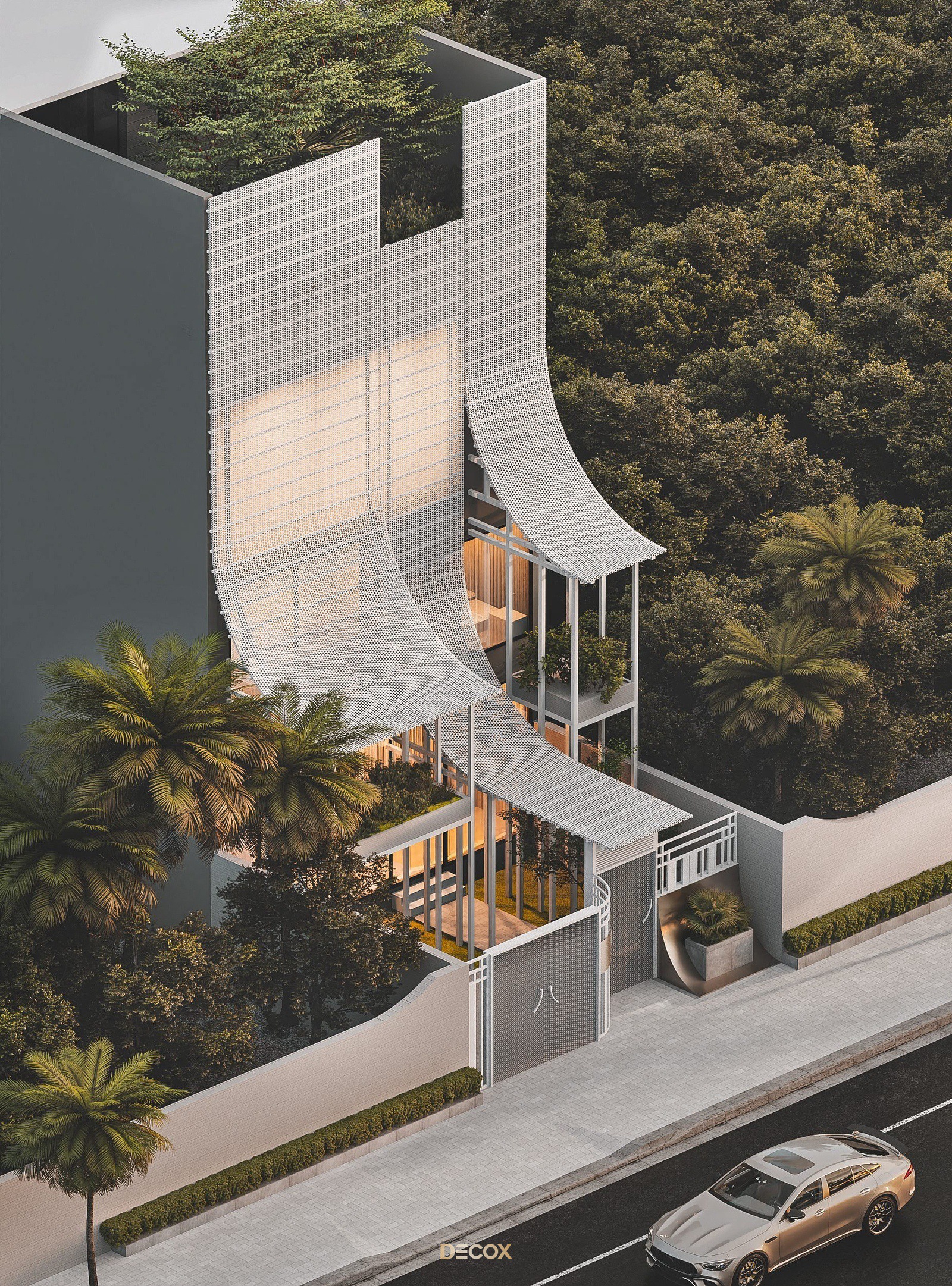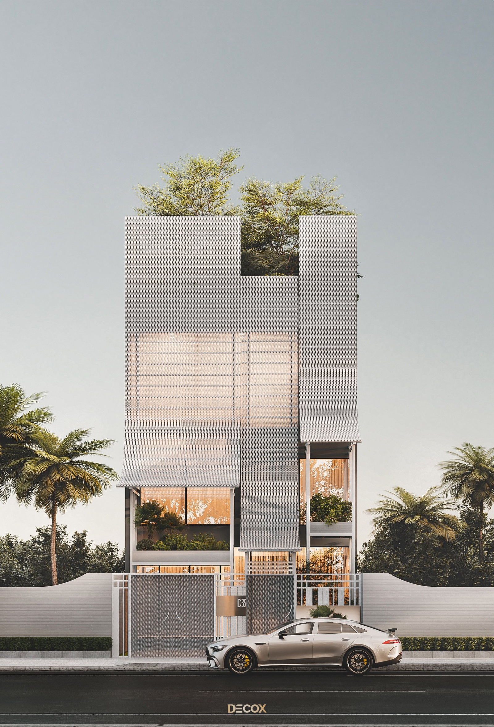 Dấu ấn công trình nằm ở mặt tiền căn nhà, bên cạnh các vách kính chủ đạo, mặt tiền nhà như được phủ thêm 1 lớp áo làm từ các tấm vách dựng chất liệu thép đục lỗ sơn trắng. Hệ facade thép uốn cong mềm mại không chỉ đáp ứng tính mới lạ, tạo sự thu hút cho công trình mà còn đảm bảo tính riêng tư của gia đình, đặc biệt là trong môi trường thành thị với những ngôi nhà san sát nhau.
