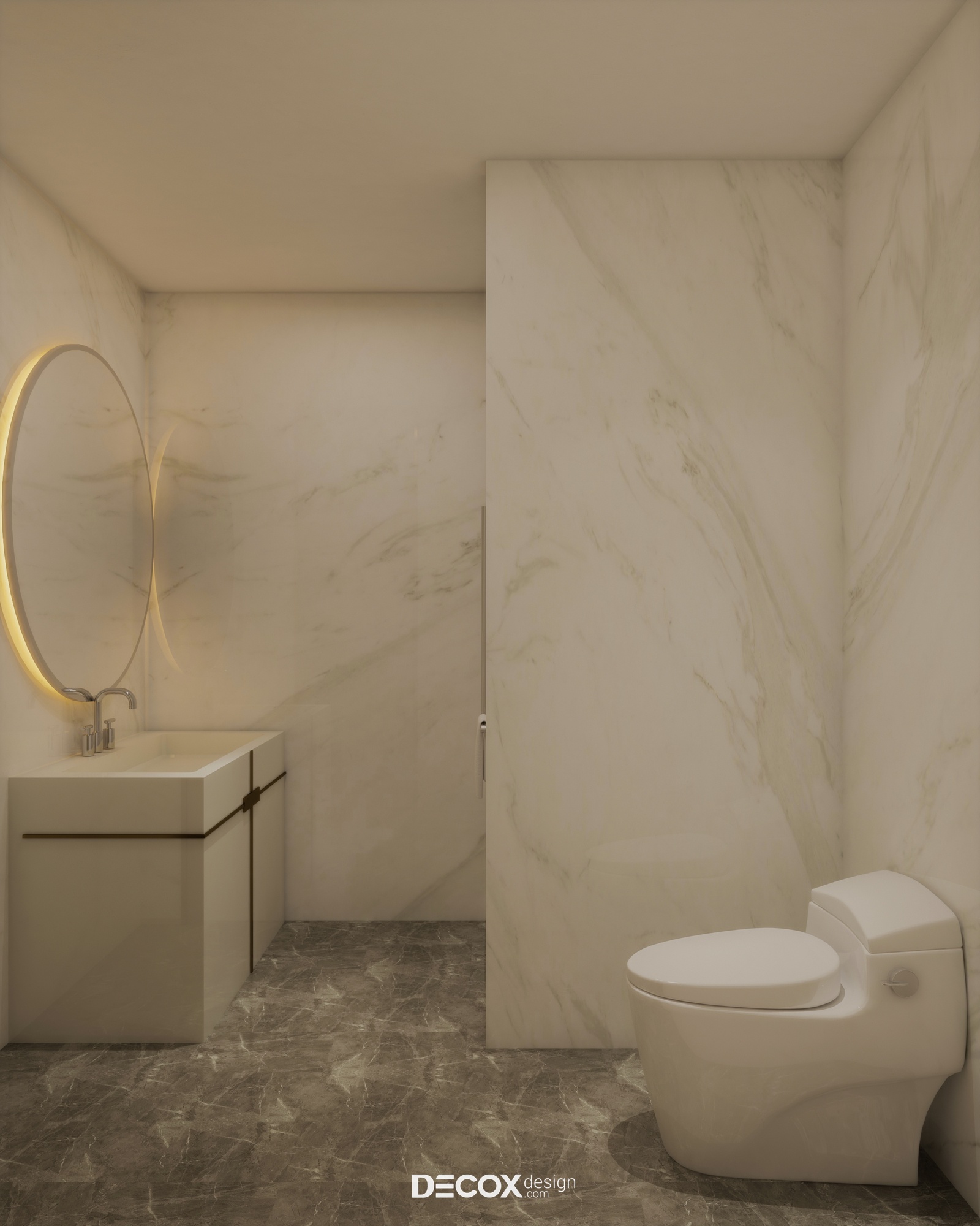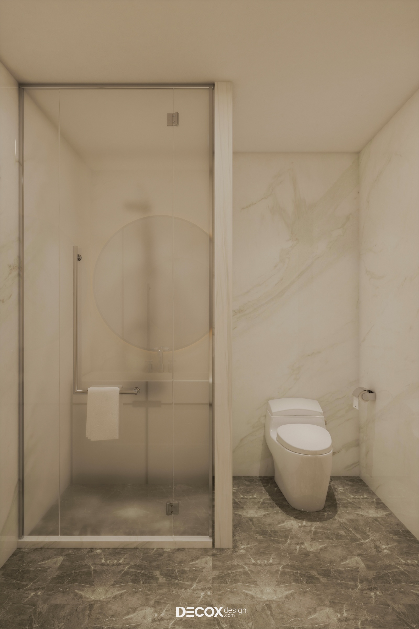 Khu vực vệ sinh được thiết kế theo dạng đóng kín nhằm đảm bảo sự riêng tư cho người sử dụng. Đối diện với khu vực này là một chiếc tủ quần áo được kê sát tường vừa tiết kiệm diện tích vừa che lấp đi bức tường trống trải, đơn điệu từ đó gia tăng tính thẩm mỹ cho căn hộ.