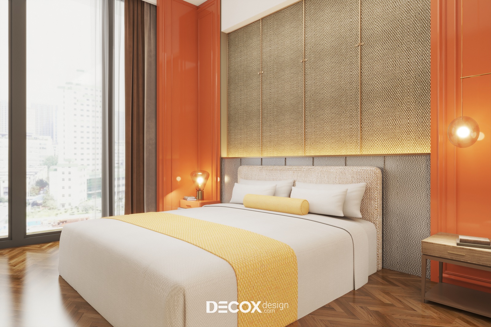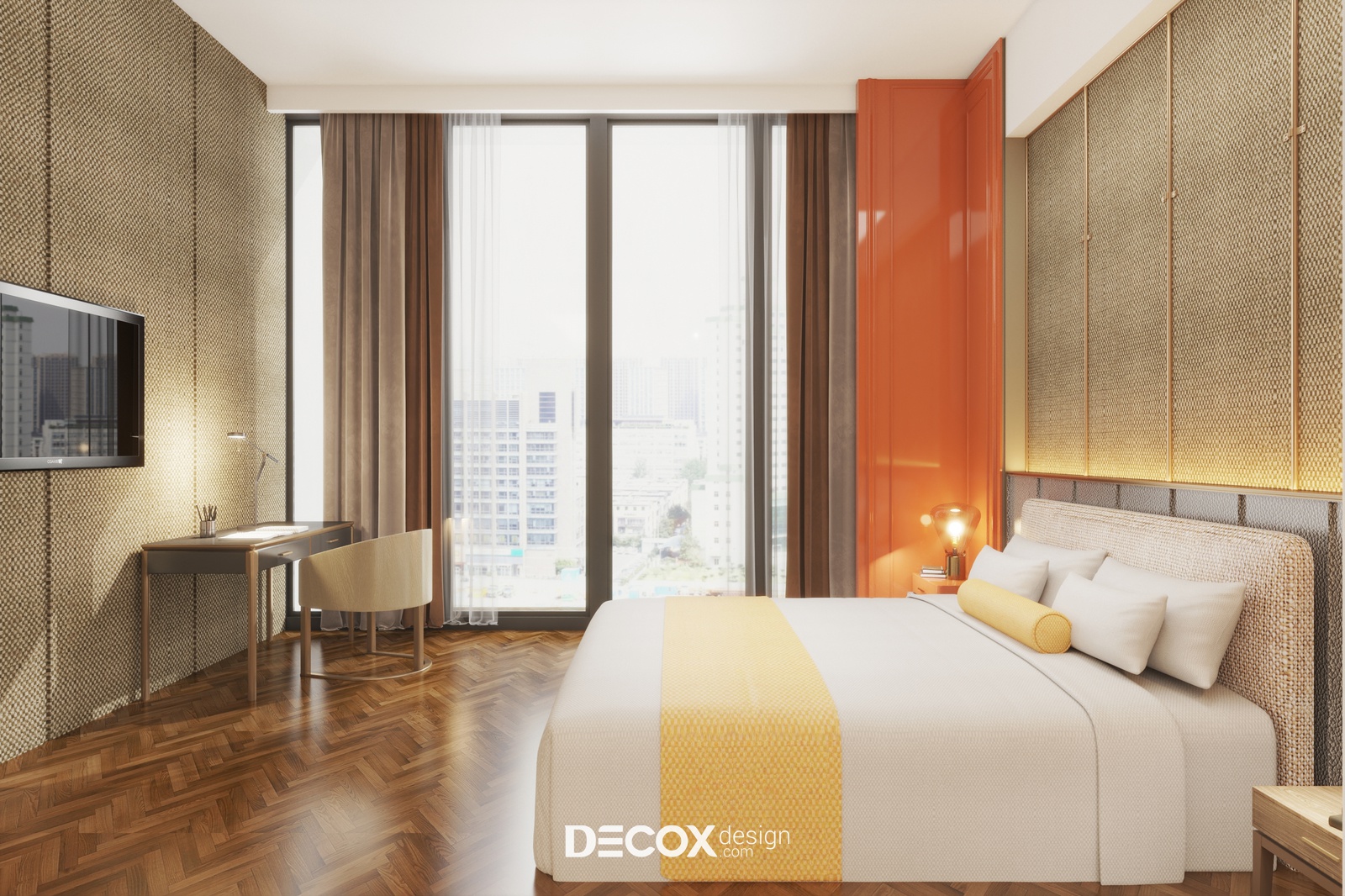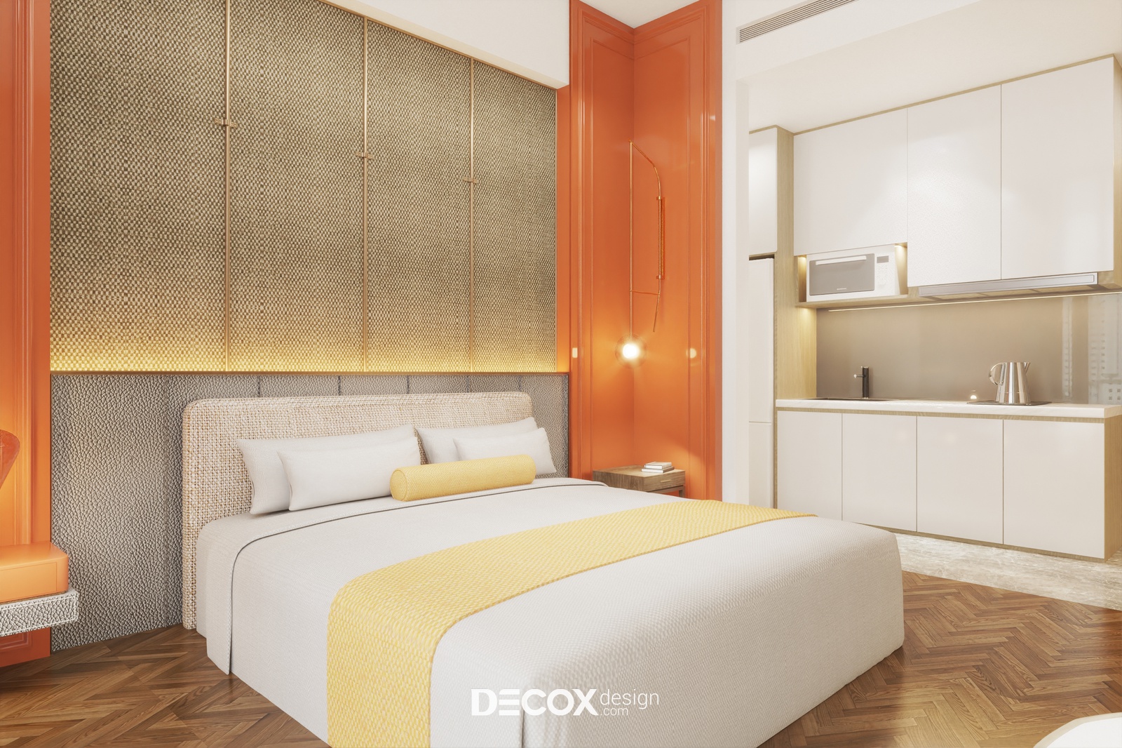 Một dự án thiết kế nội thất căn hộ dịch vụ theo phong cách hiện đại sẽ được Decox Design bật mí trong bài viết dưới đây. Tuy chỉ sở hữu diện tích vỏn vẹn 40m2 nhưng căn hộ vẫn phô diễn hoàn hảo nét sinh động, trẻ trung và tràn đầy sức sống với sự kết hợp của những tone màu ấm nóng như cam, vàng và tone màu của gỗ nhấn điểm trên nền tường trắng. Thiết kế mở giữa không gian nghỉ ngơi, làm việc và bếp nấu kết hợp cùng cửa kính full trần được ứng dụng như một giải pháp giúp căn hộ thêm thoáng đãng và rộng rãi. Ngoài ra, để tăng thêm tính ấn tượng cho không gian nghỉ ngơi, các nhà thiết kế đã bổ sung thêm vách ốp tường được đan lát từ chất liệu tự nhiên gợi cảm giác gần gũi, ấm áp ở khu vực đầu giường và khu vực tivi. Sau đây, mời bạn cùng tham quan những không gian bên trong căn hộ dịch vụ này nhé.