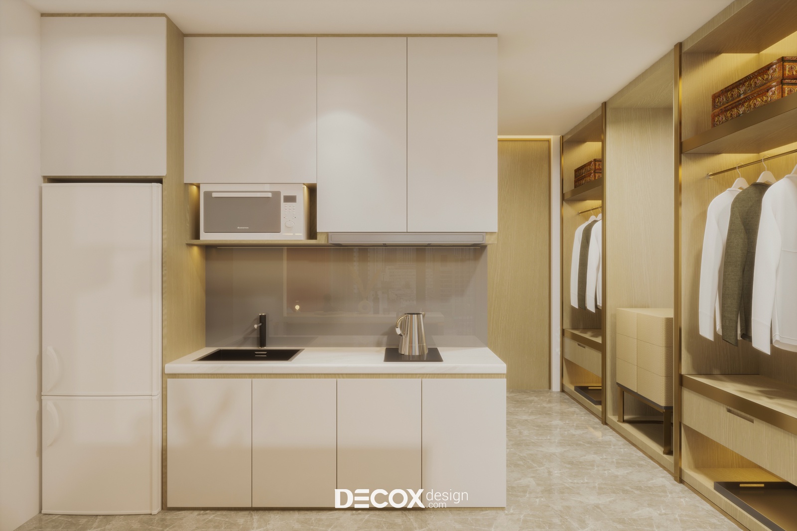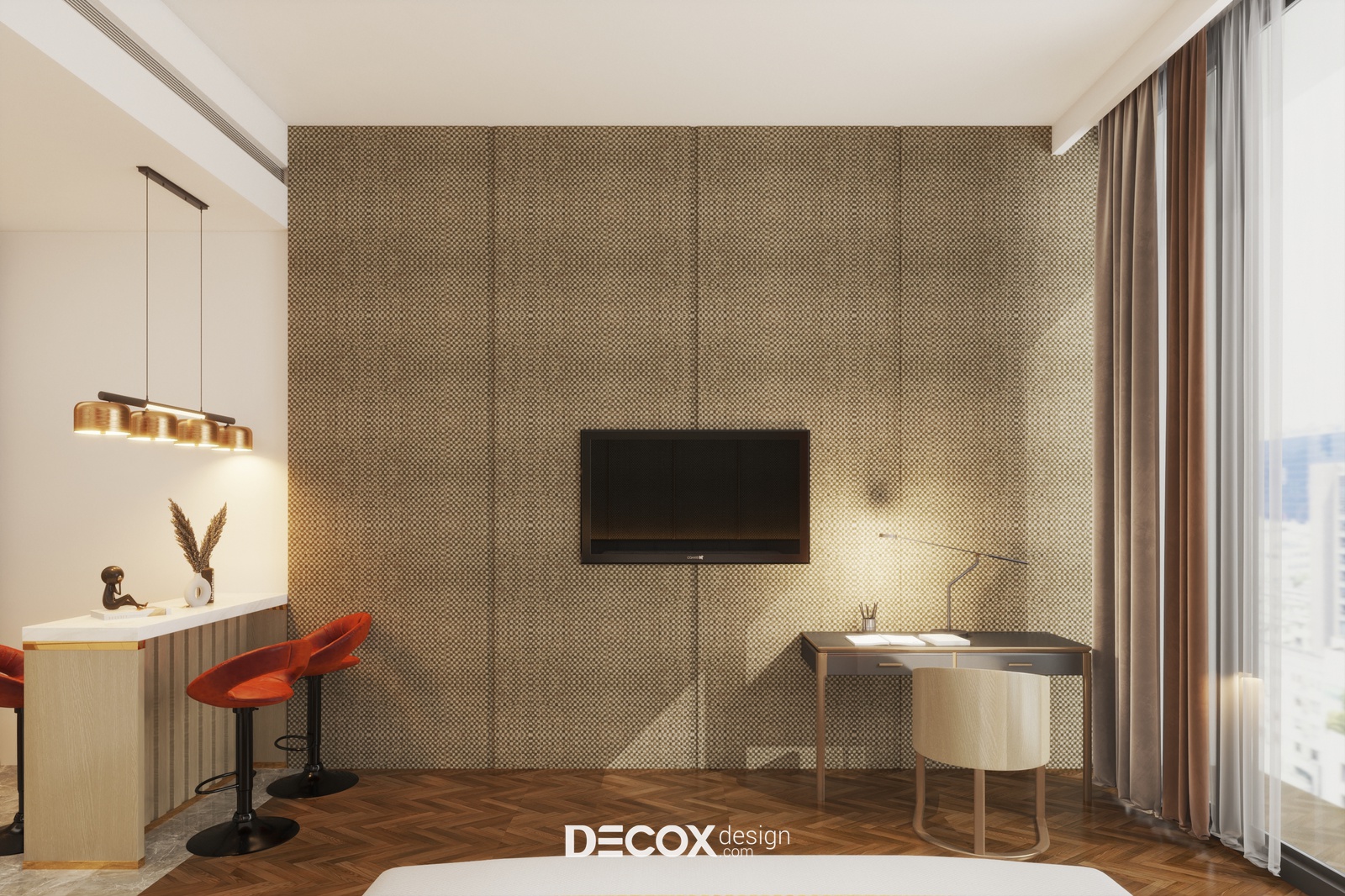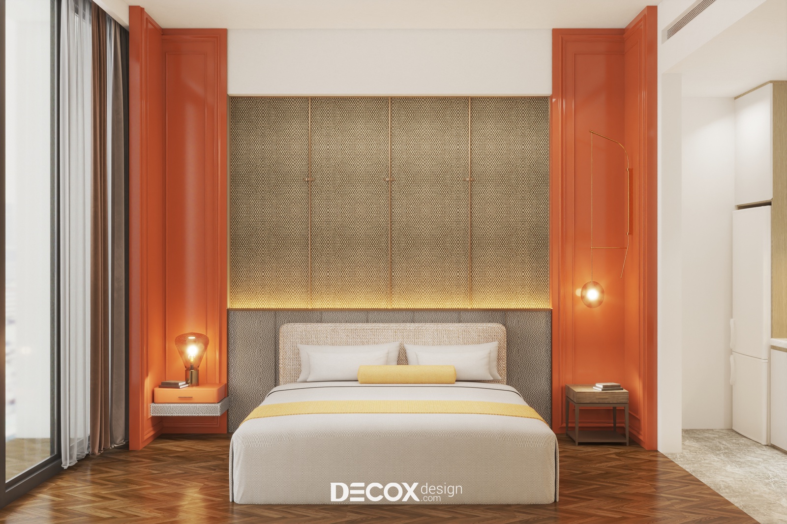 Một dự án thiết kế nội thất căn hộ dịch vụ theo phong cách hiện đại sẽ được Decox Design bật mí trong bài viết dưới đây. Tuy chỉ sở hữu diện tích vỏn vẹn 40m2 nhưng căn hộ vẫn phô diễn hoàn hảo nét sinh động, trẻ trung và tràn đầy sức sống với sự kết hợp của những tone màu ấm nóng như cam, vàng và tone màu của gỗ nhấn điểm trên nền tường trắng. Thiết kế mở giữa không gian nghỉ ngơi, làm việc và bếp nấu kết hợp cùng cửa kính full trần được ứng dụng như một giải pháp giúp căn hộ thêm thoáng đãng và rộng rãi. Ngoài ra, để tăng thêm tính ấn tượng cho không gian nghỉ ngơi, các nhà thiết kế đã bổ sung thêm vách ốp tường được đan lát từ chất liệu tự nhiên gợi cảm giác gần gũi, ấm áp ở khu vực đầu giường và khu vực tivi. Sau đây, mời bạn cùng tham quan những không gian bên trong căn hộ dịch vụ này nhé.