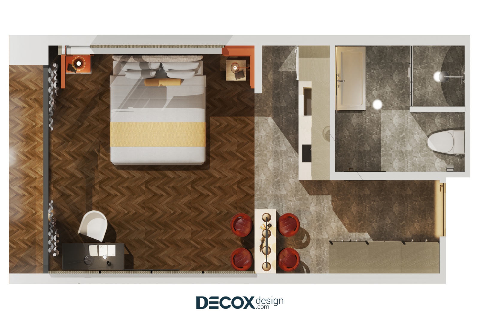Về tổng thể, thiết kế nội thất căn hộ dịch vụ được chia thành 2 không gian chính, một dành cho việc nghỉ ngơi - ăn uống và một dành cho việc thư giãn - vệ sinh cá nhân. Hai không gian này được phân tách khéo léo thông qua cách bố trí nội thất và sắp xếp công năng. Với không gian nghỉ ngơi, các KTS chỉ bố trí những nội thất cơ bản và cần thiết để tối ưu diện tích sử dụng và tạo sự thoải mái trong việc di chuyển, sinh hoạt của người sử dụng. Tuy nội thất chỉ bao gồm giường ngủ, tủ đầu giường, bàn làm việc và tivi treo tường đơn giản nhưng phòng vẫn đem đến sức hút riêng biệt nhờ vào cách phối trộn màu sắc khá táo bạo. Ở đây, KTS đã chọn lựa những tone màu nóng như một điểm nhấn mới lạ trên nền tường trung tính, ngoài ra sắc màu của gỗ đóng vai trò như một chất xúc tác giúp cân bằng và hài hòa không gian.