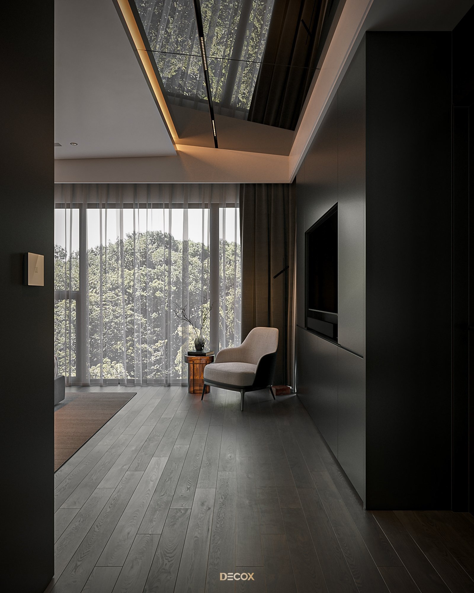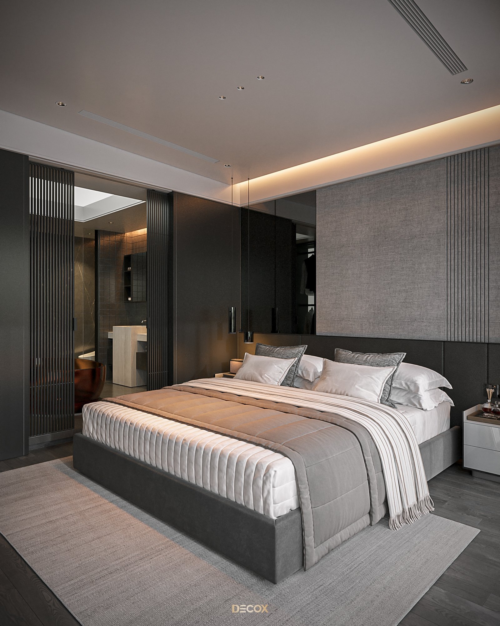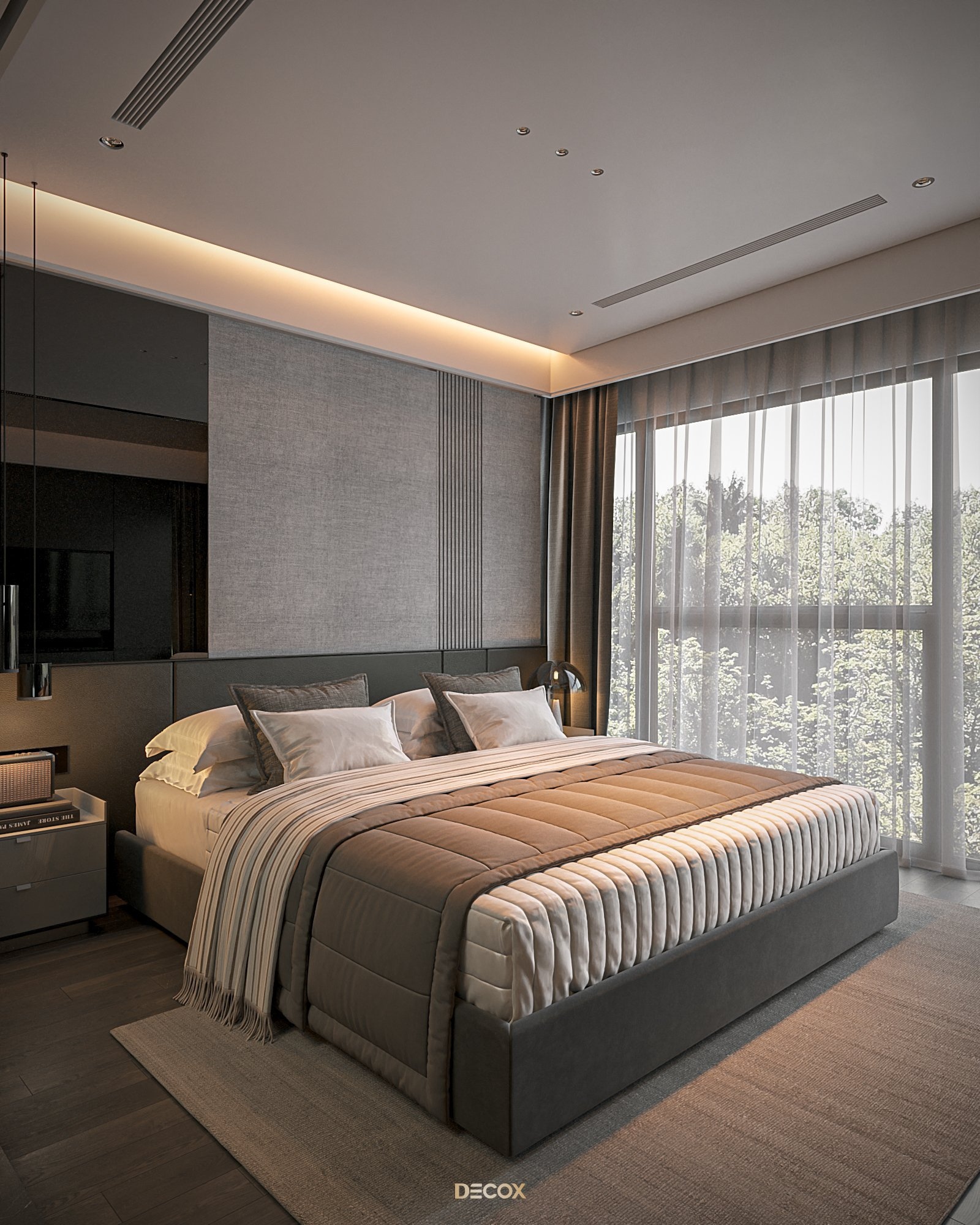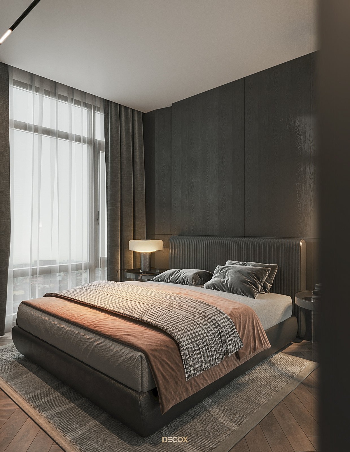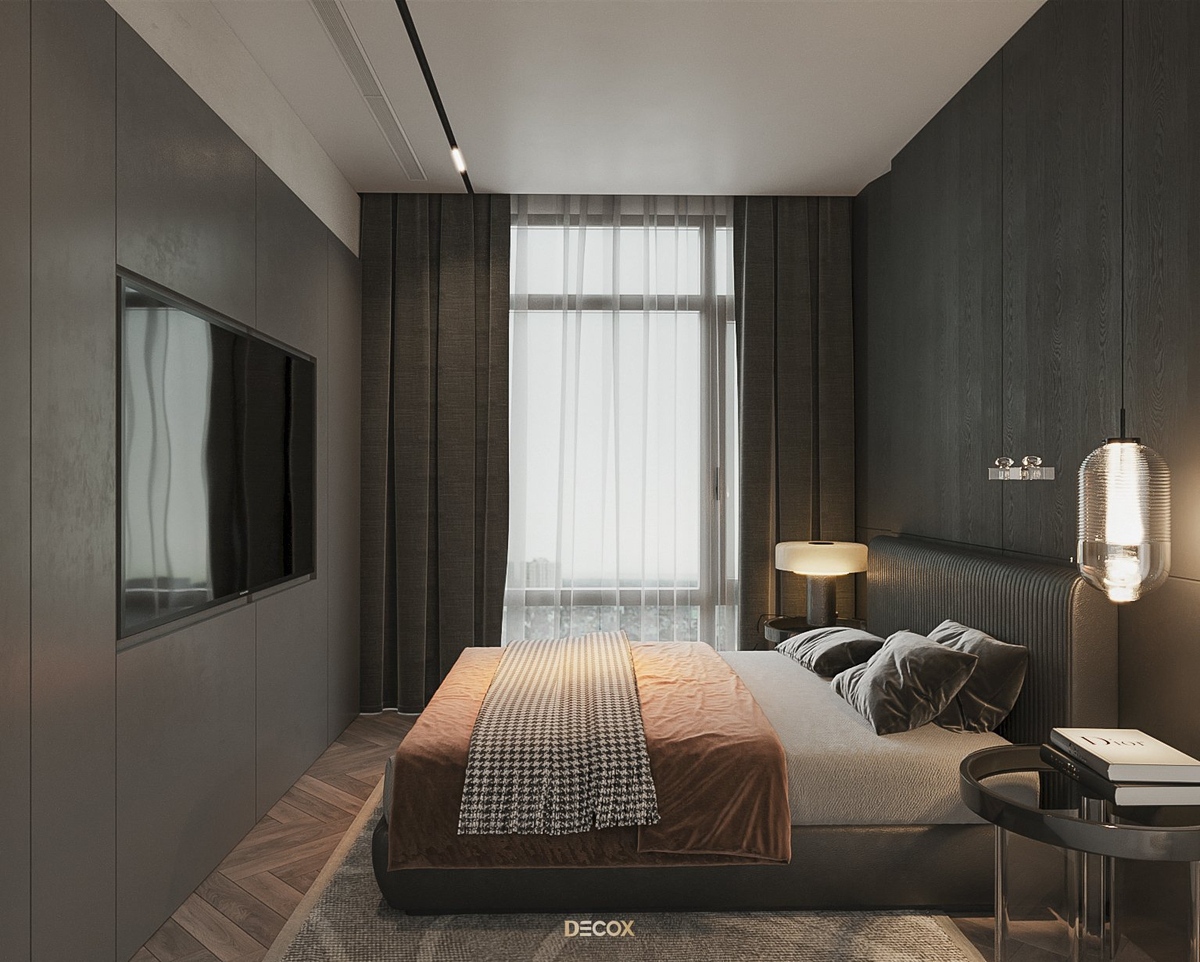 Cảm hứng thiết kế nội thất của căn hộ cao cấp này đến từ sở thích và phong cách sống của chủ nhân. Là một người hoạt động trong lĩnh vực công nghệ, anh yêu thích sự yên tĩnh trong chính không gian sống của mình. Hiểu được mong muốn của khách hàng, KTS Decox đã tư vấn và chọn lựa phong cách hiện đại với các đường nét, hình khối gãy gọn, khúc chiết đặc trưng cùng bảng màu trung tính chủ đạo, đặc biệt là tone xám và đen để mang đến vẻ đẹp thanh lịch, cá tính cho căn hộ.