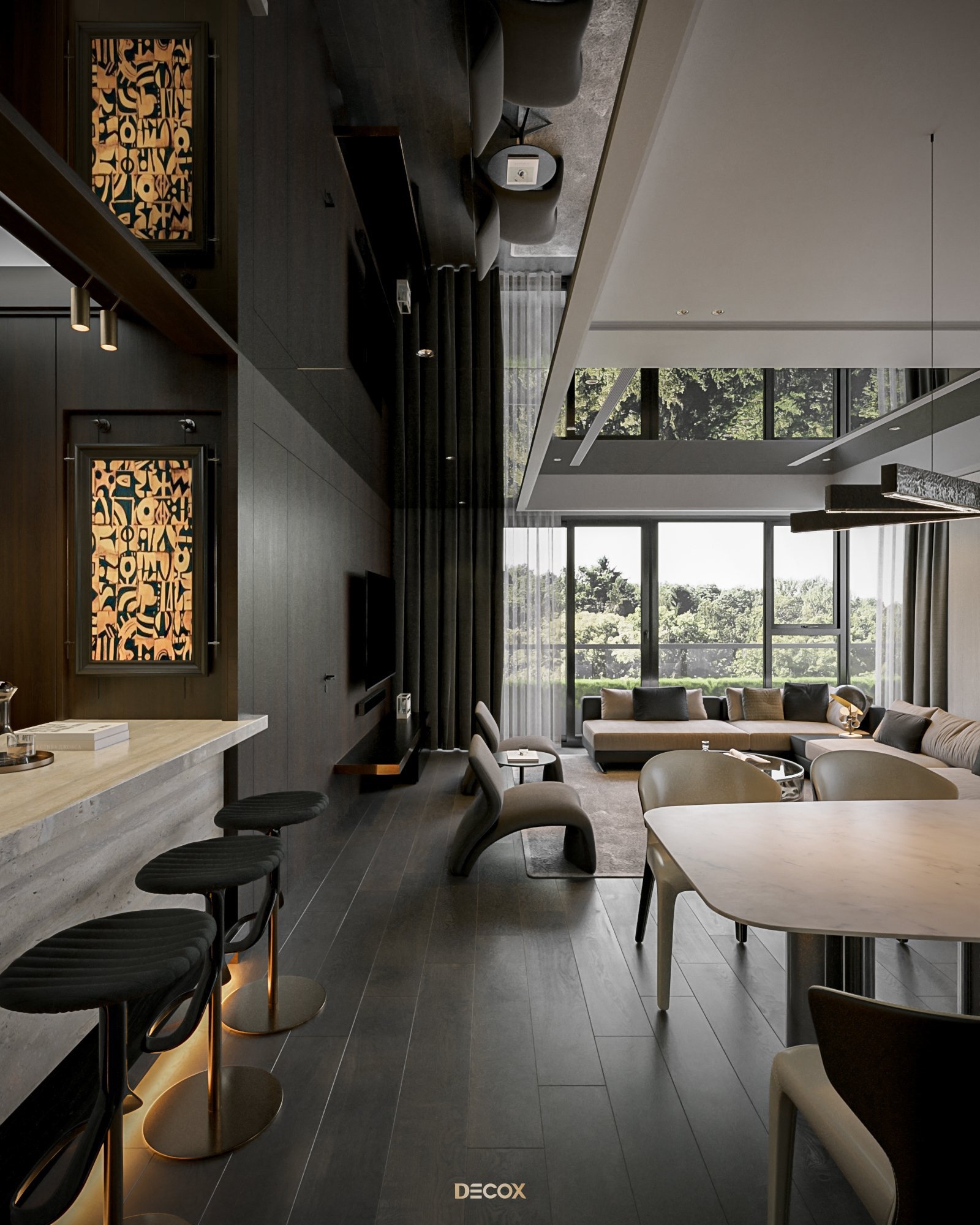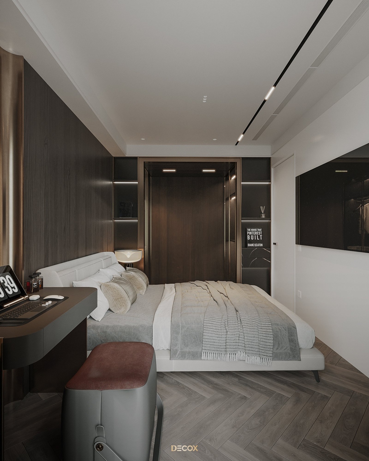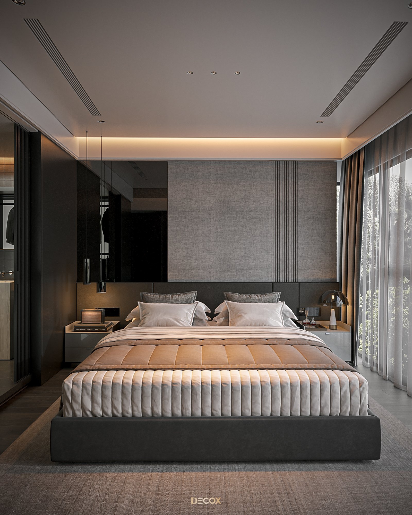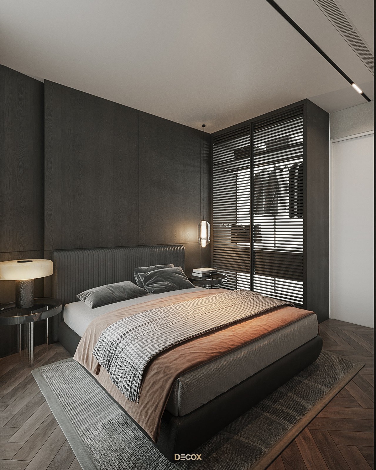 Cảm hứng thiết kế nội thất của căn hộ cao cấp này đến từ sở thích và phong cách sống của chủ nhân. Là một người hoạt động trong lĩnh vực công nghệ, anh yêu thích sự yên tĩnh trong chính không gian sống của mình. Hiểu được mong muốn của khách hàng, KTS Decox đã tư vấn và chọn lựa phong cách hiện đại với các đường nét, hình khối gãy gọn, khúc chiết đặc trưng cùng bảng màu trung tính chủ đạo, đặc biệt là tone xám và đen để mang đến vẻ đẹp thanh lịch, cá tính cho căn hộ.