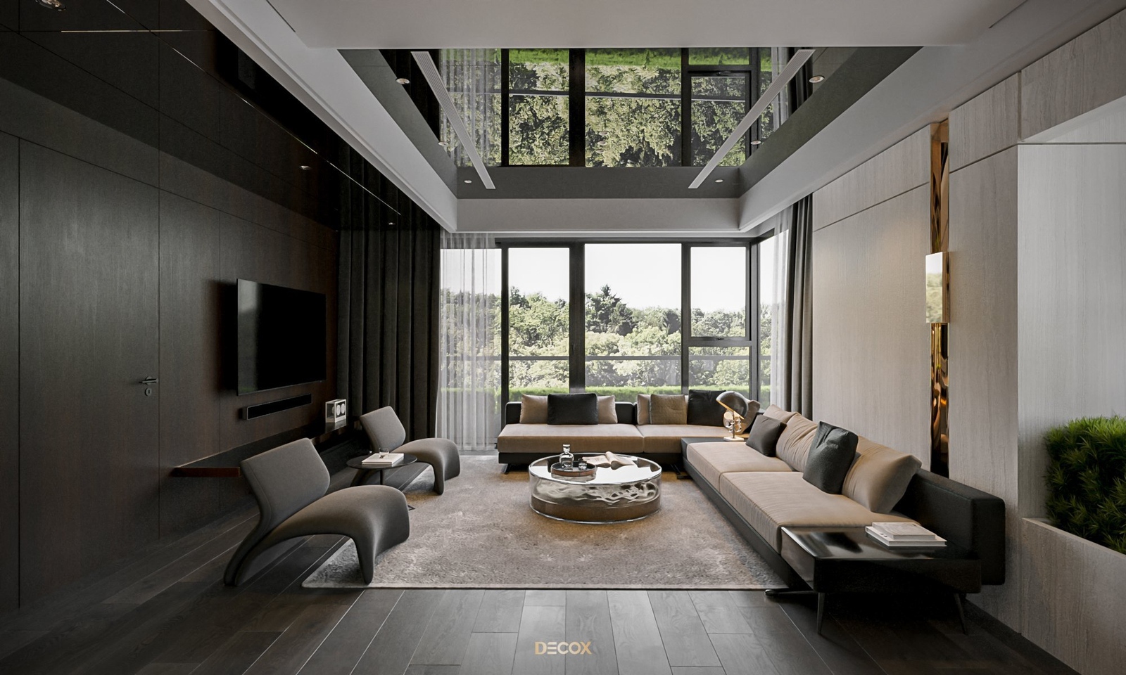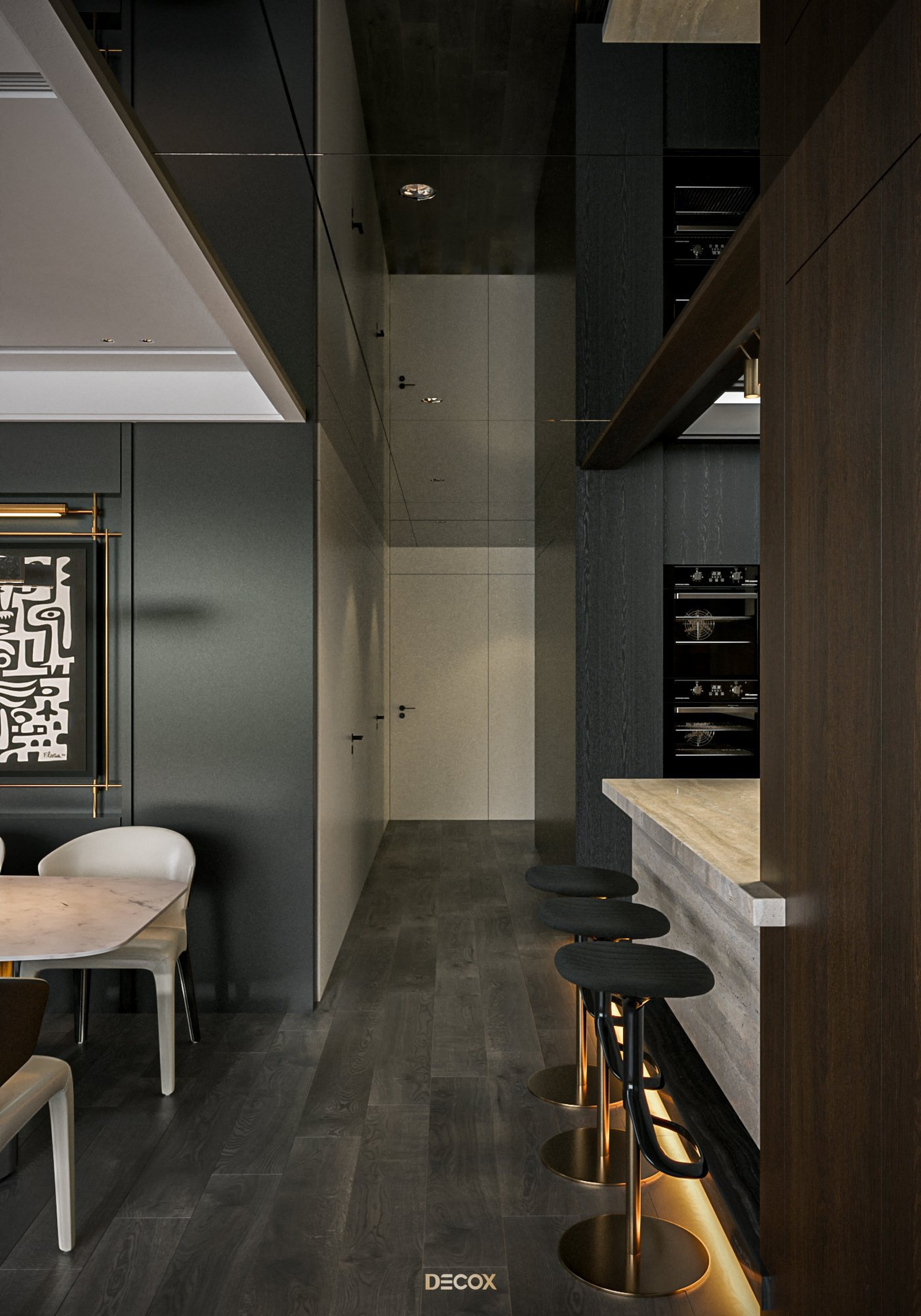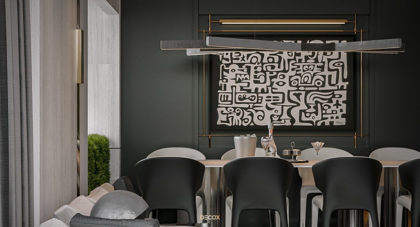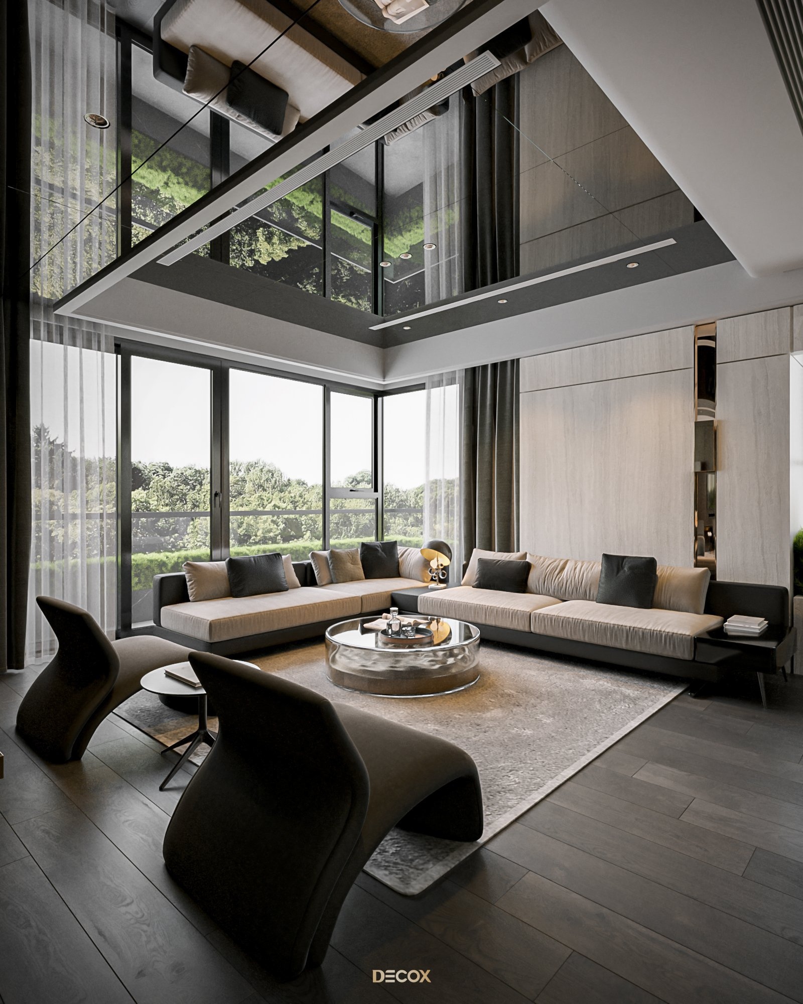 Cảm hứng thiết kế nội thất của căn hộ cao cấp này đến từ sở thích và phong cách sống của chủ nhân. Là một người hoạt động trong lĩnh vực công nghệ, anh yêu thích sự yên tĩnh trong chính không gian sống của mình. Hiểu được mong muốn của khách hàng, KTS Decox đã tư vấn và chọn lựa phong cách hiện đại với các đường nét, hình khối gãy gọn, khúc chiết đặc trưng cùng bảng màu trung tính chủ đạo, đặc biệt là tone xám và đen để mang đến vẻ đẹp thanh lịch, cá tính cho căn hộ.