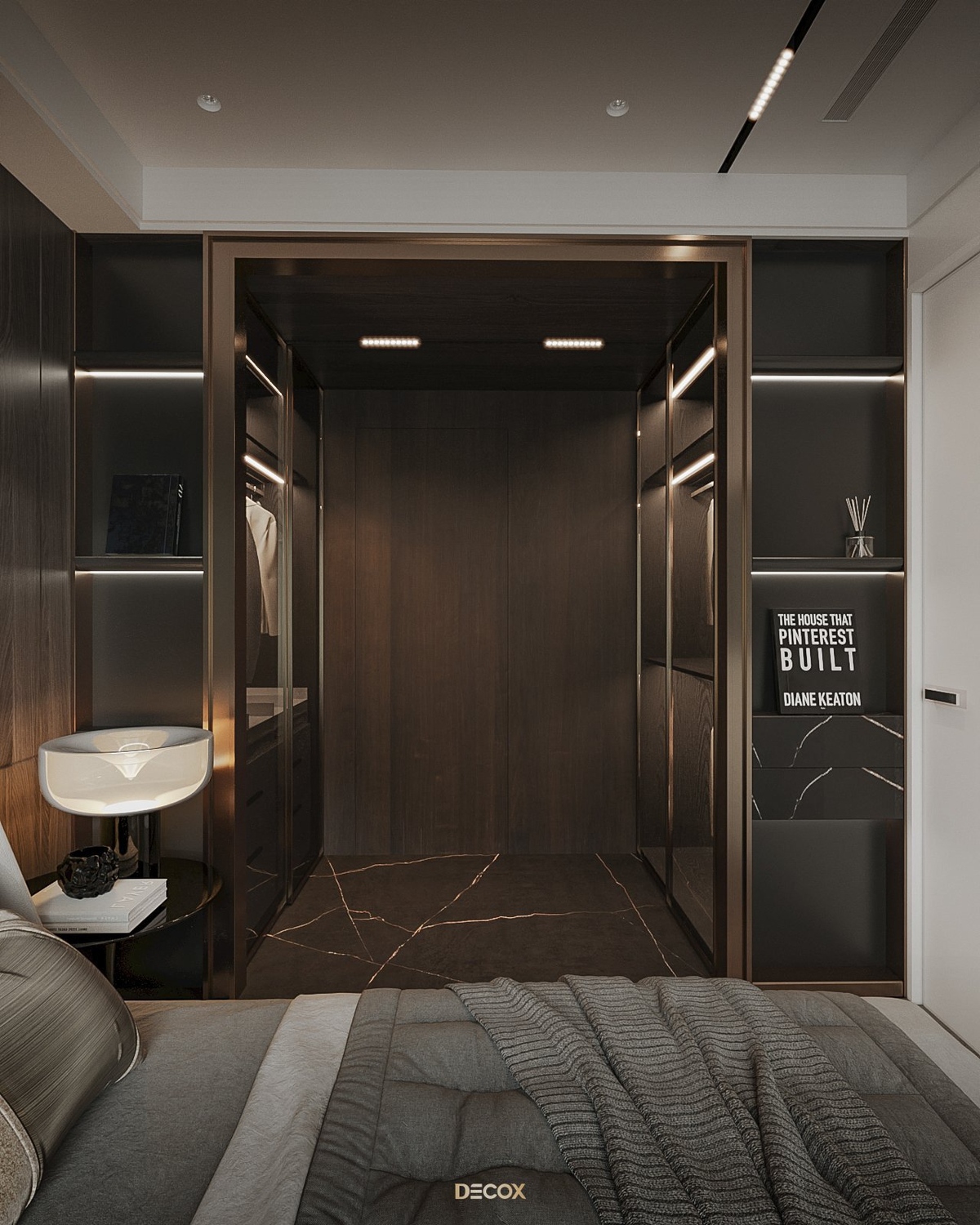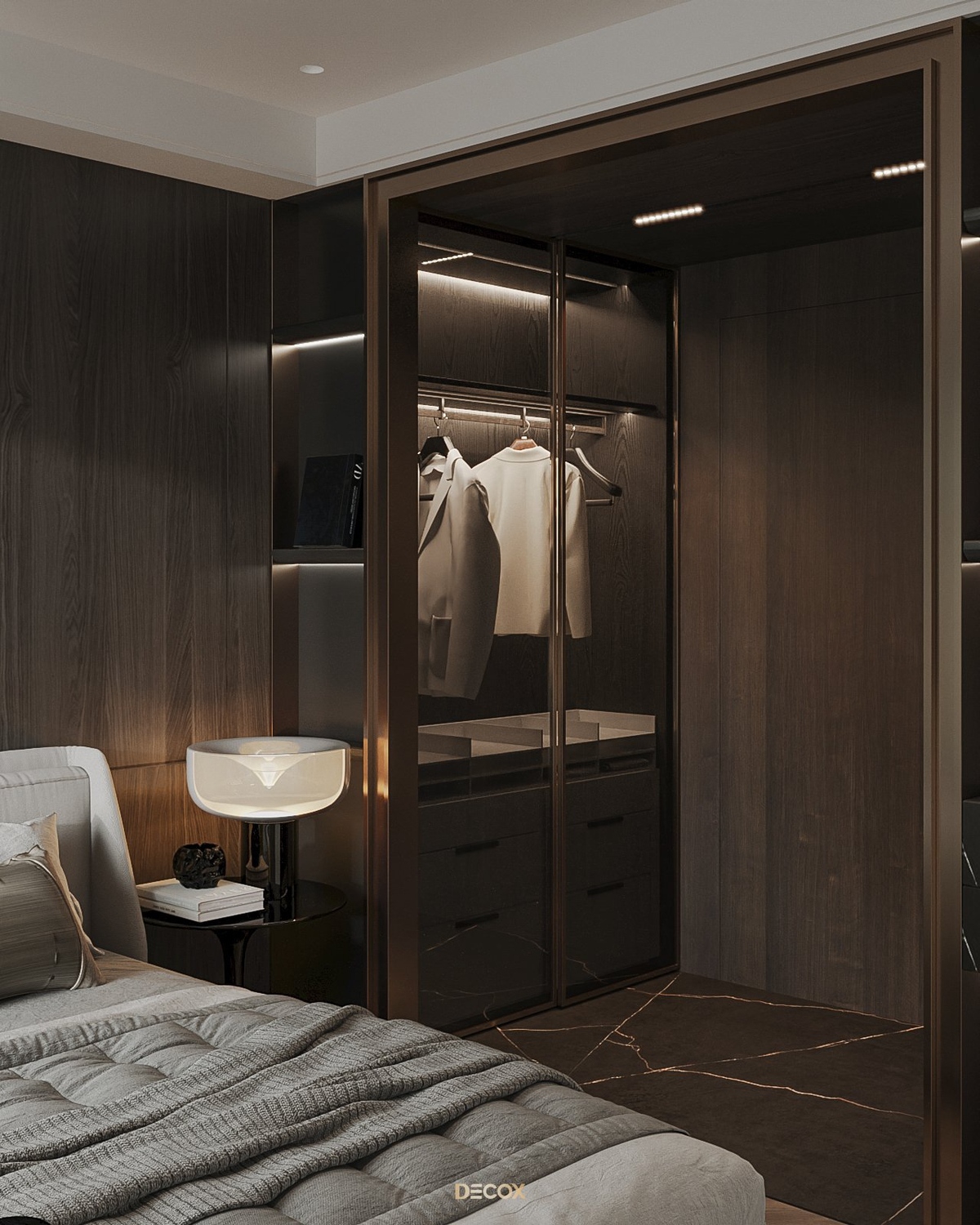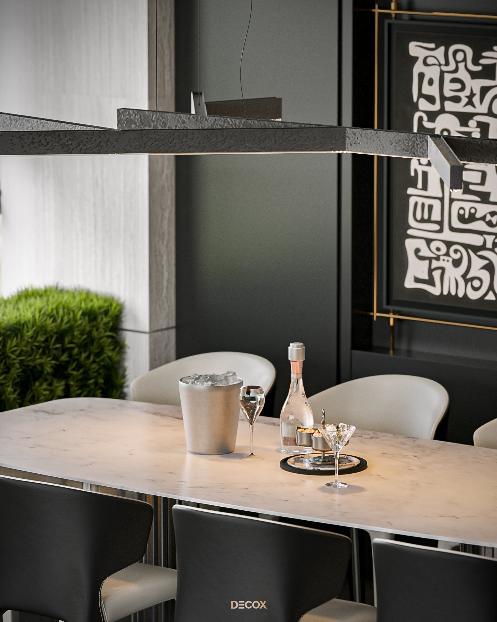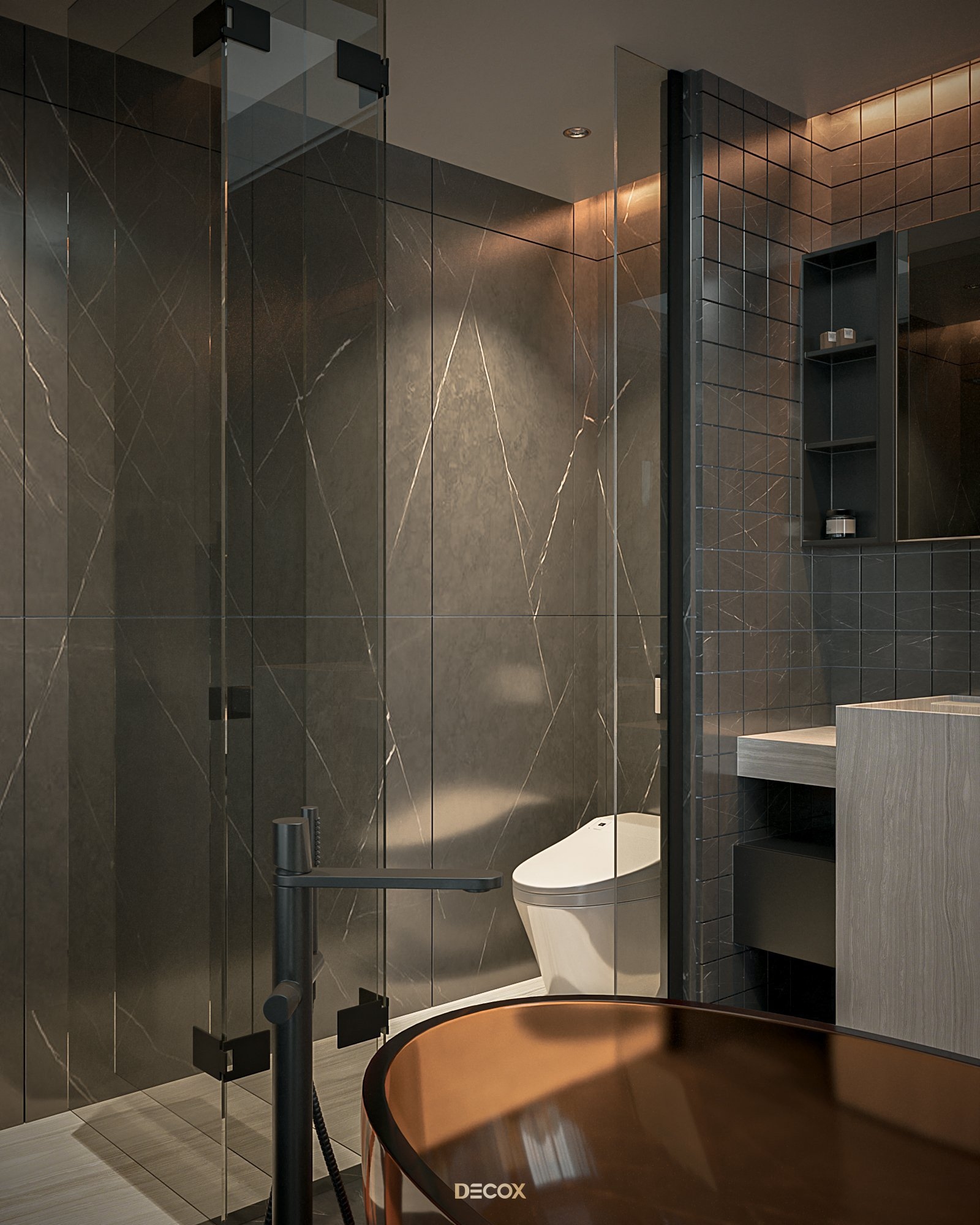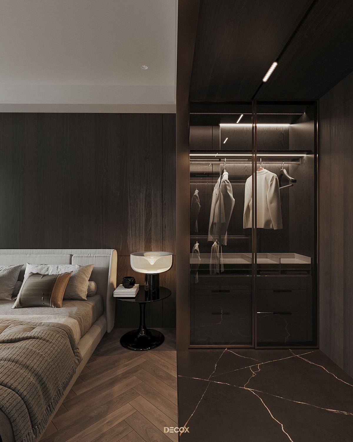 Cảm hứng thiết kế nội thất của căn hộ cao cấp này đến từ sở thích và phong cách sống của chủ nhân. Là một người hoạt động trong lĩnh vực công nghệ, anh yêu thích sự yên tĩnh trong chính không gian sống của mình. Hiểu được mong muốn của khách hàng, KTS Decox đã tư vấn và chọn lựa phong cách hiện đại với các đường nét, hình khối gãy gọn, khúc chiết đặc trưng cùng bảng màu trung tính chủ đạo, đặc biệt là tone xám và đen để mang đến vẻ đẹp thanh lịch, cá tính cho căn hộ.