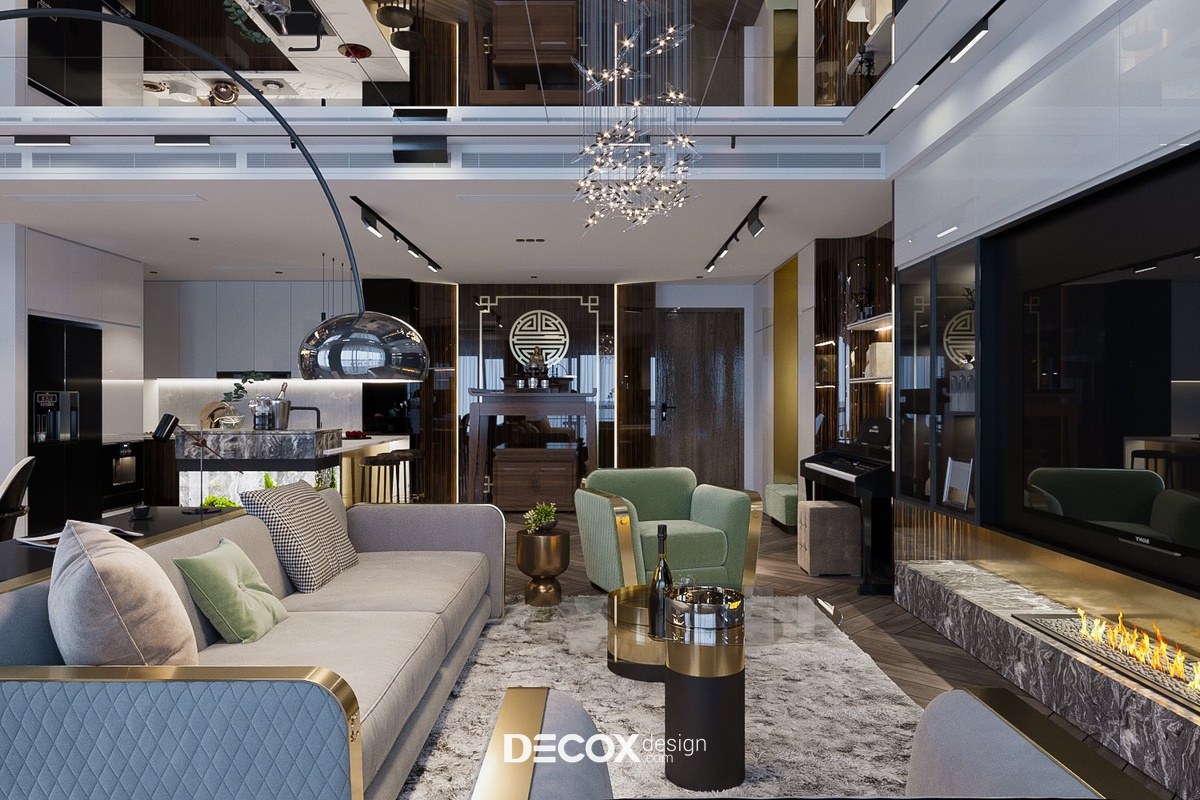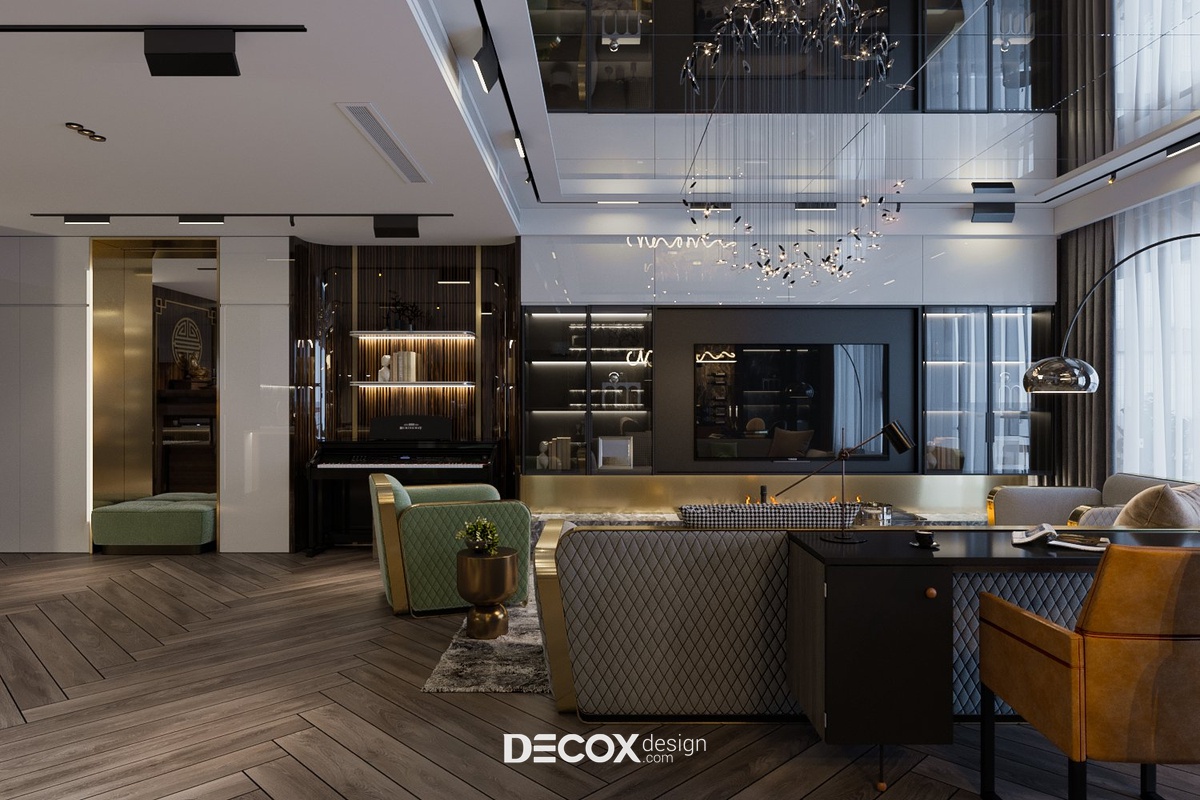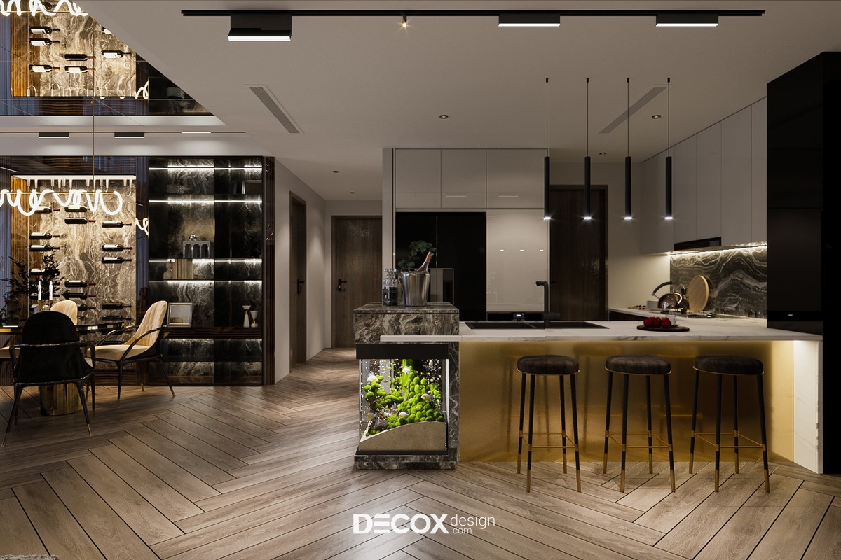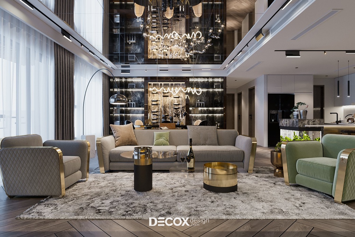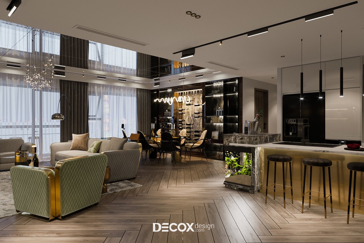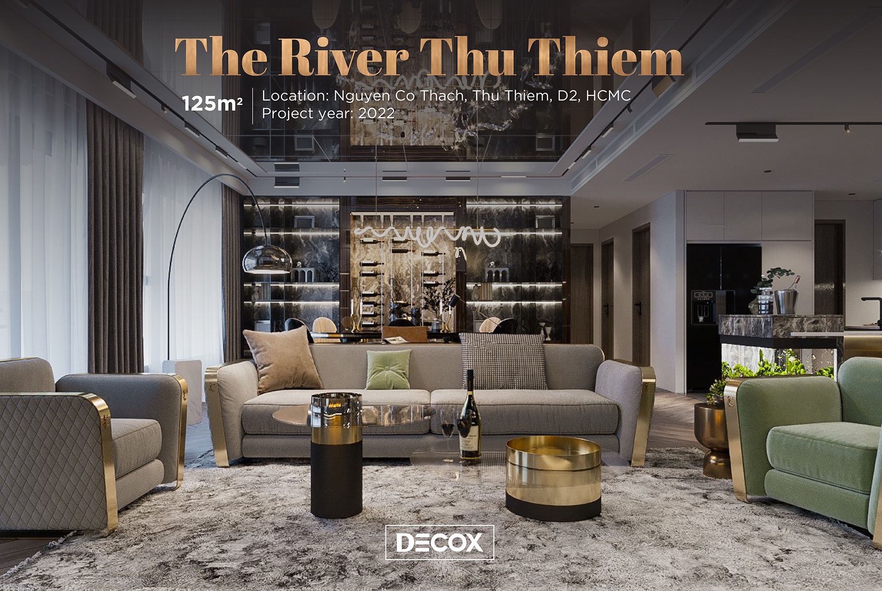 Luxury - Phong cách thời thượng nhất hiện nay đã được Decox Design ứng dụng vào tổ ấm rộng 125m2 tại The River Thủ Thiêm. Với ý tưởng dùng chất liệu giàu tính phản chiếu để “thắp sáng” tổ ấm KTS đã sử dụng kết hợp nhiều chất liệu như kim loại, đá, pha lê, thủy tinh và các chi tiết mạ vàng để trang hoàng không gian sống.