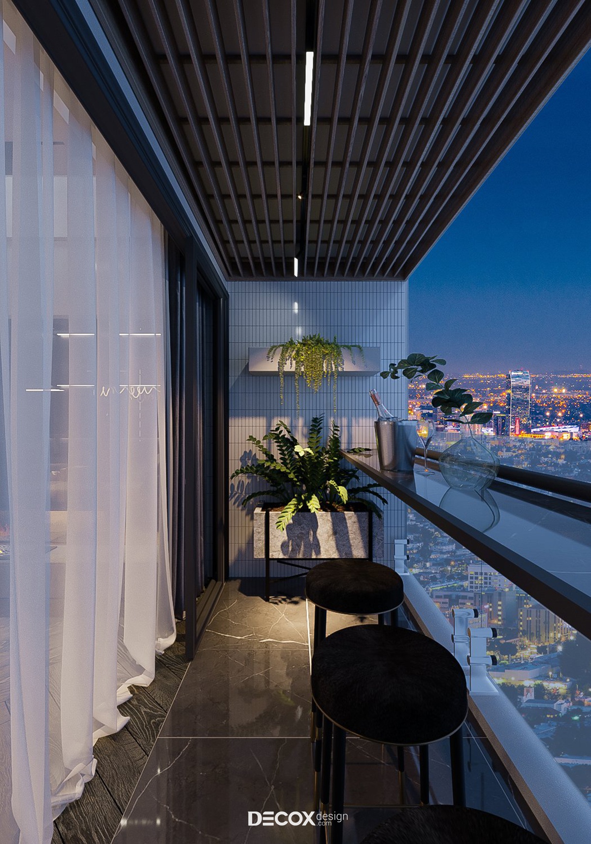 Diện tích ban công chung cư thường không quá ấn tượng nên nhiều gia chủ đã xem nhẹ và bỏ qua không gian này. Tuy nhiên, với dự án này Decox đã tận dụng hết mọi ngóc ngách để có thể biến ban công thành một quầy bar cực “chill” để cả gia đình có thể cùng nhau ăn uống, trò chuyện và ngắm nhìn thành phố tuyệt đẹp về đêm.