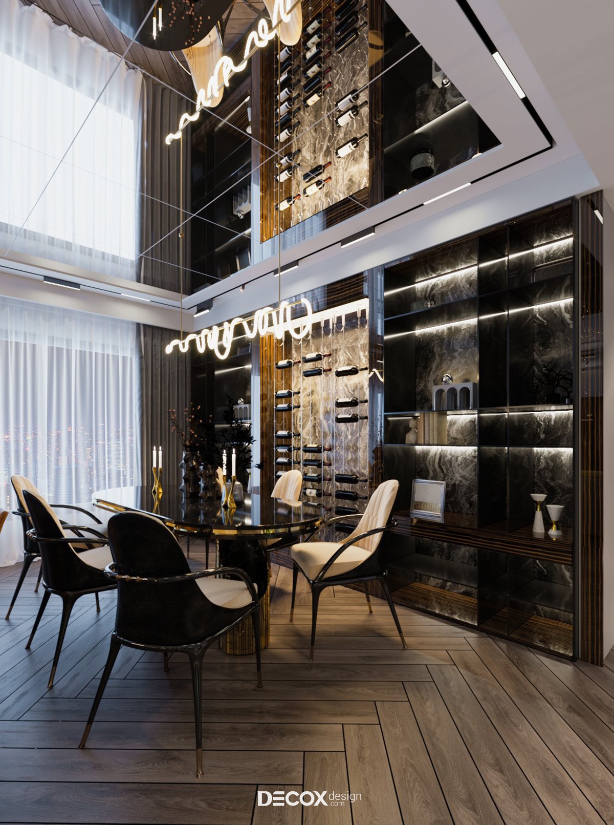 Bộ bàn ăn oval mặt kính sang trọng sở hữu màu sắc đồng điệu với các không gian khác, đồng thời cũng đầy duyên dáng với đường nét mềm mại, uyển chuyển. Không dừng lại ở đó, mọi giá trị về thẩm mỹ đã không ngừng tăng lên khi có sự xuất hiện của tủ rượu hiện đại lịch lãm và bộ đèn thả độc đáo trên nền trần gương… tất cả đã bộc lộ trọn vẹn vẻ đẹp phong lưu, tinh tế của khu vực dùng bữa.