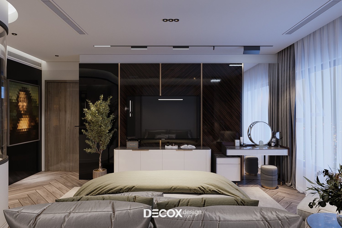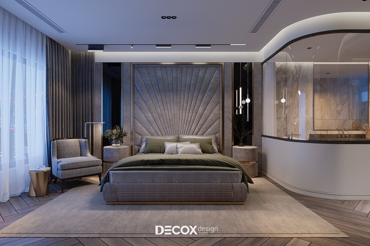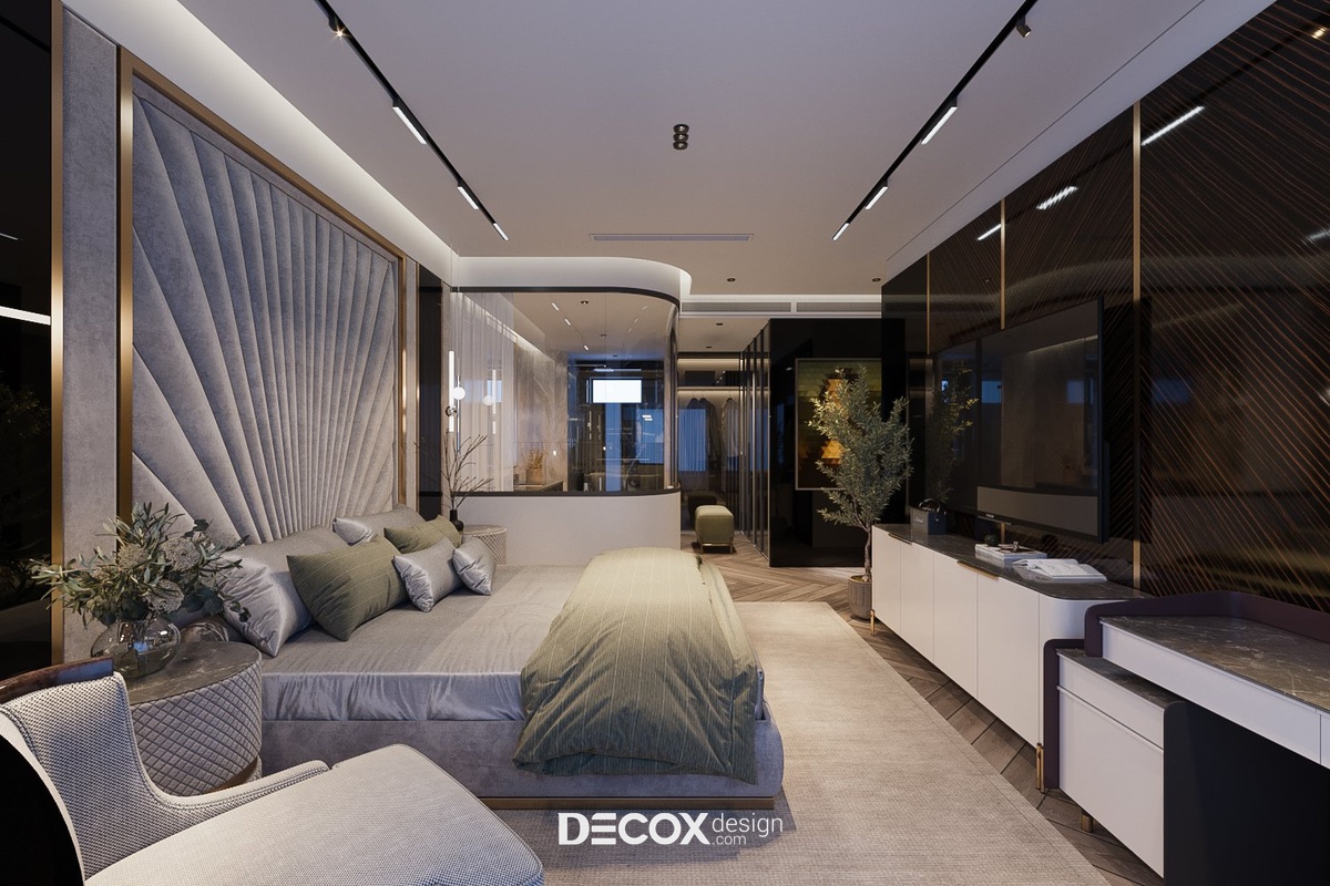 Tại phòng ngủ master, ngoài vẻ đẹp cá tính, sang trọng và lịch lãm được theo đuổi ở xuyên suốt concept thì sự mới mẻ cũng là yếu tố tạo nên giá trị căn hộ. Điều này thể hiện rõ nét thông qua việc xóa bỏ ranh giới của các không gian như giường ngủ, phòng tắm và phòng thay đồ. Qua tầm nhìn, mọi không gian đều được kết nối uyển chuyển với nhau, có thể nói, lối sắp đặt phá cách này như một làn gió mới thổi sự đặc sắc vào tổ ấm, biến phòng ngủ đơn thuần trở nên sống động và thượng lưu hơn.