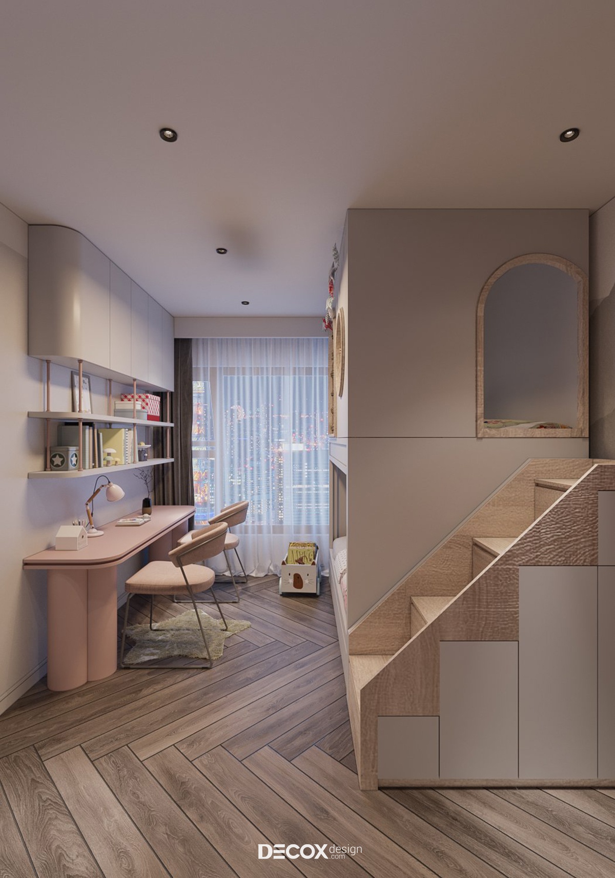 Vẫn giữ tone màu trung tính chủ đạo để đồng nhất với tổng thể, tuy nhiên, cân nhắc trên sở thích cùng lứa tuổi của các bé, KTS đã tiết chế gam xám và điểm xuyết thêm gam hồng pastel dễ thương cùng sắc màu của gỗ để cân bằng không gian. Về tổng thể, không gian phòng ngủ của bé được tổ chức theo chuẩn mực đề cao tính tiện dụng và đa năng hóa nội thất. Cụ thể, giường tầng được bố trí nằm gọn về một góc. Đối diện chính là hệ thống bàn học thẩm mỹ và ngăn nắp. Điểm cộng của không gian này chính là các vật dụng đều được bố trí theo chiều dọc và tránh dàn trải theo chiều ngang. Nguyên tắc này giúp tiết kiệm không gian và tăng khả năng lưu trữ rất hiệu quả.