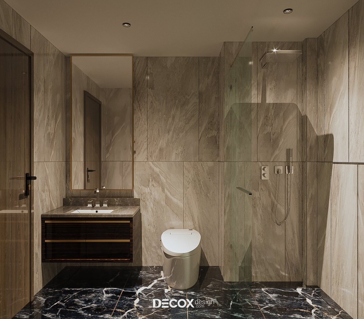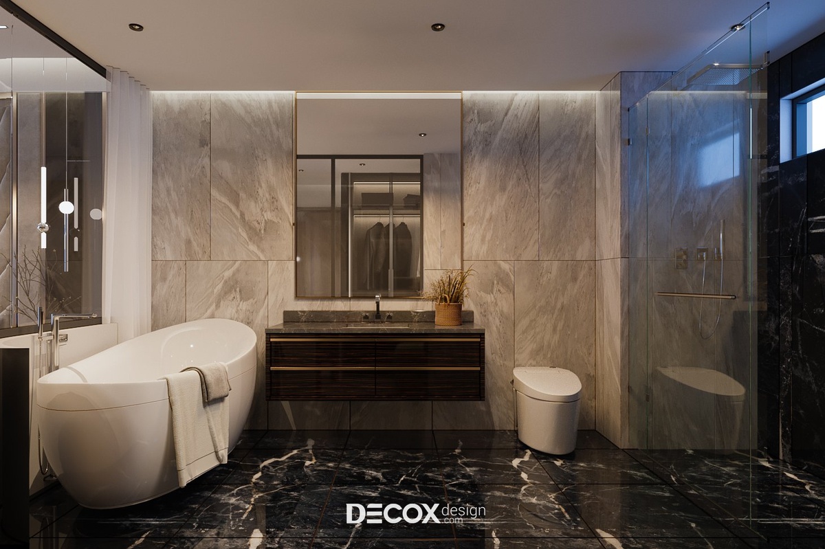 Sự phối ngẫu hài hòa giữa hai tone màu tương phản đã góp phần kích thích thị giác giúp không gian WC thêm phần bắt mắt, ấn tượng. Để đề cao tinh thần sang trọng, chuẩn thượng lưu của phong cách Luxury, thiết kế đã dùng chất liệu đá marble cao cấp xuyên suốt không gian từ tường đến sàn và đồ nội thất.