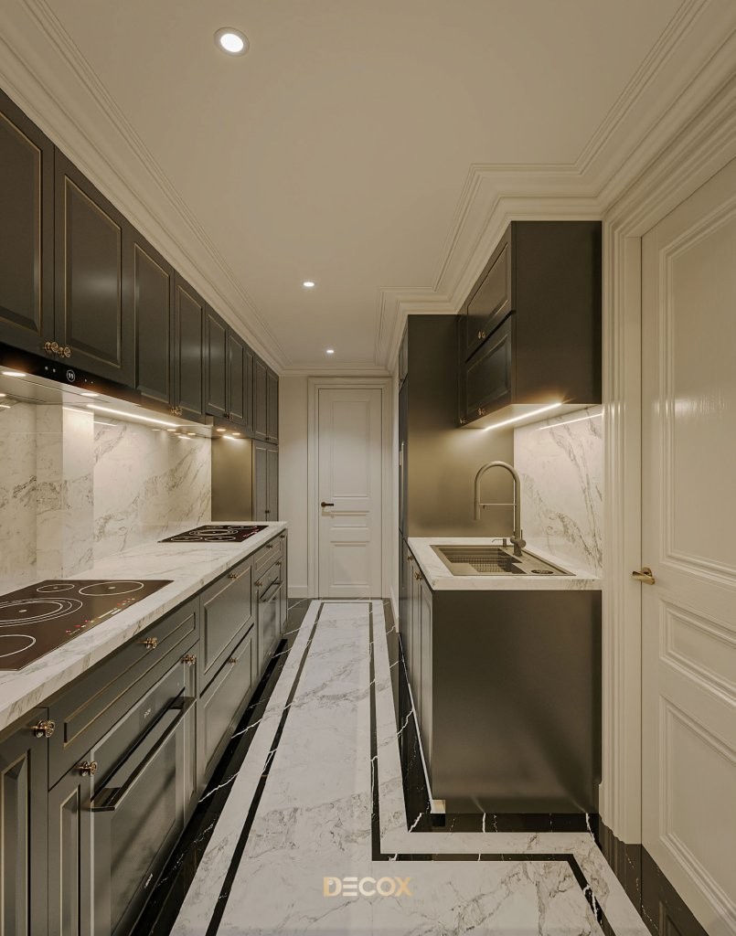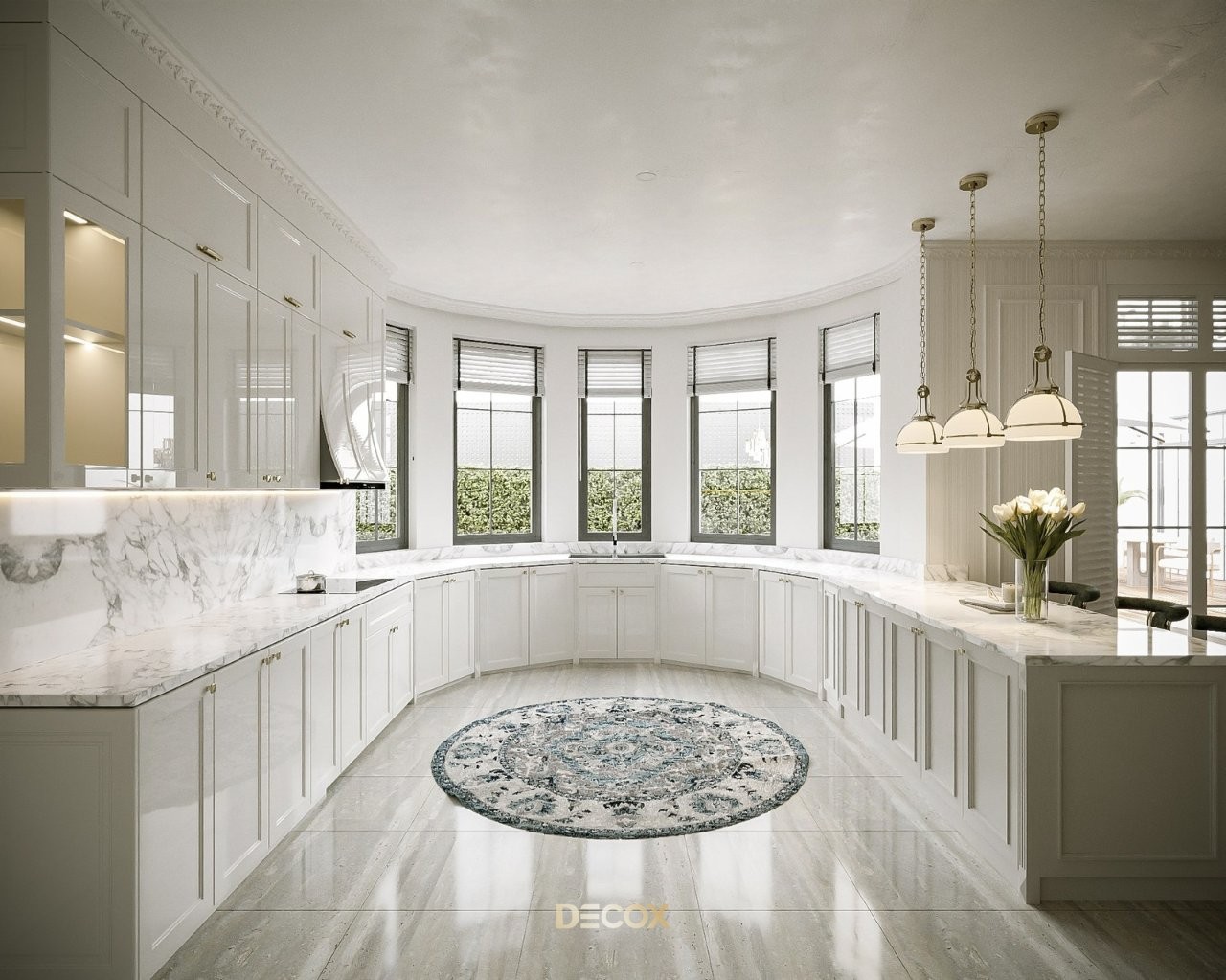 Không gian nội thất, nhà phố 4 tầng Tân cổ điển tận dụng ưu thế của "hệ nhiều lớp", phòng khách tại tầng trệt được thiết kế như một đại sảnh tiếp đón với đèn chùm pha lê và những mảng tường trang trí cầu kỳ. Trong khi đó, các tầng trên được chuyển tiếp với chất liệu gỗ tự nhiên và các chi tiết mạ vàng điểm xuyết, giữ được sự tiện nghi, linh hoạt cho nhịp sống hiện đại. Nghệ thuật điều phối ánh sáng tích hợp hệ thống giếng trời, dẫn dắt ánh sáng len lỏi qua các khoảng thông tầng, tôn vinh chất liệu nội thất. Trên cùng của trục đứng kiến trúc, khu vực phòng thờ được thiết kế tĩnh tại và trang nghiêm, hòa quyện cùng giải pháp kiến trúc xanh hiện đại, trở thành một di sản sống, nơi vẻ đẹp cổ điển và sự bình an luôn hiện hữu bền vững.