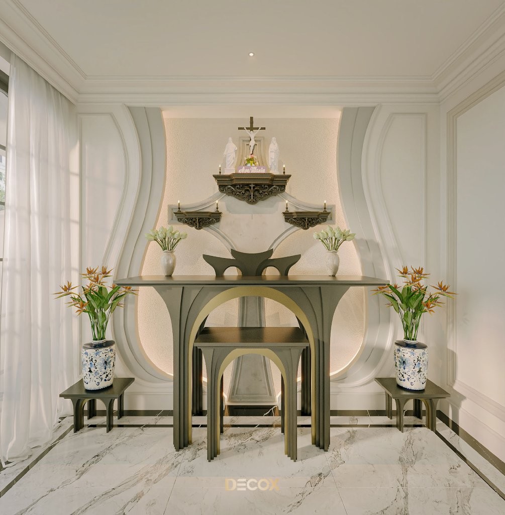 Trong cấu trúc nhà phố 4 tầng, thiết kế phòng thờ tọa lạc tại tầng cao nhất của trục đứng kiến trúc, tích hợp các hệ cửa thông gió tự nhiên hoặc kết nối trực tiếp với giếng trời, tách biệt hoàn toàn các tầng sinh hoạt bên dưới. Về nội thất, phòng thờ nhà ống 4 tầng đòi hỏi sự hòa quyện giữa nét đẹp truyền thống và ngôn ngữ kiến trúc hiện đại. Mọi chi tiết nội thất, các hệ vách CNC gỗ tự nhiên, kết hợp cùng bàn thờ có đường nét tinh giản đều được chuẩn hóa về kích thước và màu sắc. Đồng thời, nghệ thuật sắp đặt ánh sáng vàng ấm có chiều sâu được tính toán kỹ lưỡng để tôn vinh chất liệu gỗ trầm ấm, biến nơi đây thành một "trạm kết nối" thiêng liêng giữa hiện tại và cội nguồn.