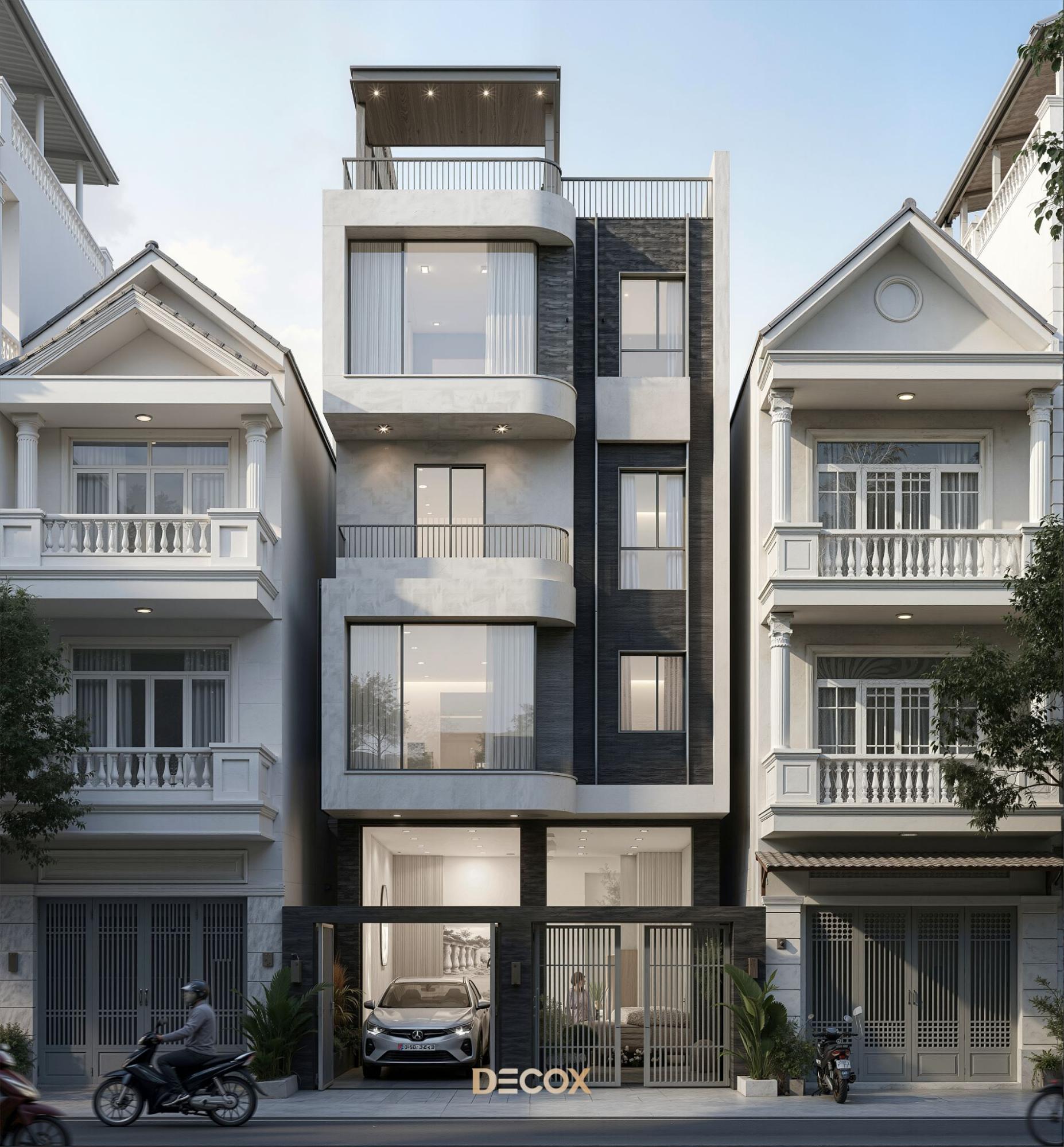 Trong kiến trúc nhà phố 4 tầng, phong cách Tân cổ điển phát triển mạnh theo trục đứng, với hệ thống cột trụ uy nghi, những ô cửa vòm thanh thoát và những đường phào chỉ được chế tác tỉ mỉ. Sự kết hợp giữa các vật liệu kinh điển như đá Marble ốp mặt tiền, lan can sắt mỹ thuật tinh xảo và hệ mái Mansard hoặc hệ mái Nhật kiến tạo một diện mạo trường tồn cùng thời gian.