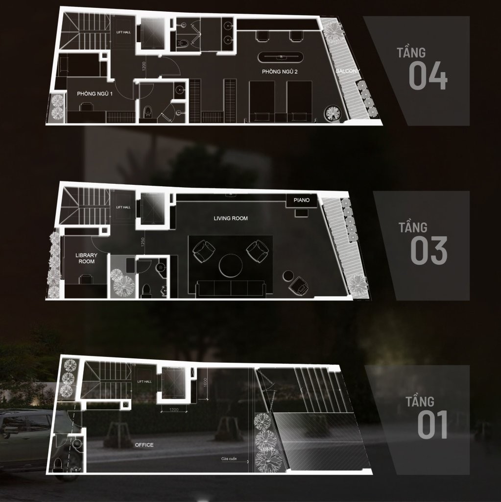 Nội thất nhà phố 4 tầng đương đại đề cao sự tương phản mạnh mẽ giữa các bề mặt, kết hợp cách phối màu trung tính làm nền cho những món đồ nội thất mang vẻ đẹp tinh tế, không bao giờ lỗi mốt. Tận dụng cấu trúc "hệ nhiều lớp", giếng trời dẫn dắt ánh sáng tự nhiên, từ tầng trệt đến sân thượng thư giãn. Đồng thời, các khu vườn treo thông minh hay hồ cá mini tại các khoảng lùi ban công, giải nhiệt cho công trình và kiến tạo một "ốc đảo đương đại" đầy thư thái.