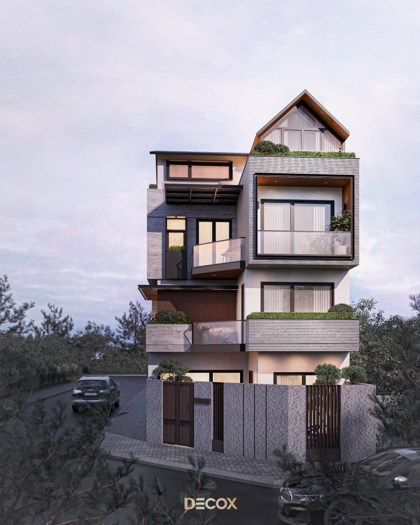 Trong kiến trúc nhà phố 4 tầng, phong cách Đương đại ưu tiên đường nét tự do, các mảng đặc – rỗng được sắp xếp phi đối xứng một cách nghệ thuật. Việc kết hợp các vật liệu mang hơi thở thời đại như gỗ nhựa ngoài trời, tấm ốp sợi xi măng và những mảng kính bo cong mềm mại, xóa bỏ cảm giác đơn điệu của nhà phố cao tầng, tạo nên một diện mạo đầy cá tính, và tư duy cởi mở của gia chủ.