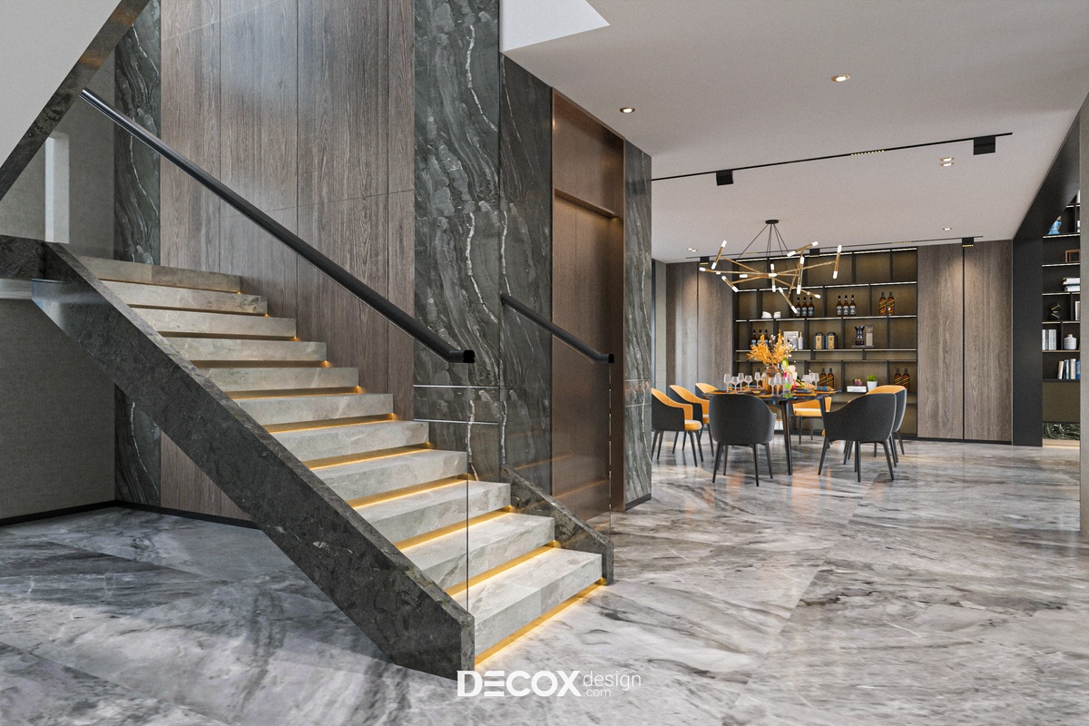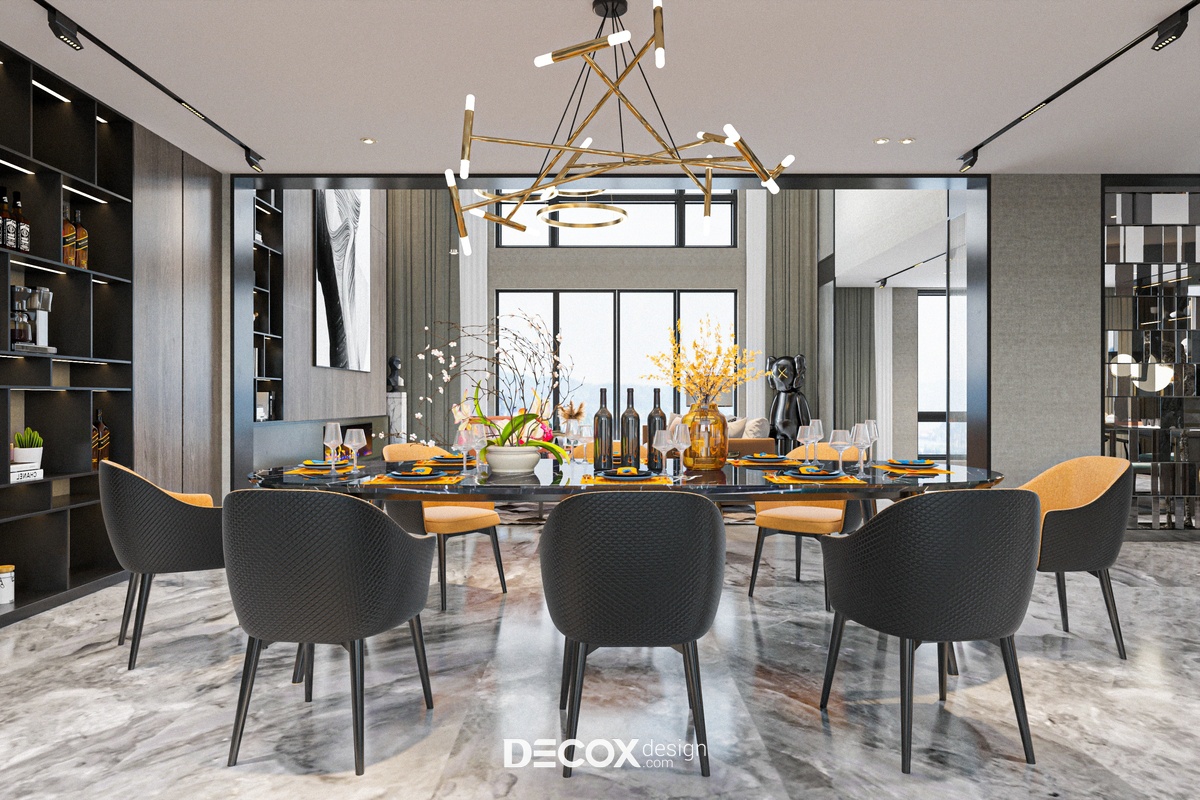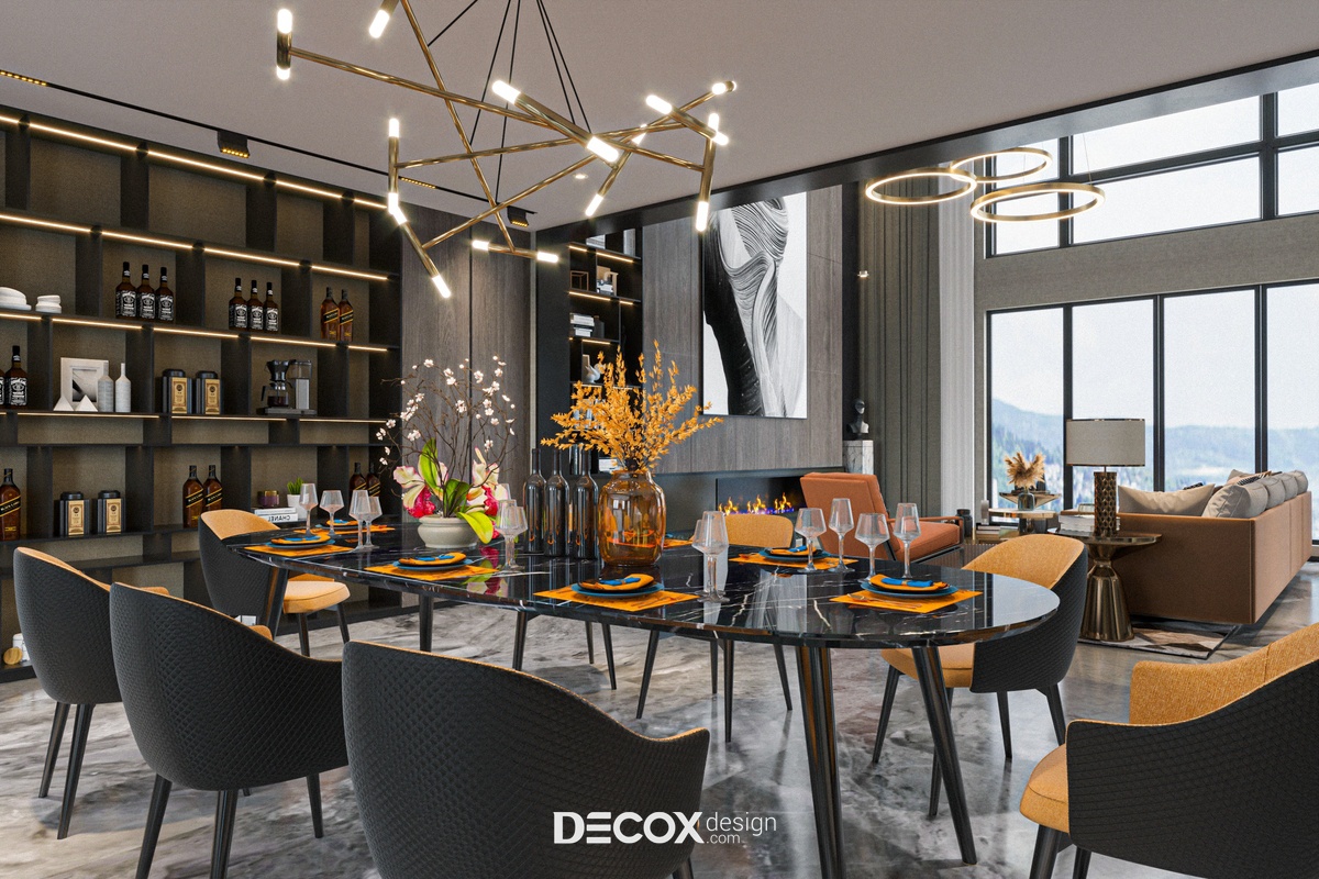 Bên cạnh chất liệu gỗ nhấn điểm trên tường, không gian phòng ăn còn ghi điểm sang trọng bởi chất liệu đá marble tia chớp đen cao cấp được thể hiện ở bộ bàn ăn. Bên cạnh đó KTS đã lựa chọn ghế ăn có bộ đệm tone màu cam nhạt để tạo sự đồng bộ, kết nối ở khu vực phòng khách và phòng ăn. Mặt khác, nhằm thỏa mãn đam mê sưu tầm rượu quý cũng như tạo nên sức hút riêng biệt của khu vực phòng ăn Decox đã bố trí thêm hệ kệ tủ lớn với nhiều ngăn nhỏ, mỗi ngăn sẽ được trang bị đèn led riêng để gia chủ có thể linh hoạt hơn trong việc sắp xếp, phân chia loại rượu.