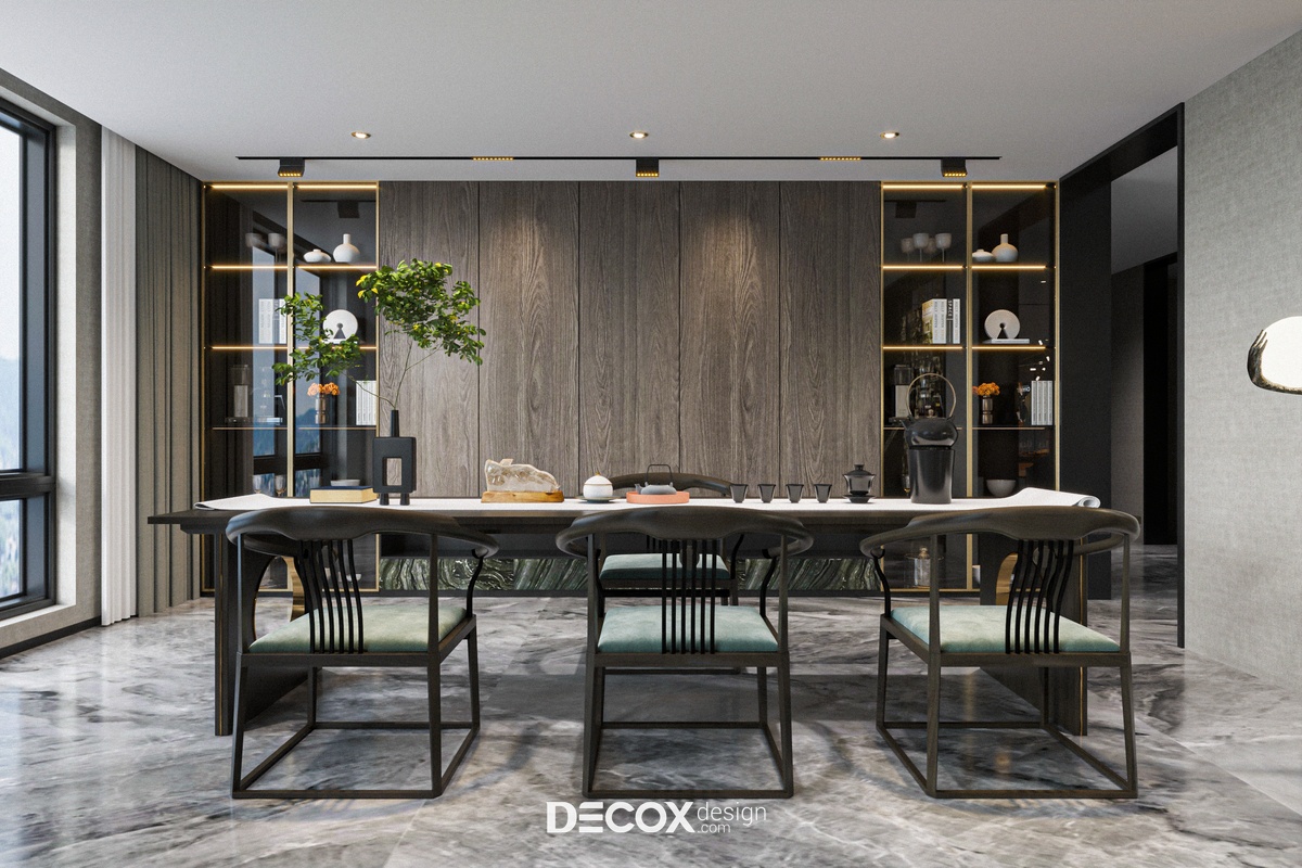 Phía sau ghế sofa là khu vực được thiết kế dành riêng cho việc "trà đạo" của gia đình. Ngoài bàn trà lớn được chế tác từ chất liệu gỗ tự nhiên mộc mạc, bình dị KTS còn bố trí thêm tủ kính với đèn led hắt điểm để gia chủ có thể trưng bày những chiếc bình hay ấm trà vào bộ sưu tập của mình.