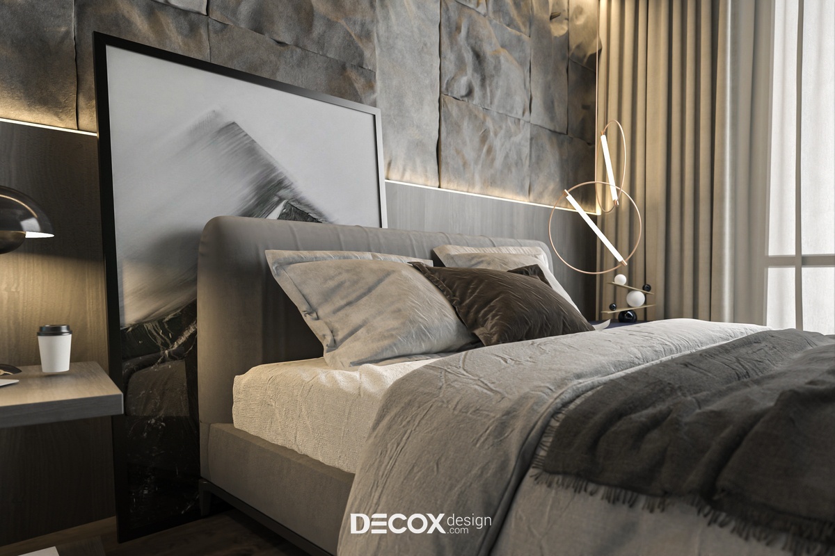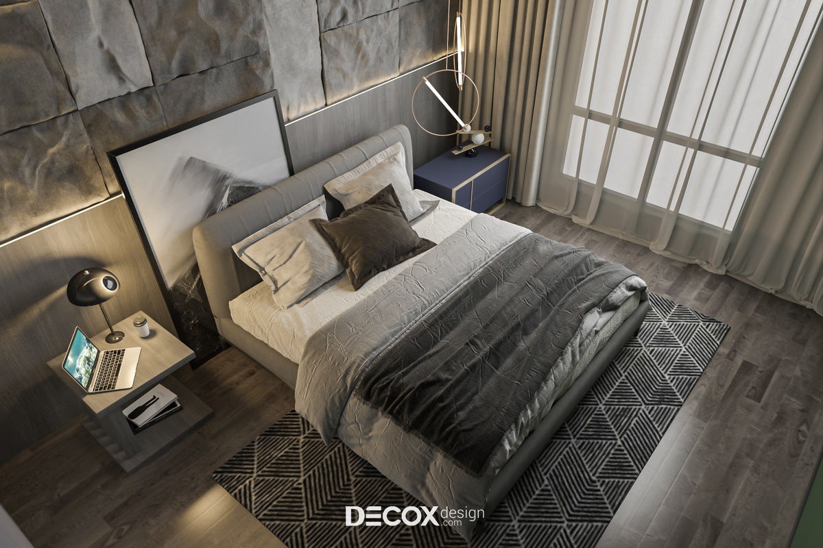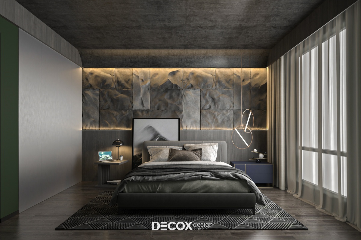 Nếu những không gian trên mang thiên hướng hiện đại, sang trọng thì phòng ngủ phụ trong dự án thiết kế nội thất chung cư này lại mang sắc thái riêng biệt, trái ngược. Ở không gian phòng ngủ này, bạn có thể cảm nhận được sự phá cách ấn tượng nhờ chất liệu thô ráp, mạnh mẽ đến từ tự nhiên. Do sử dụng phần lớn các chất liệu thô cứng như đá, bê tông nên không gian phòng ngủ có phần tối do đó thiết kế cửa sổ kính lớn là cách cân bằng lại không gian.