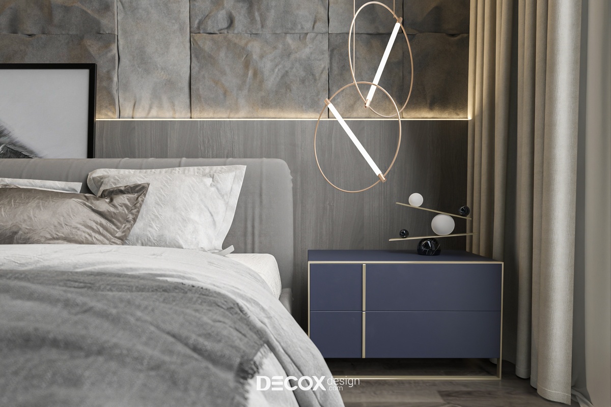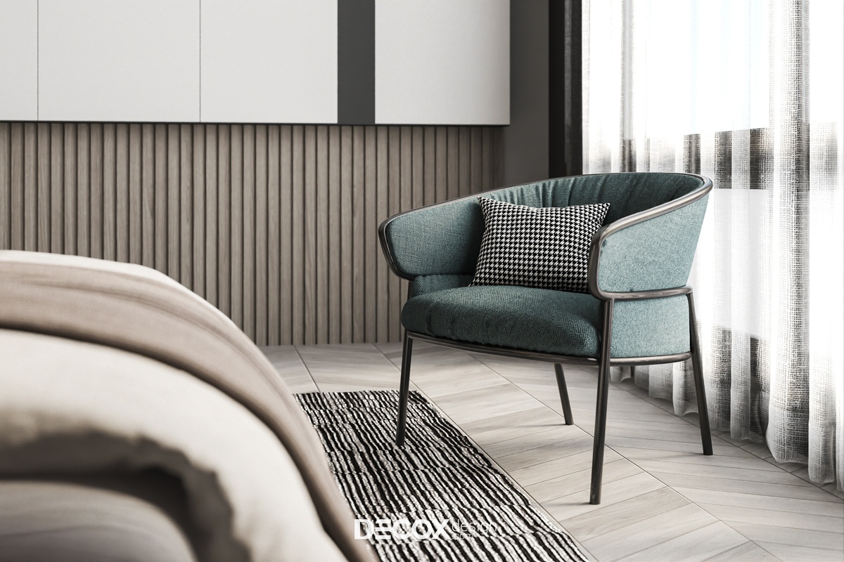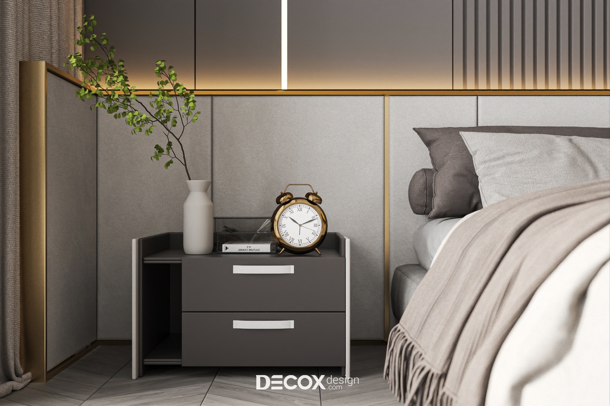 Phòng ngủ master mang lại cảm giác thanh lịch, tinh tế với tone màu trung tính chủ đạo. Tuy mang bản chất phong cách hiện đại nhưng cách bố trí nội thất trong phòng mang thiên hướng tối giản nhiều hơn. Việc sắp xếp nội thất "vừa đủ" như thế này không chỉ tiết kiệm diện tích, tối ưu hóa không gian mà còn giúp gia chủ tập trung hơn vào việc nghỉ ngơi, thư giãn.
