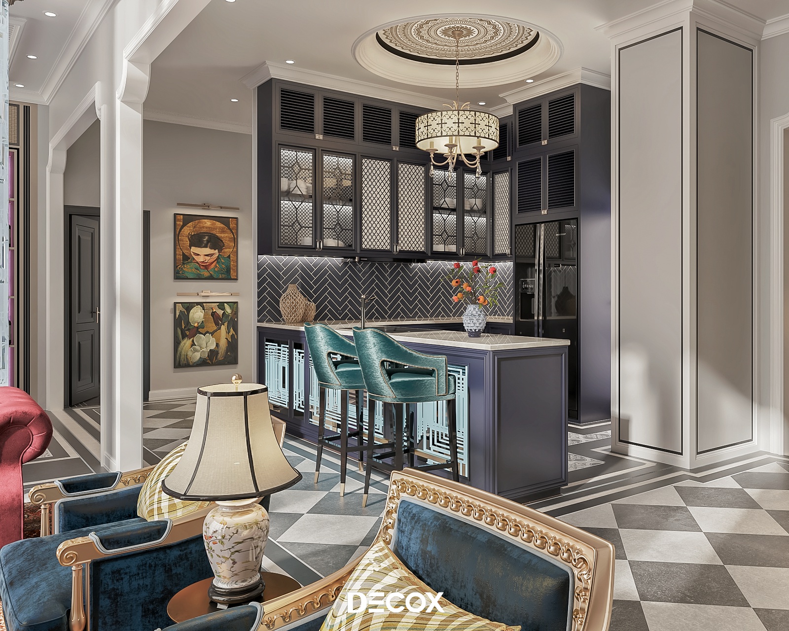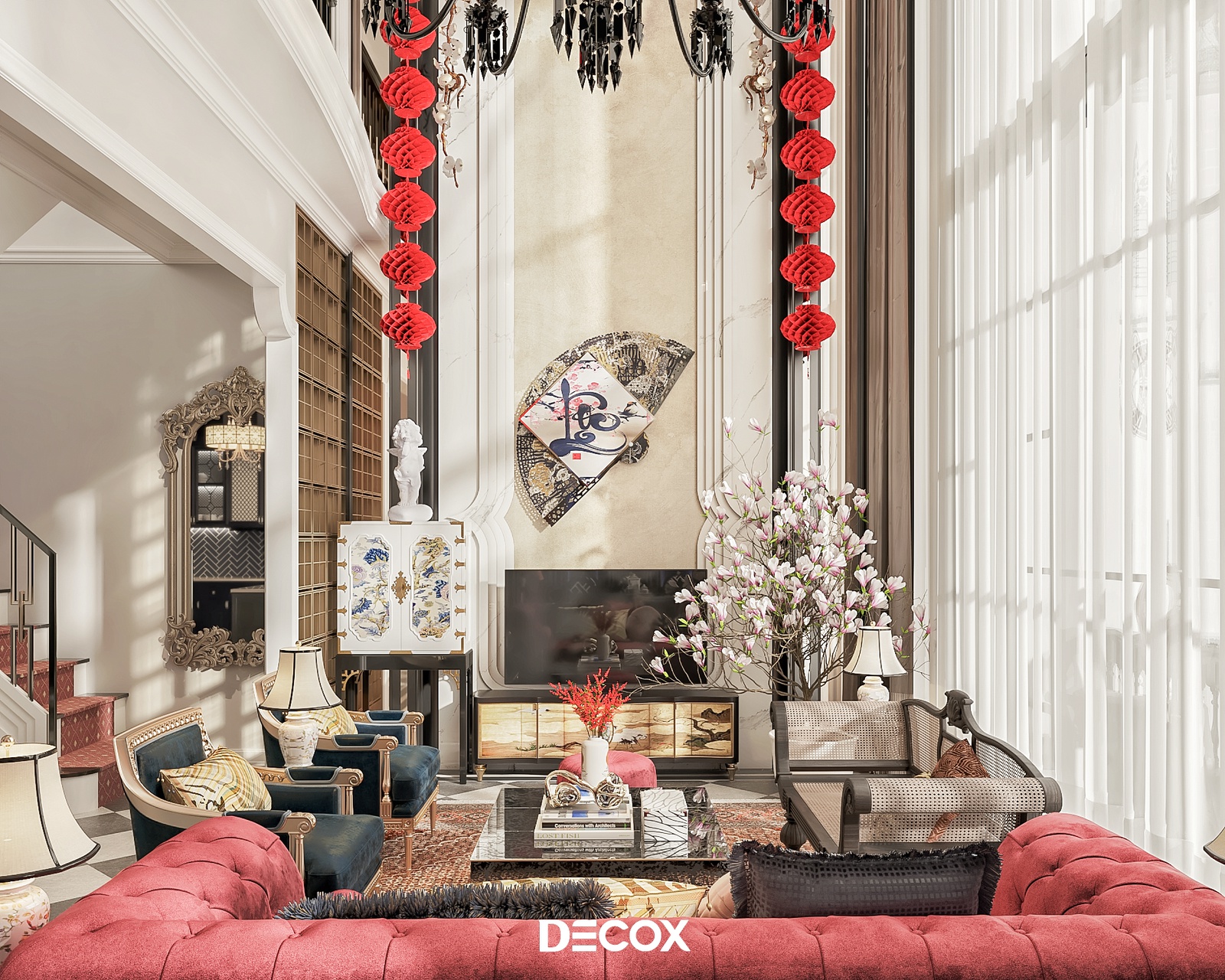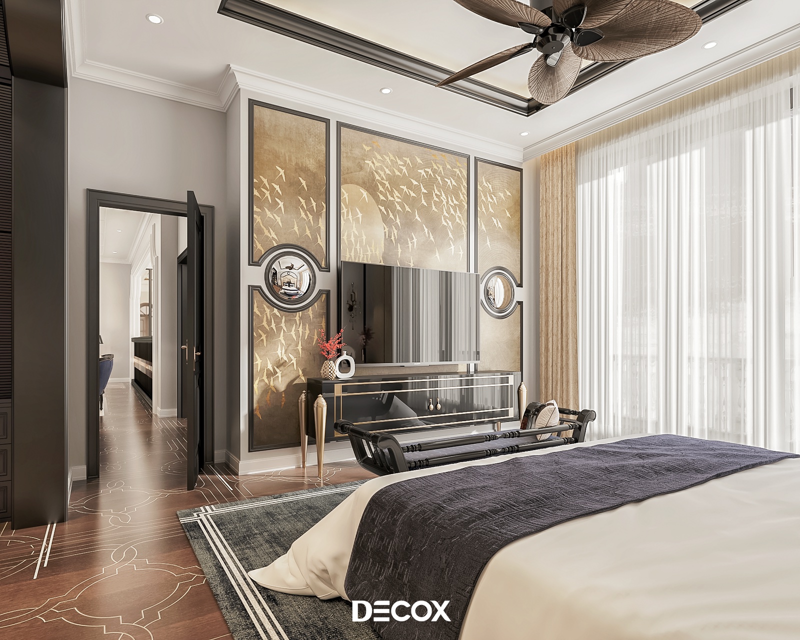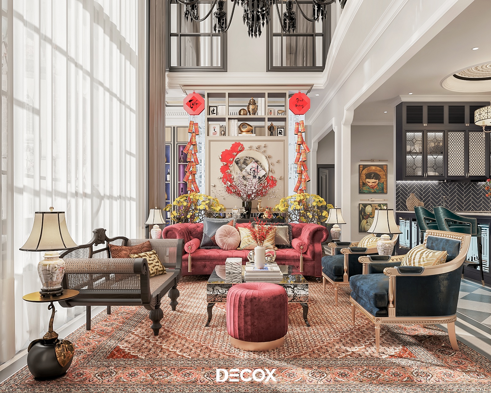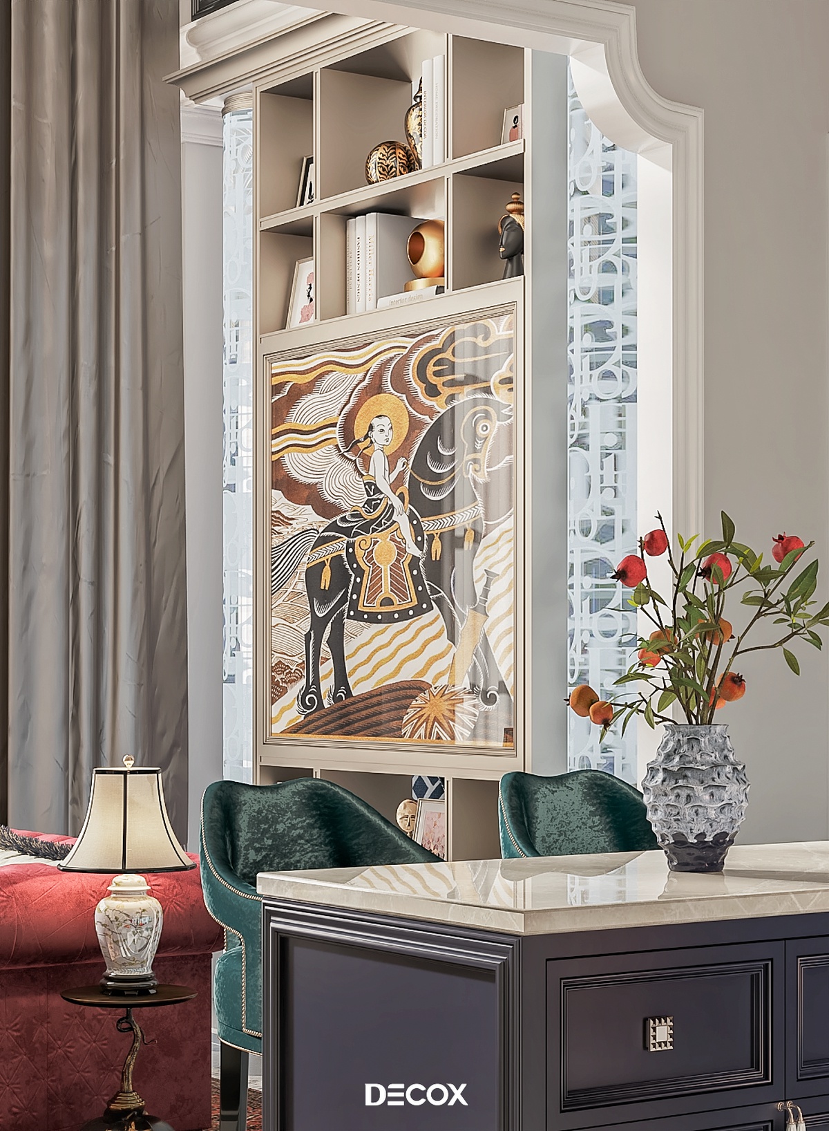Văn hóa Việt được ví von như một cô gái đẹp, với góc nhìn đó KTS của Decox Design đã giữ nguyên dáng dấp Á Đông thông qua những đường nét đặc tả, chi tiết đặc trưng như tranh sơn dầu, sắc màu nhiệt đới, bình phong trang trí, biểu tượng chim hạc mang ý nghĩa may mắn, tốt lành. Đồng thời làm nên diện mạo mới cho văn hóa truyền thống cùng dòng chảy tân cổ điển sang trọng, vương giả. Đó như một chiếc áo mới mà cô gái khoác lên, vừa mới mẻ nhưng không phai mờ đi bản chất ban đầu.